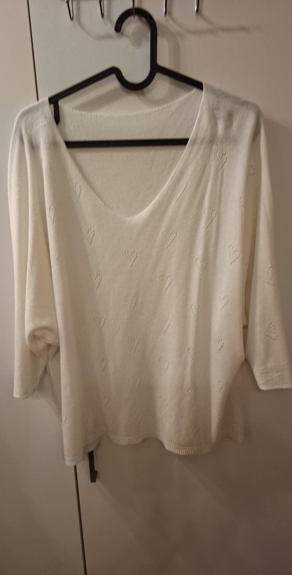 Sweterek biały, rękaw 3/4 , wytłoczone serduszka po całości , 65% modal, 45% akryl, rozmiar od L do XL ( biust 120 cm , długość 58 cm ) Kolekcja włoska .