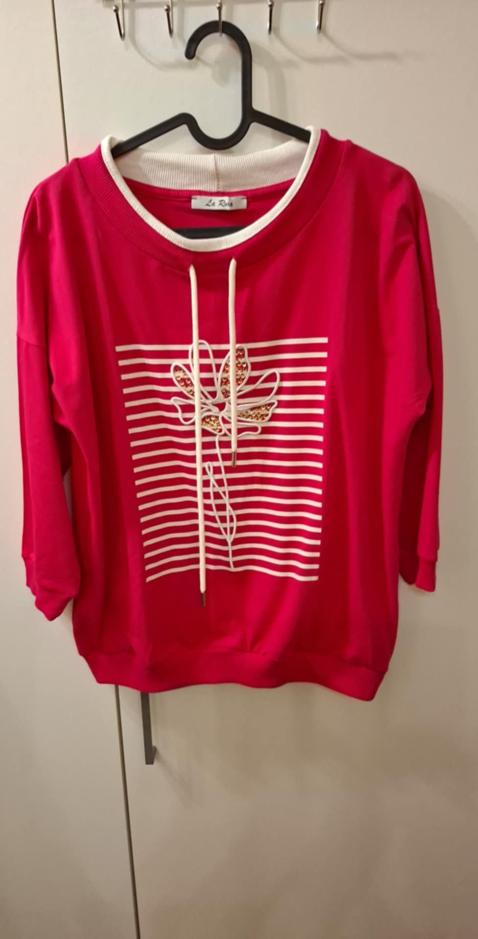 Bluza firmy La Rosa w kolorze fuksja , rękaw 3/4 na ściągaczu i dół na ściągaczu , na przodzie bluzy kwiat z cyrkoniami , dekolt zaciągany białym troczkiem .