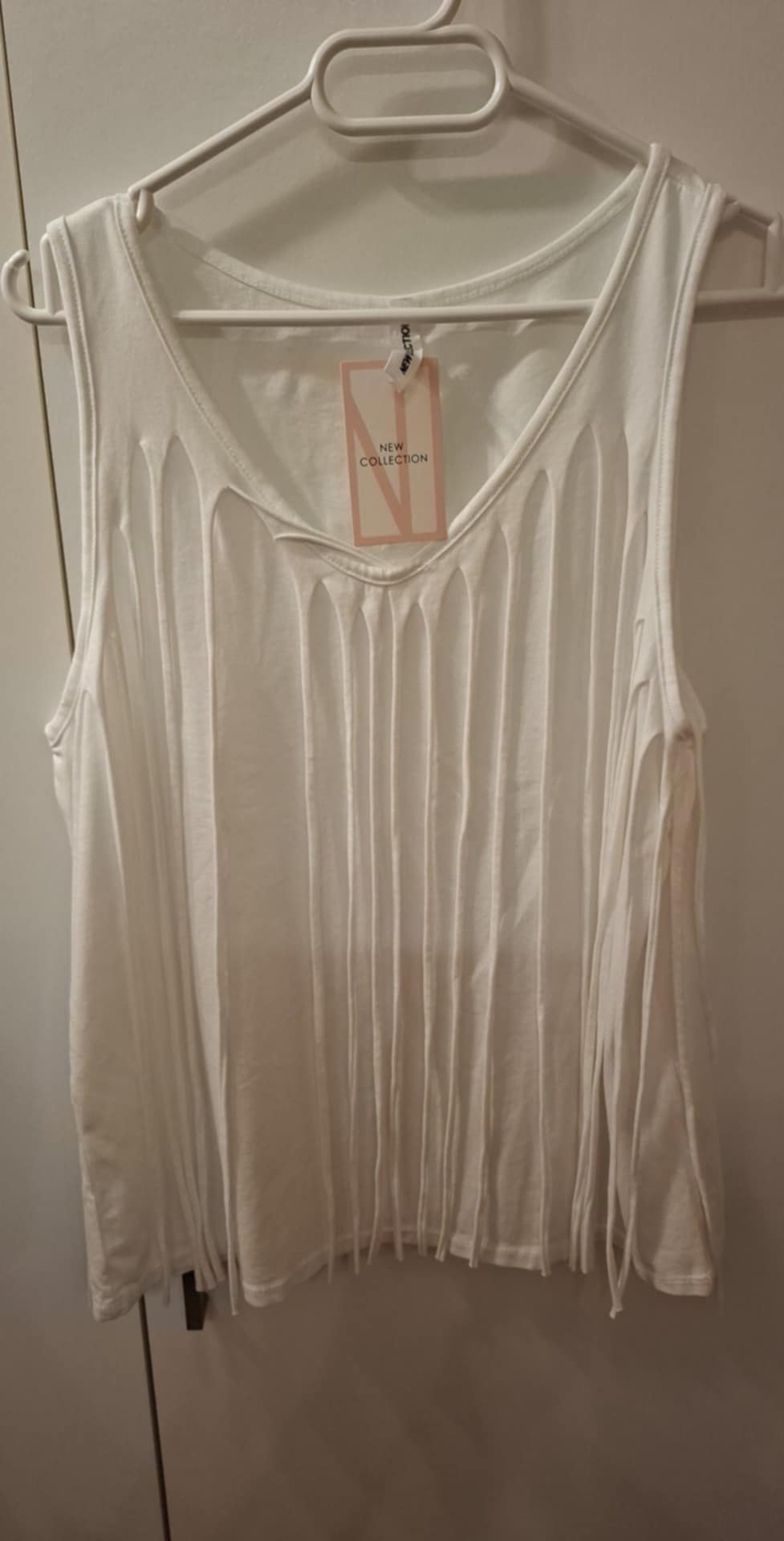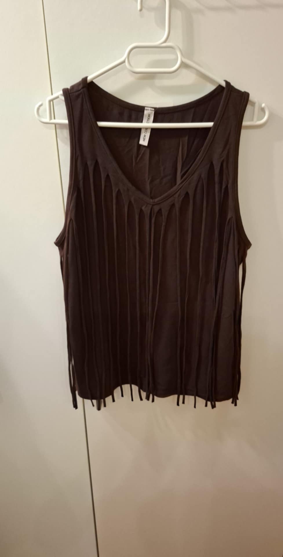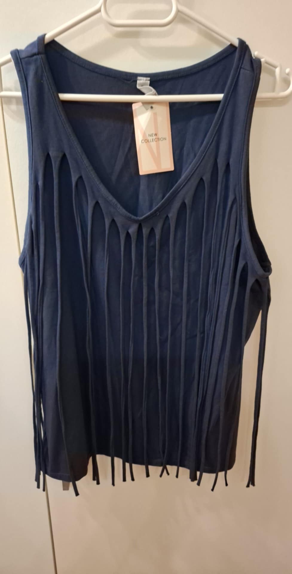 Bluzeczka na szerszych ramiączkach , z tyłu gładka , z przodu zdobiona frędzlami . 100% bawełna . Rozmiar uniwersalny : biust do 100 cm , długość 64 cm .