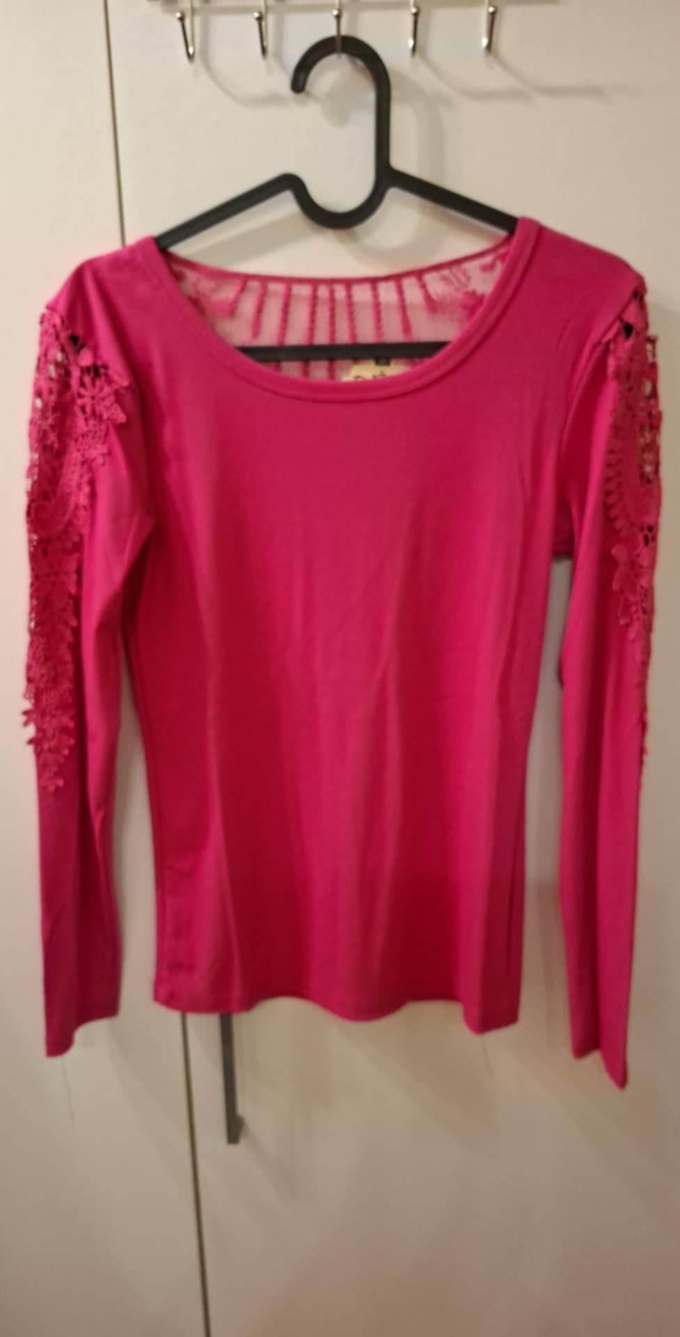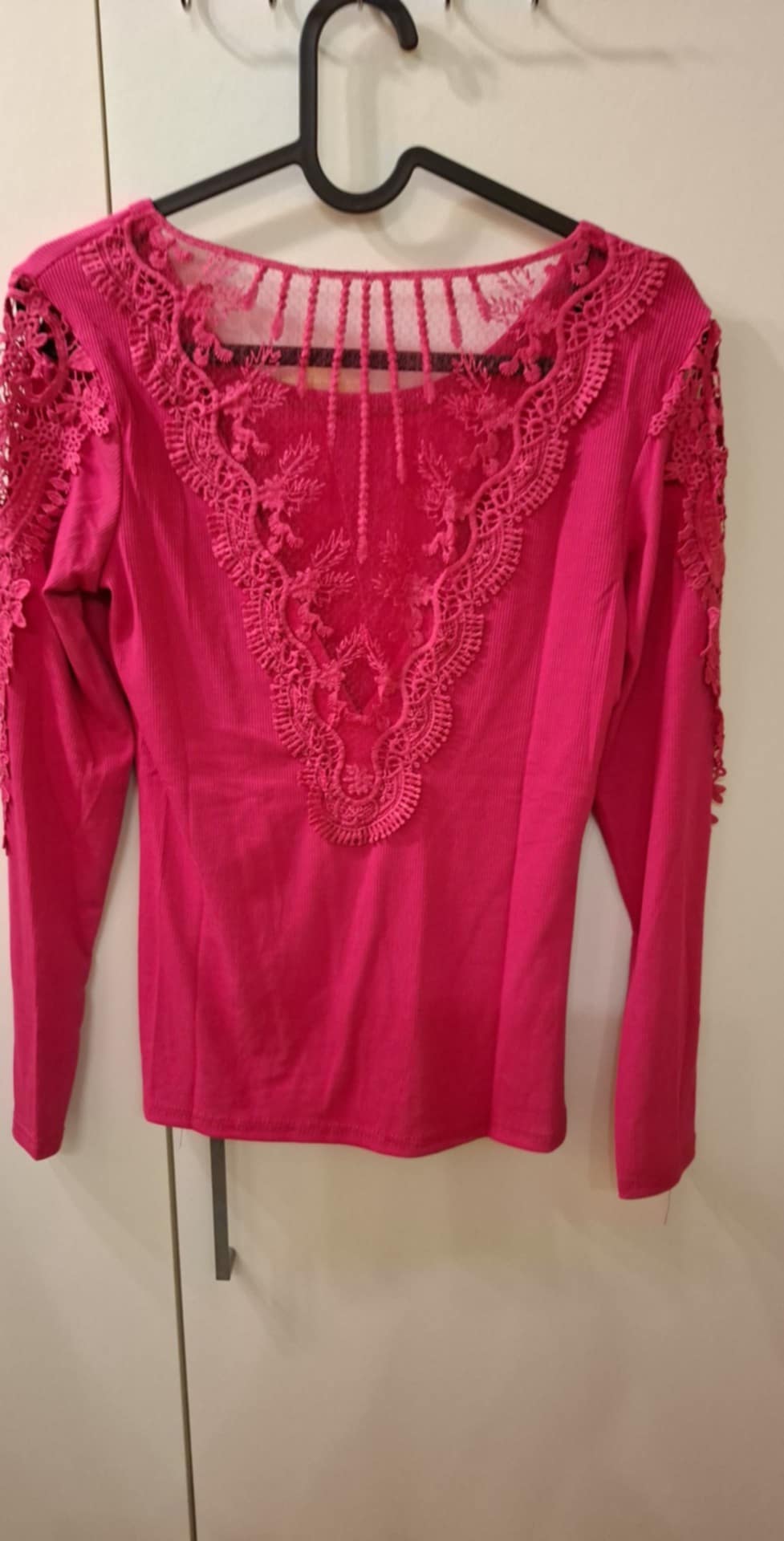 Bluzka w kolorze fuksja , rękaw haft, tył bluzki na koronce haft , 65% bawełna, 35% poliester. Rozmiar S/M