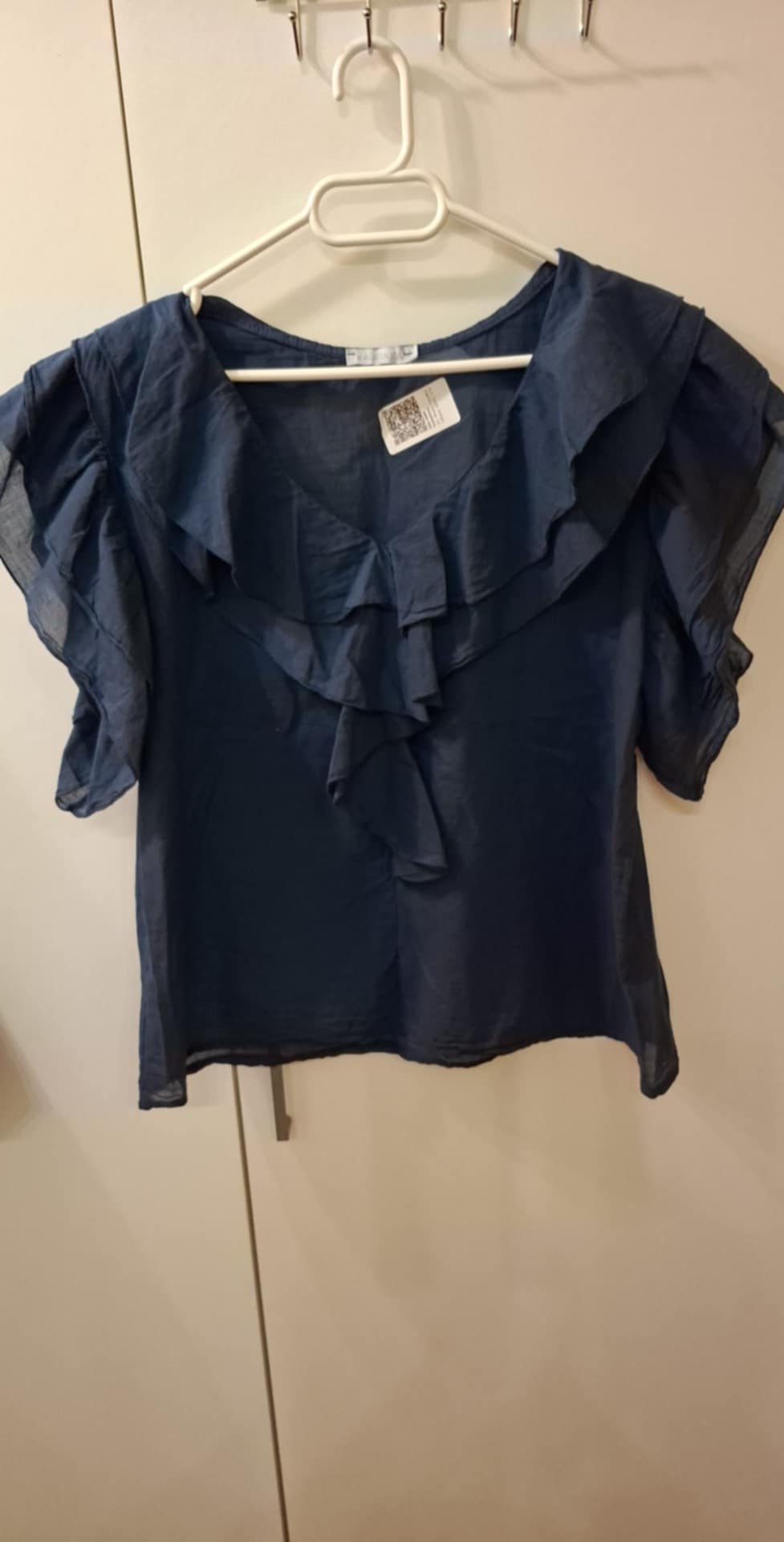 Bluzka 100% bawełna  z krótkim rękawem . Falbanki w kształcie żabociku – zapinana na guziki , na rękawku podwójna falbanka . Kolekcja włoska . Rozmiar Uniwersalny od M do XL . Biust do 116 cm , długość 62 cm