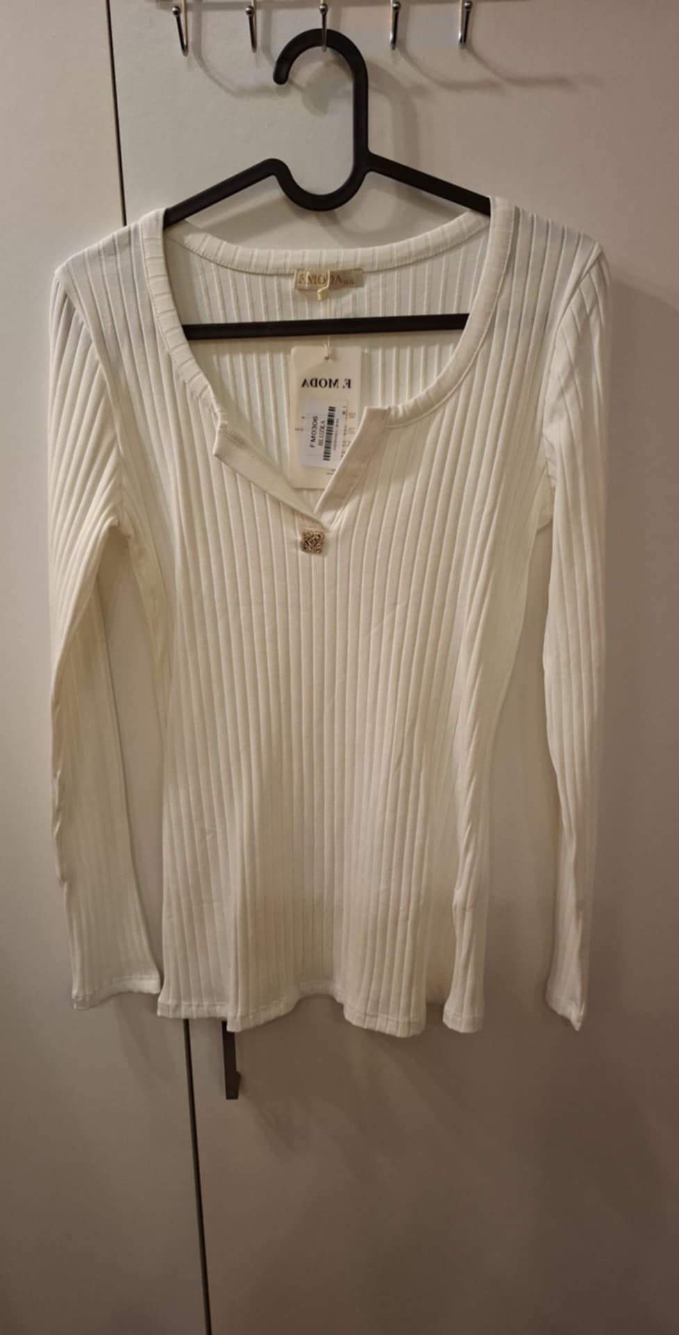 Bluzka biała , dekolt V zakończony złotą cyrkonią , materiał prążek , 95 % bawełna 5% elastan. Rozmiar M/L