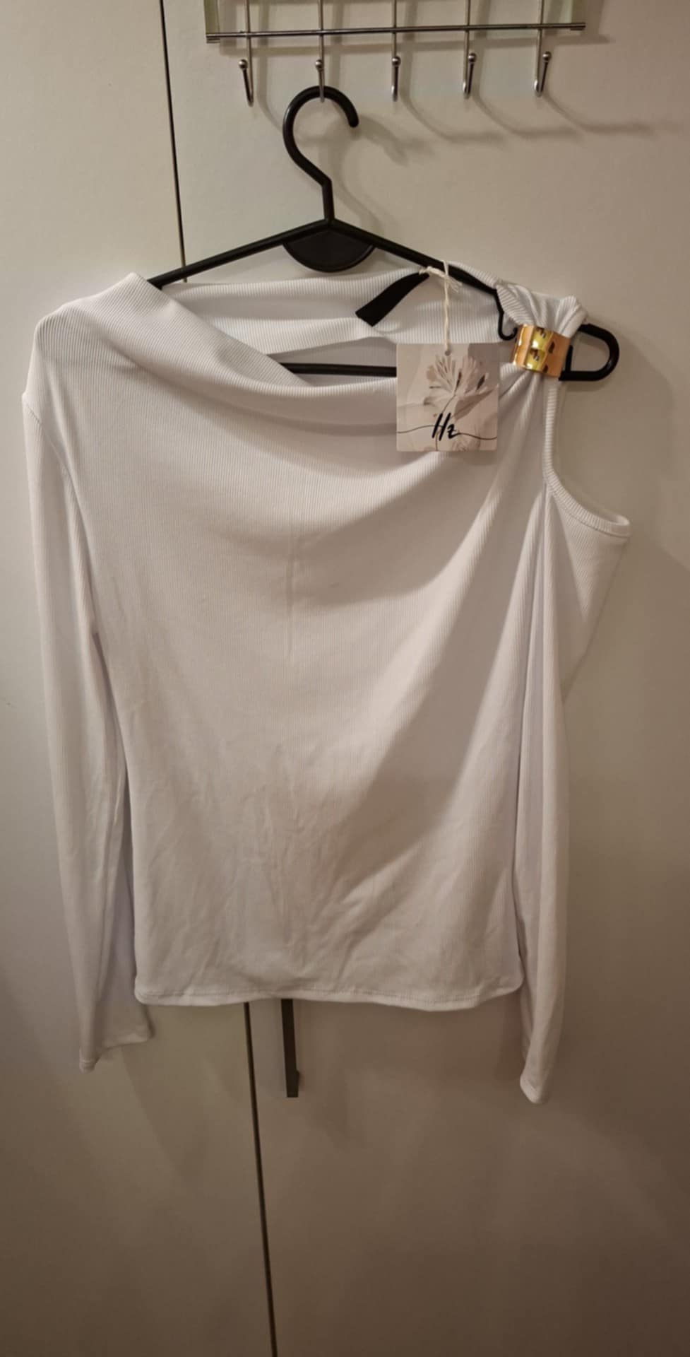 Bluzka w kolorze białym , prążkowana , dekolt do ułożenia , bok rękawa zebrany w złotą klamrę , jedno ramię odkryte , biust 82-100 cm , długość 61 cm