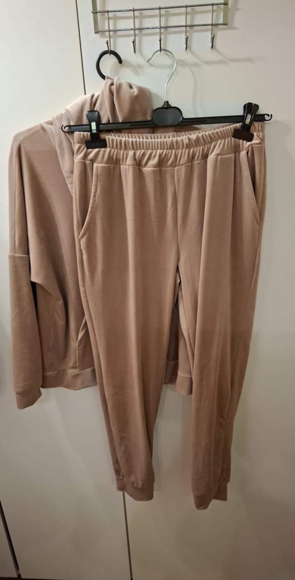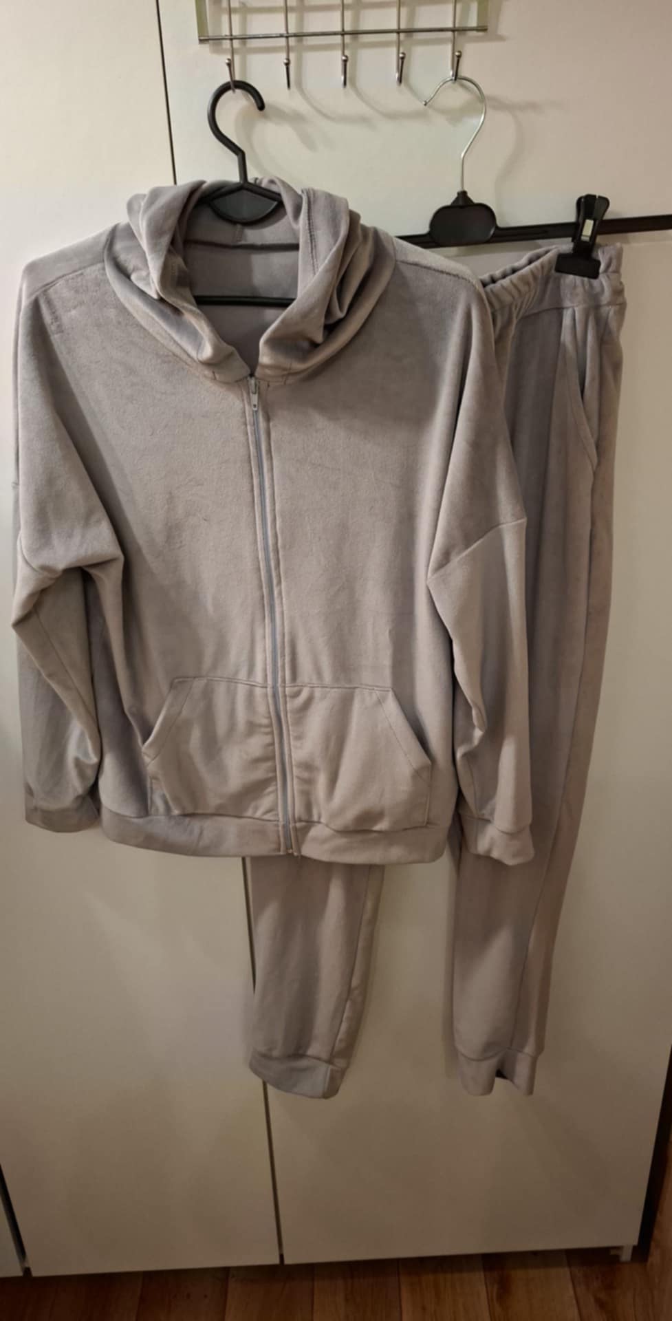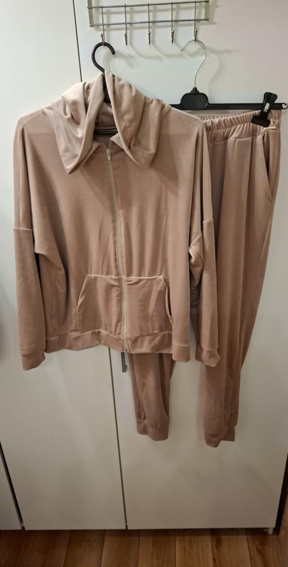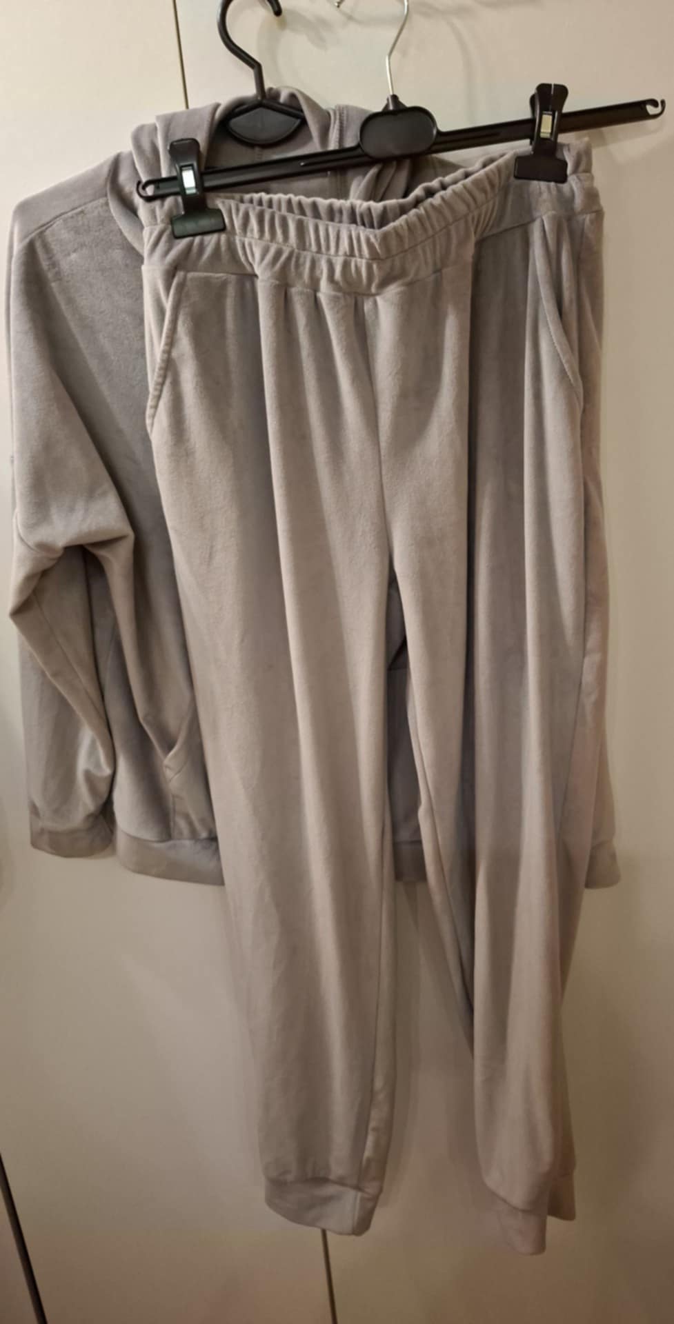 Dres welurowy zapinany na zamek , spodnie na gumie z kieszeniami , bluza z kieszeniami . 95% wiskoza, 5% elastan . Góra : biust 74-104 cm , długość 60 cm , Spodnie: 74-104 pas , biodra 120-130 cm , długość 93 cm