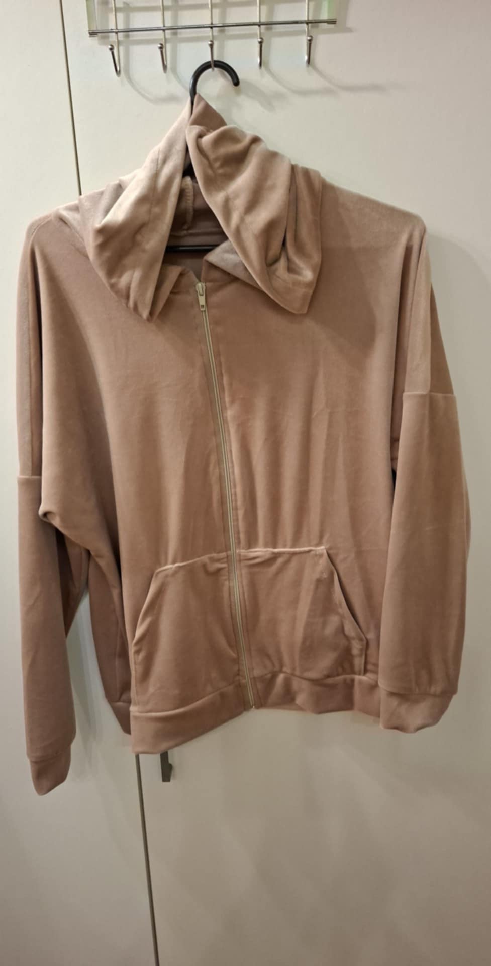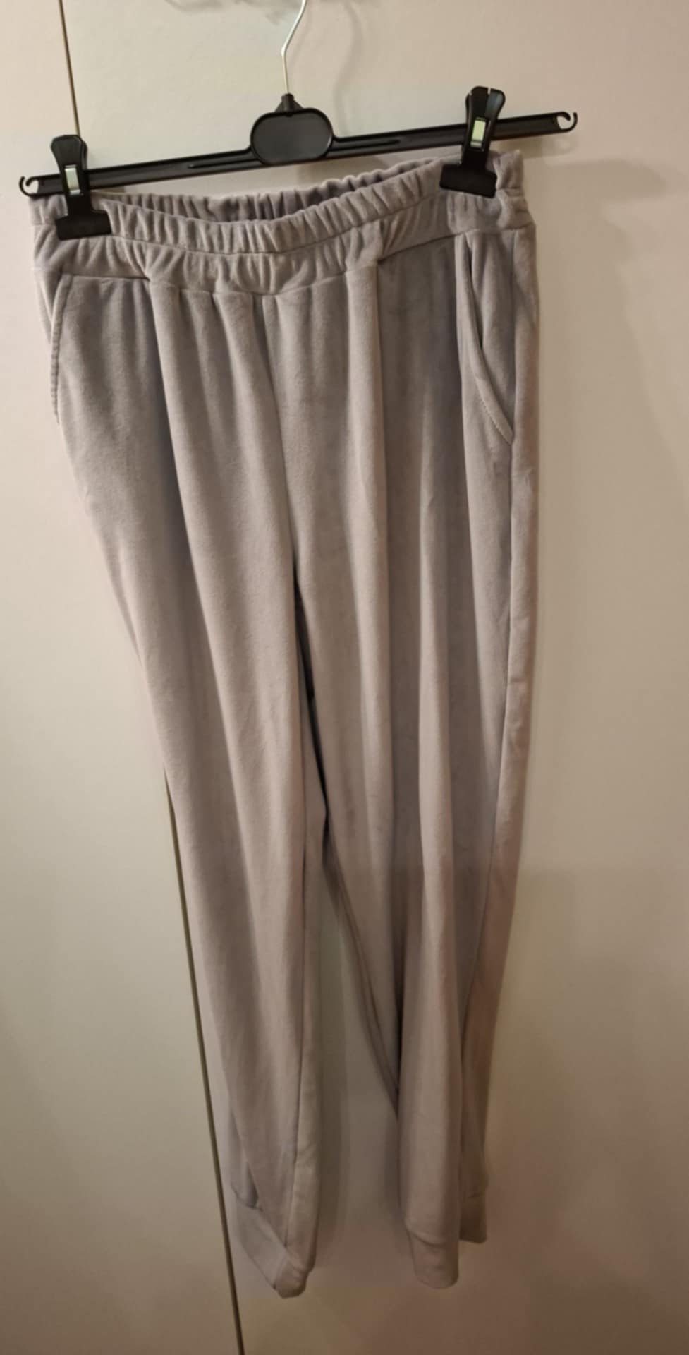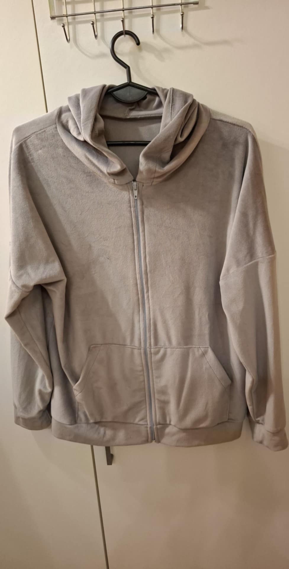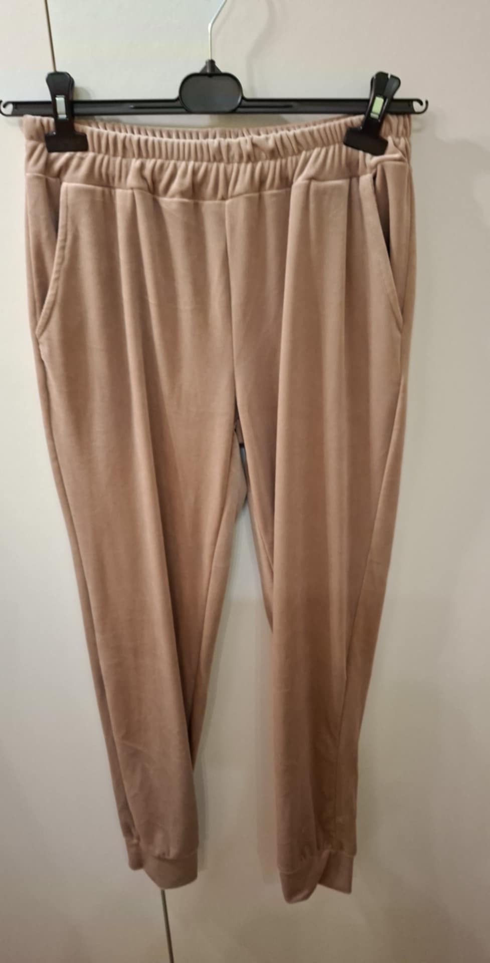 Dres welurowy zapinany na zamek , spodnie na gumie z kieszeniami , bluza z kieszeniami . 95% wiskoza, 5% elastan . Góra : biust 74-104 cm , długość 60 cm , Spodnie: 74-104 pas , biodra 120-130 cm , długość 93 cm
