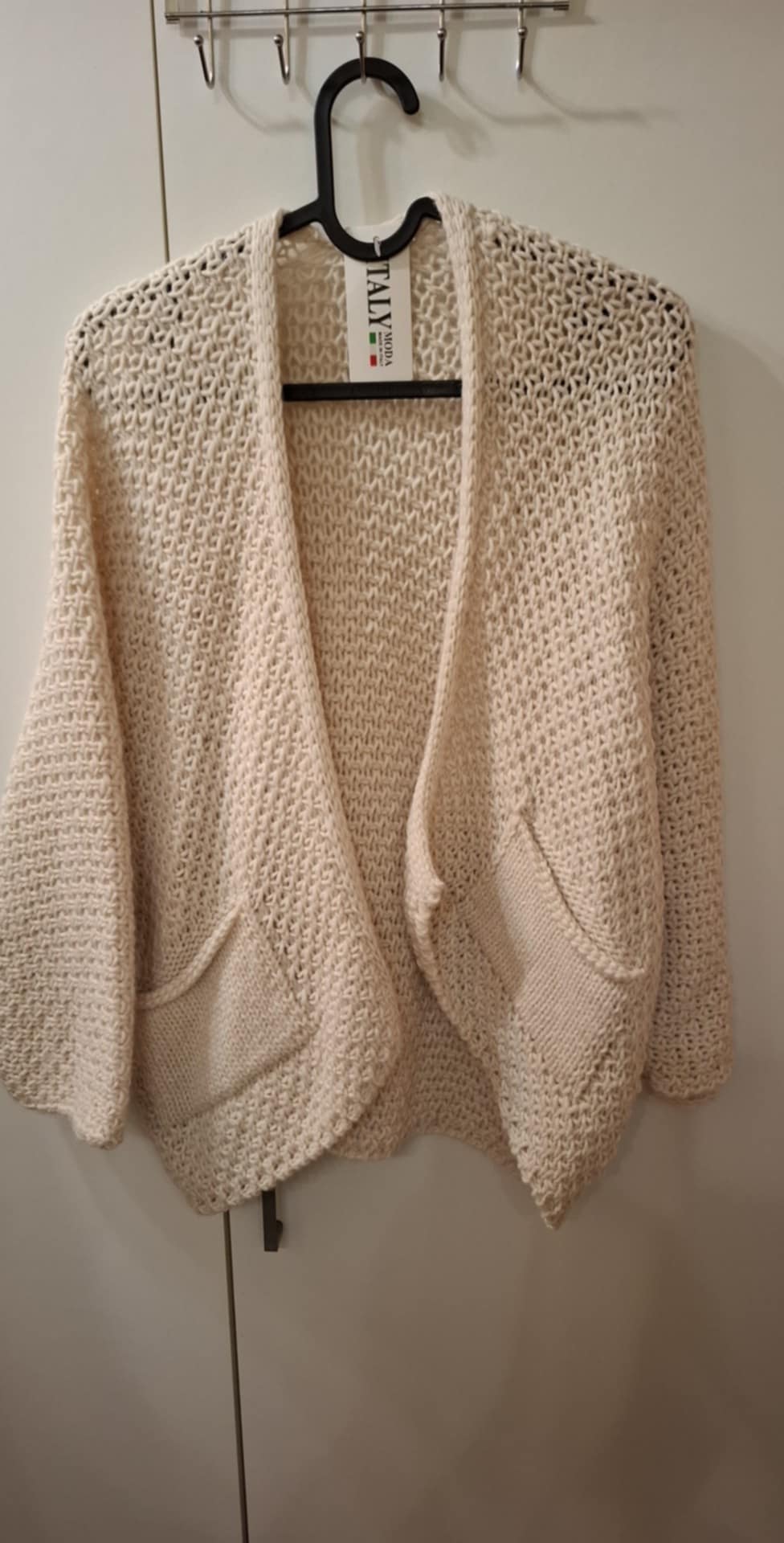 Kardigan krótki beżowy z kieszeniami , tył dłuższy , 75% akryl, 15% poliester, 10% wełna . Kolekcja Włochy