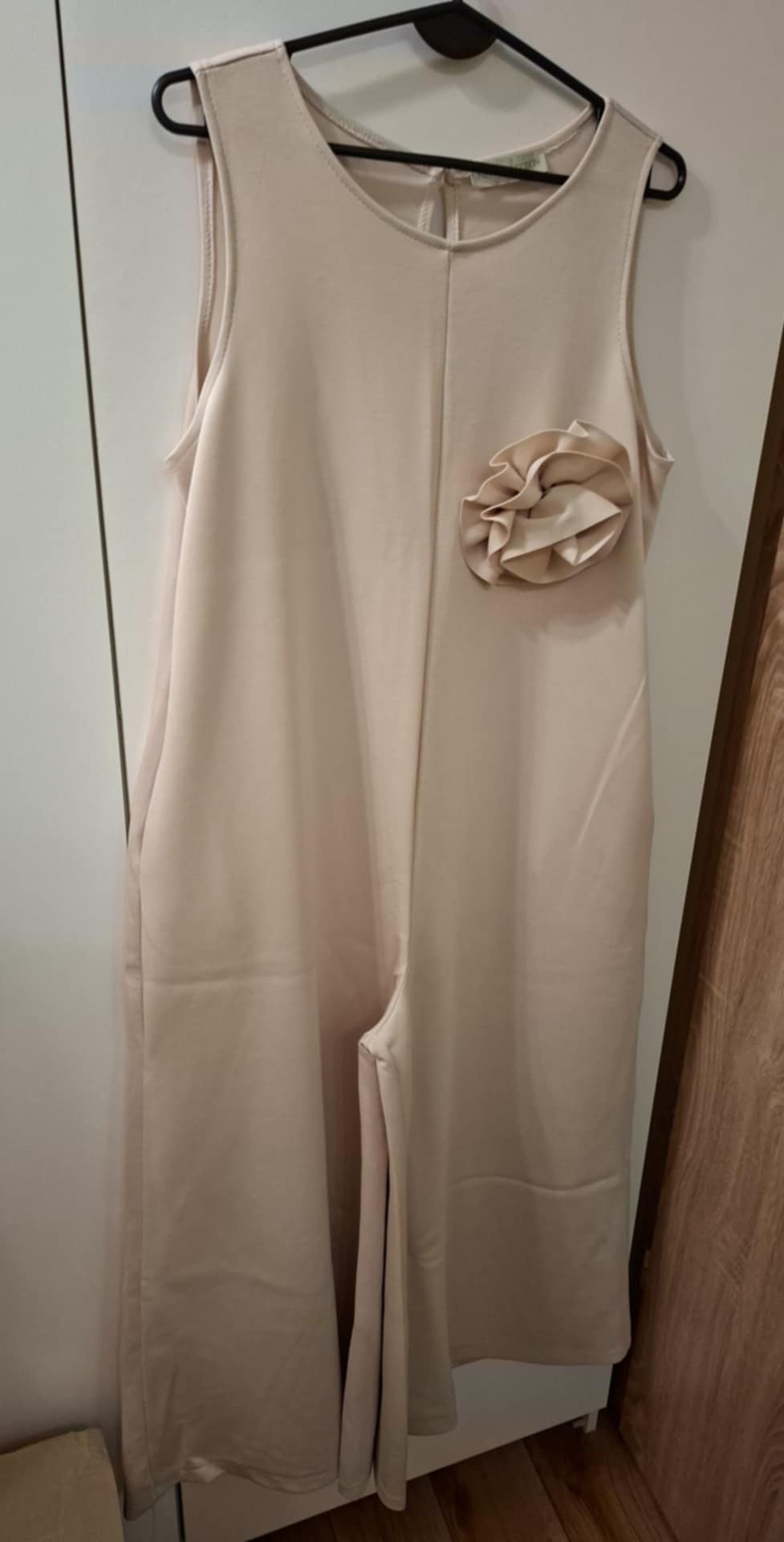 Kombinezon broszka kwiat ( można odpiąć) Materiał masełko 50% poliester, 45% wiskoza, 5% elastan . Szeroka nogawka , pasek żmijka ( rozciąga się jak sprężynka ) w komplecie.                                                      Rozmiar : biust 102 cm , biodra 128 cm , długość 134 cm