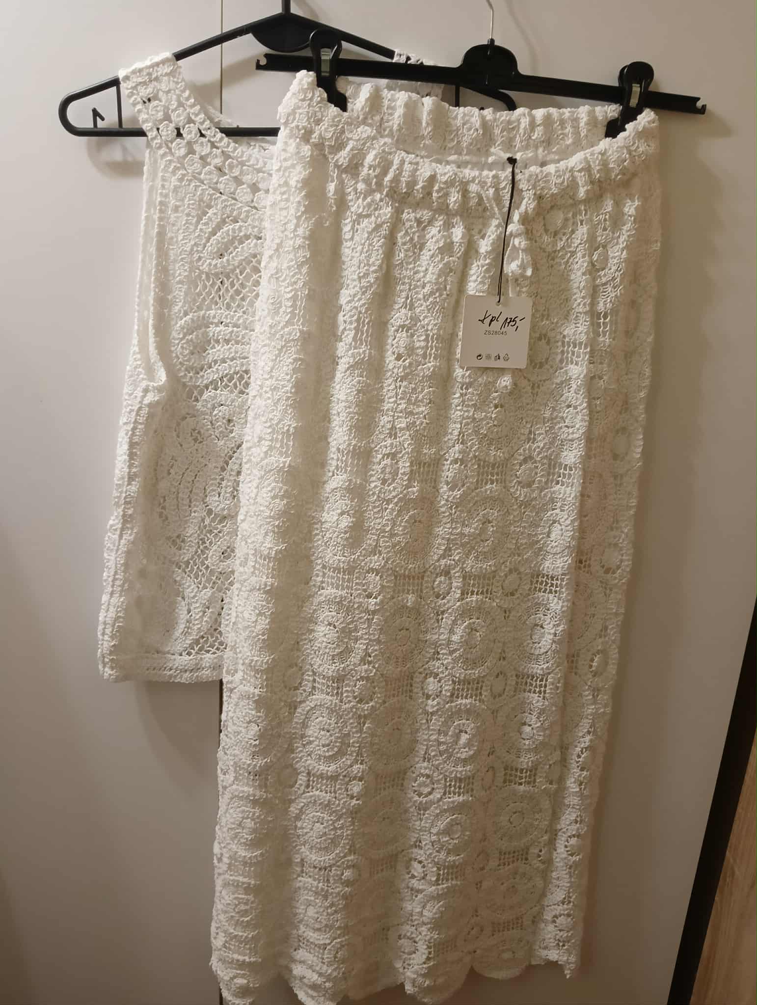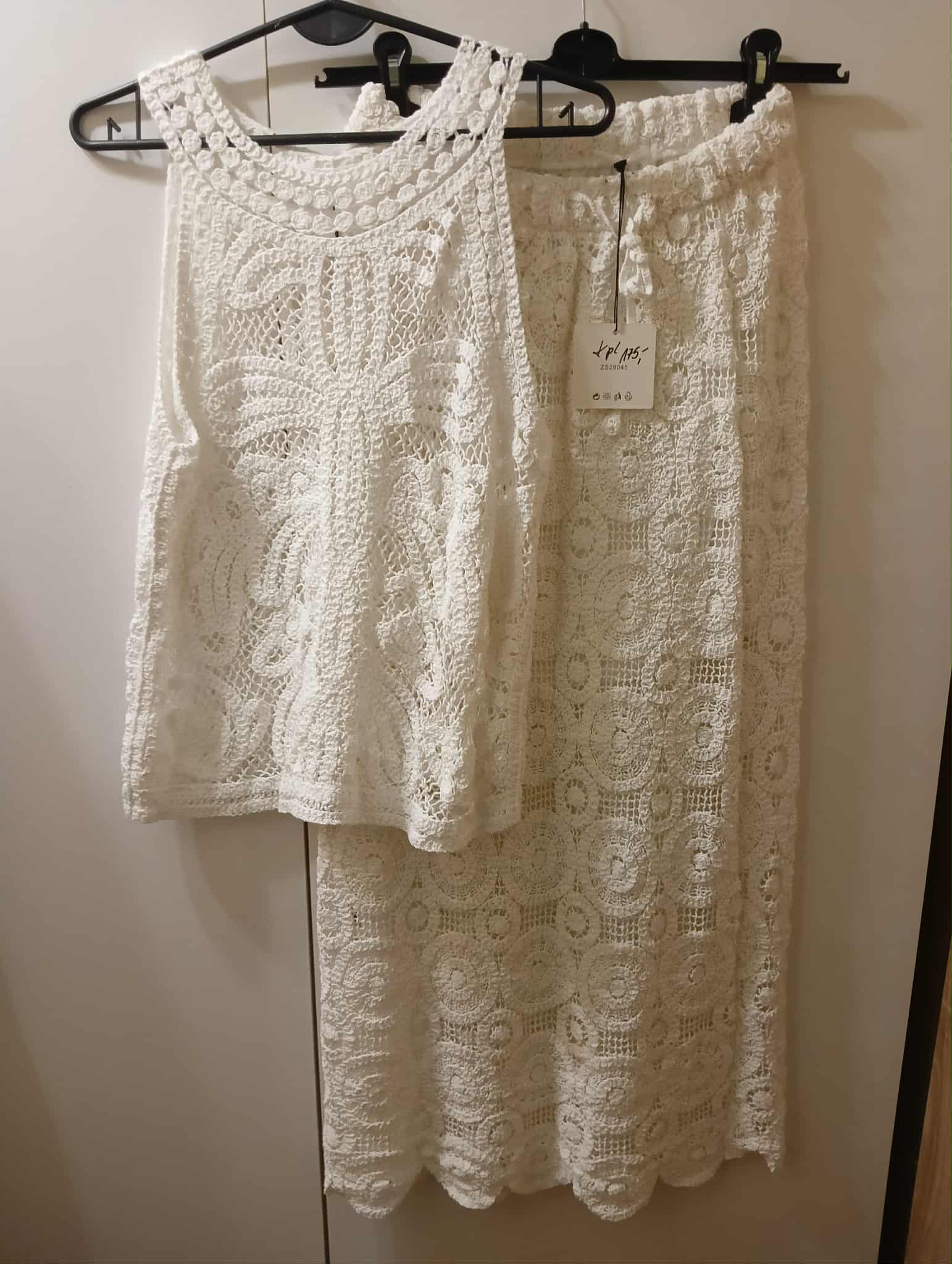 Komplet ażurowy : spódnica na gumie ( w pasie 68-100 cm , długość 88 cm)  , zawiązywana troczkiem, na podszewce , bluzka bez rękawów, ślicznie wykończony dekolt , 90% bawełna , 10% wiskoza .