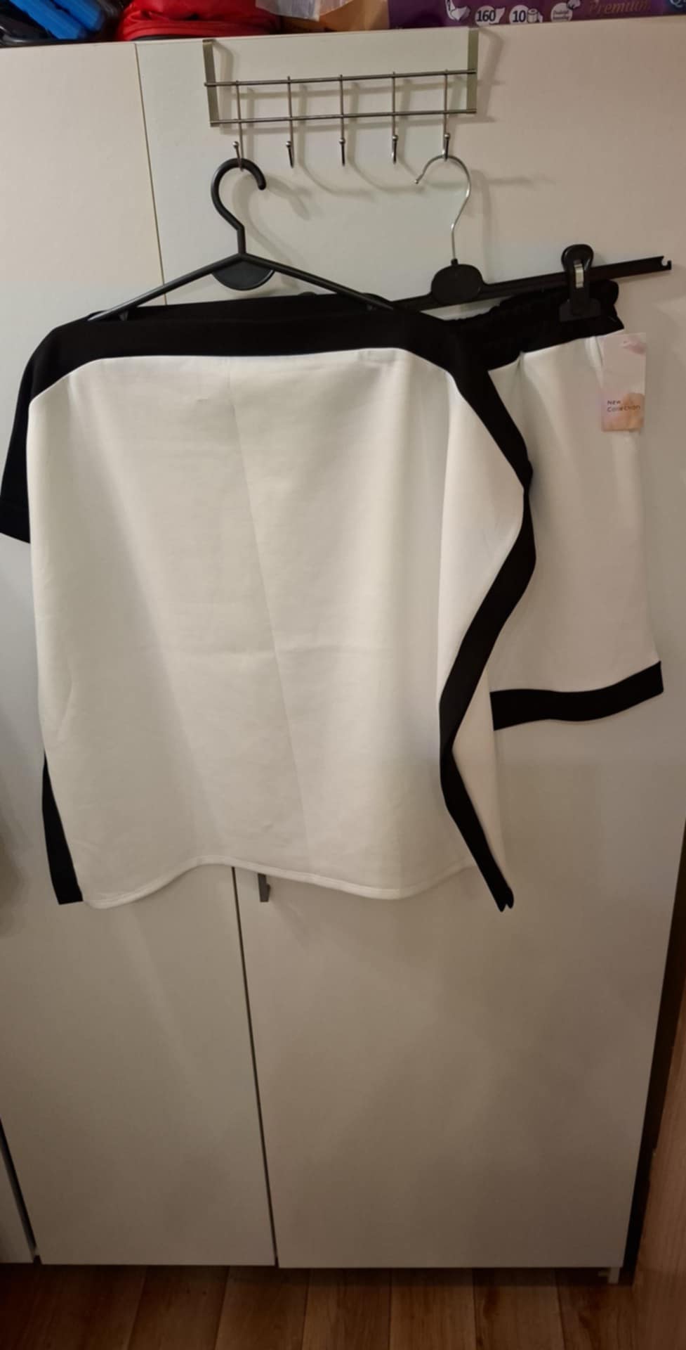 Komplet biały z czarnymi lampasami , opadający rękaw przy bluzeczce, spodenki z kieszeniami . Rozmiar Uniwersalny (M-XL) – biust do 130 cm , długość 62 cm, talia 70-120 cm, biodra 106 cm, nogawka 44 cm