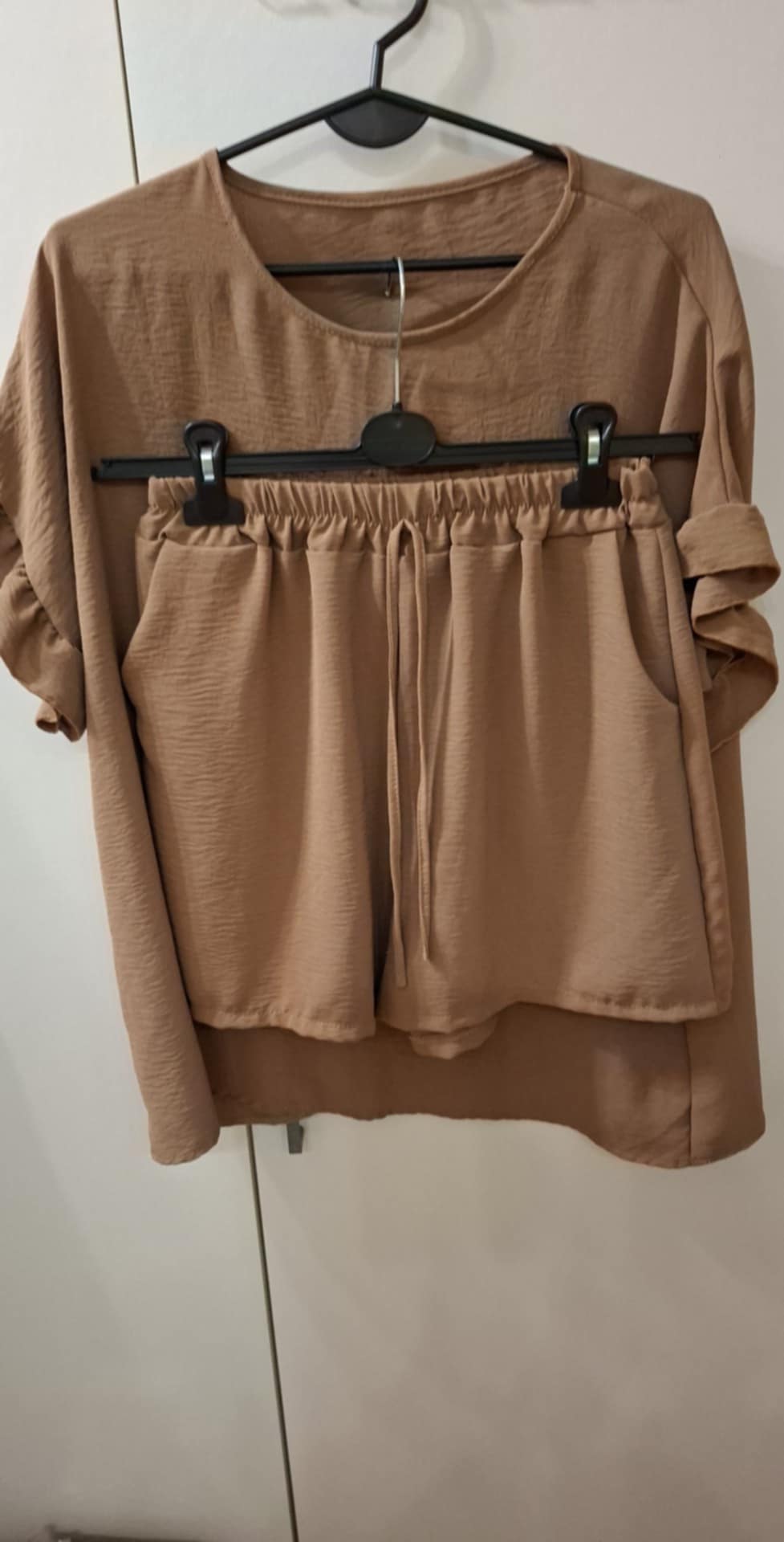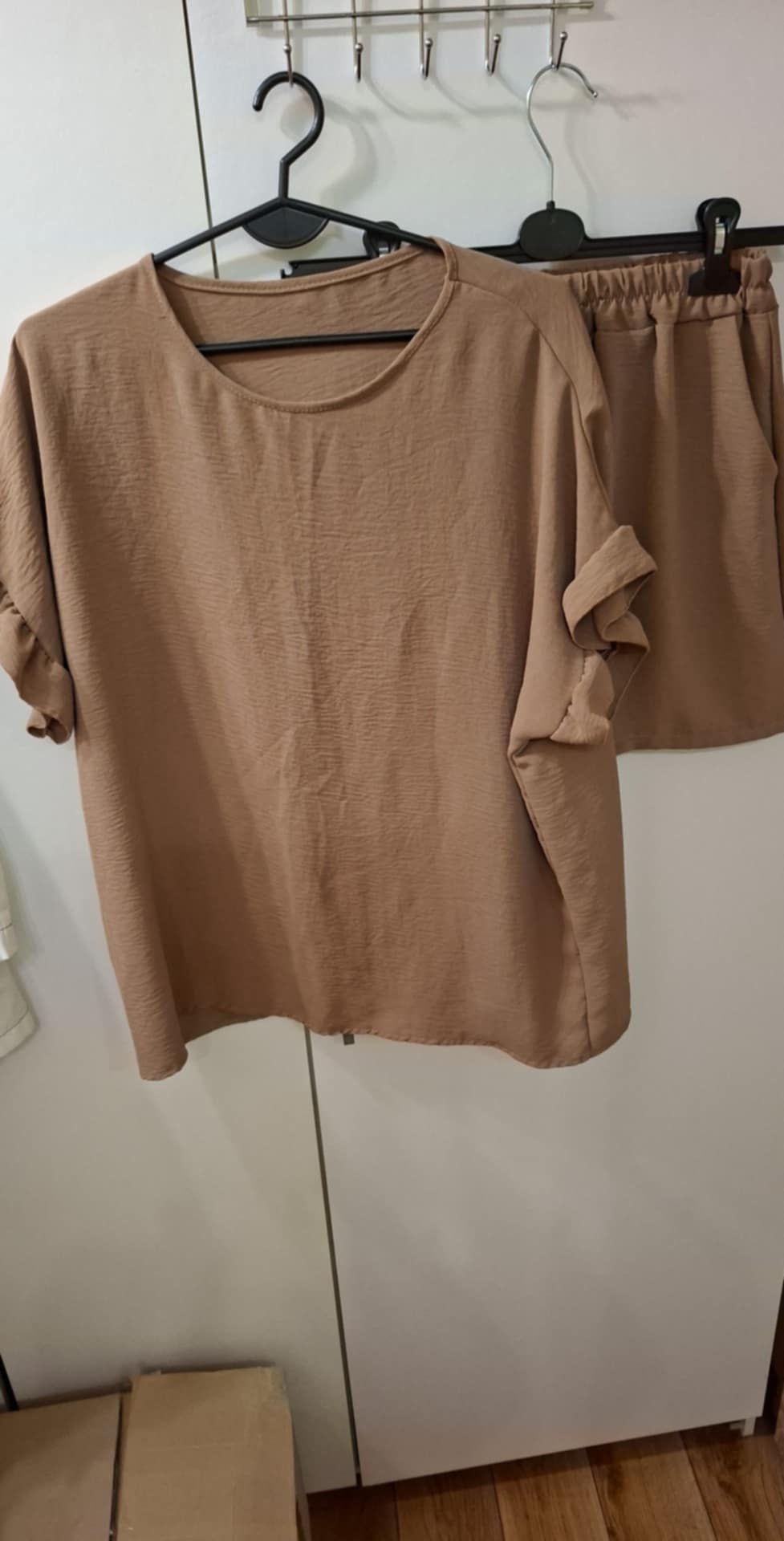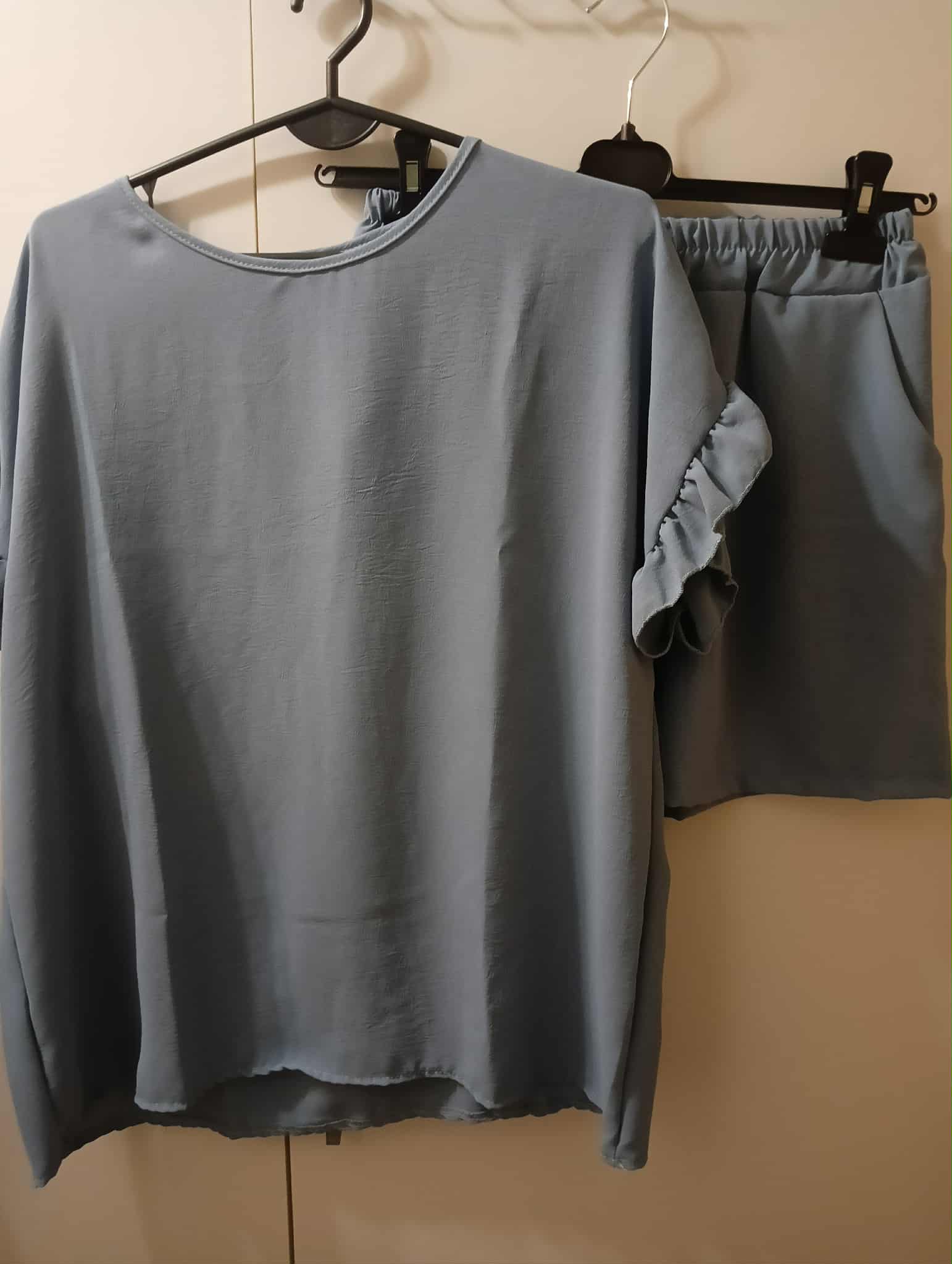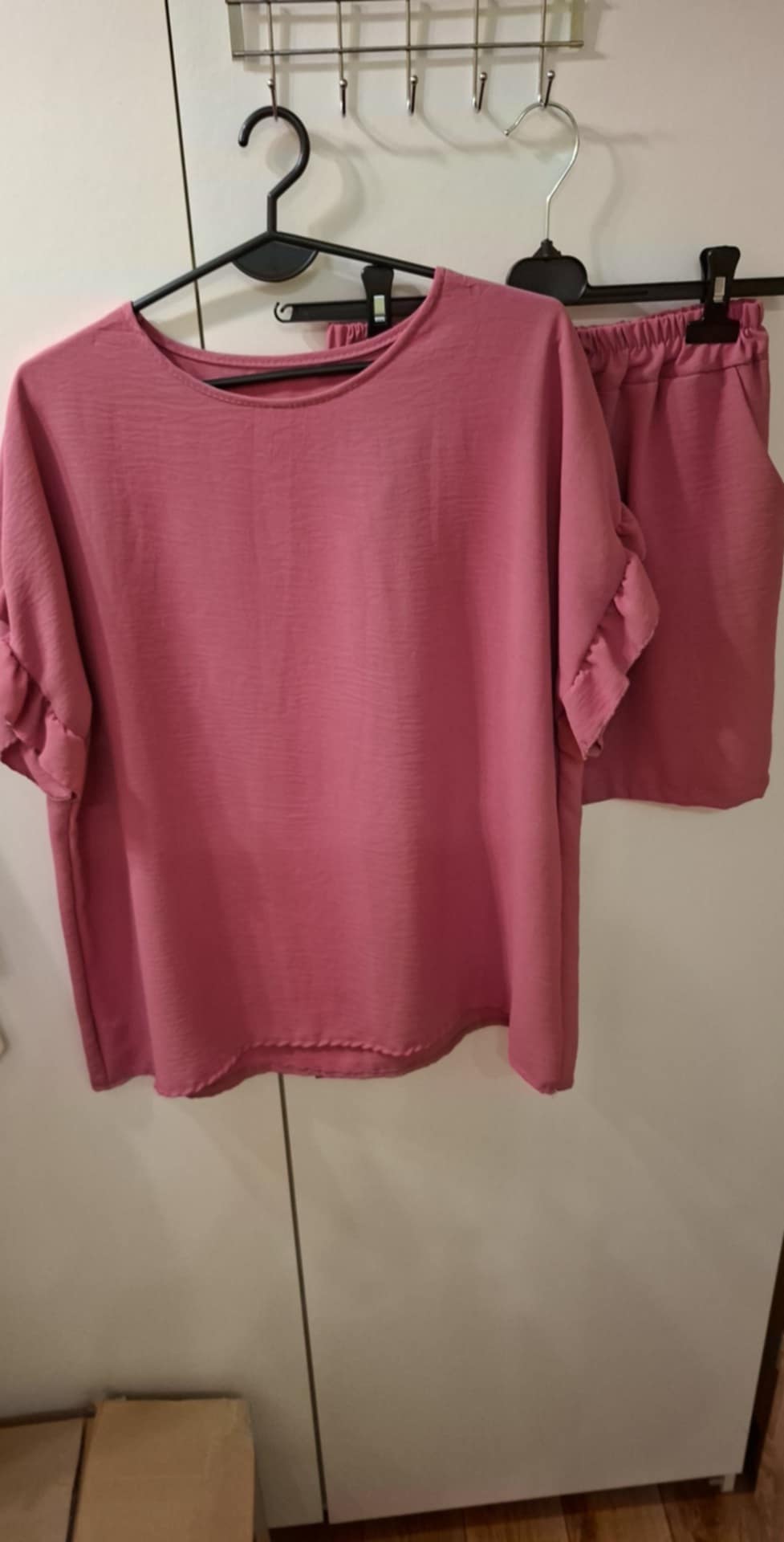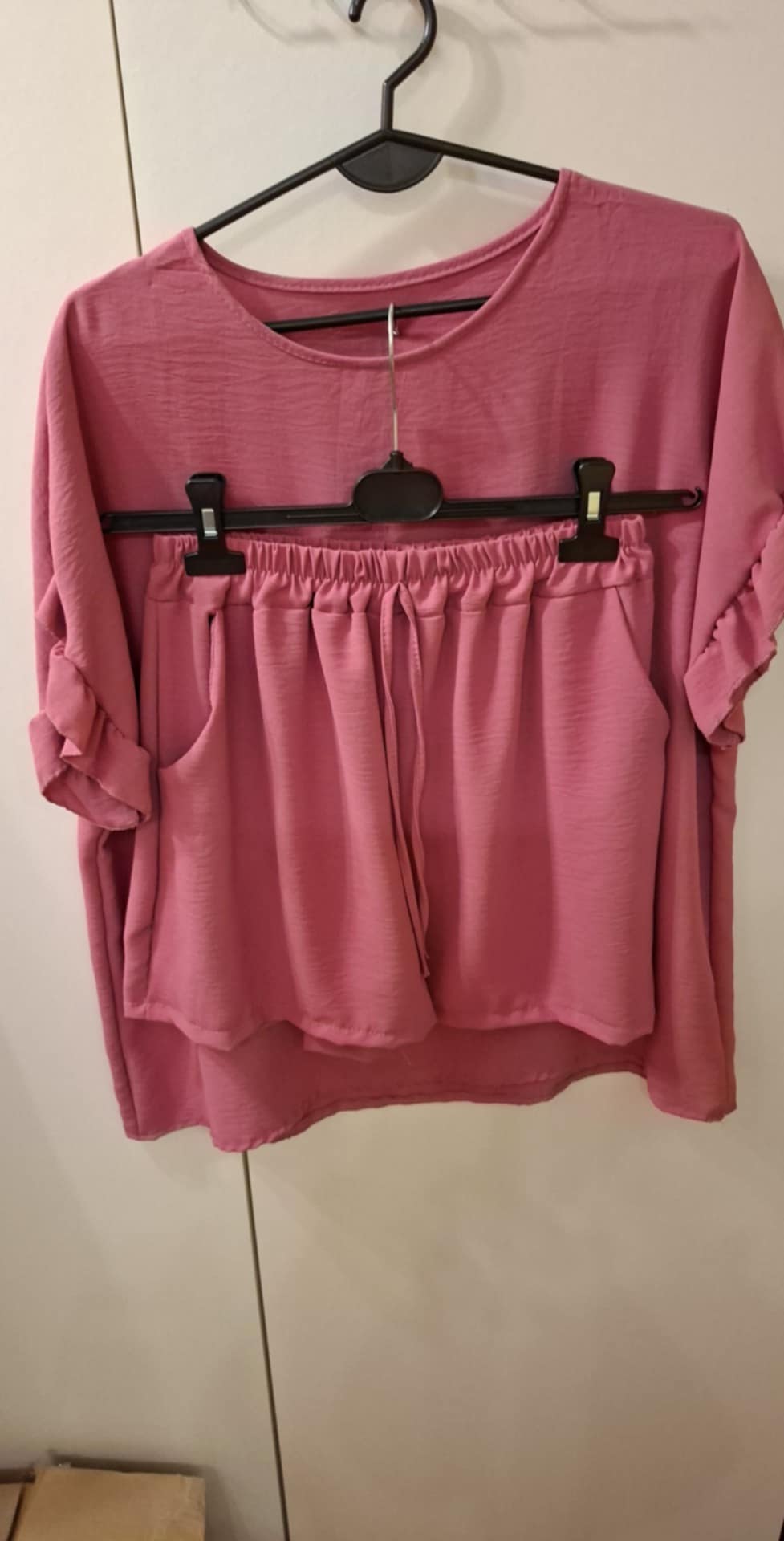 Komplet 100% wiskoza, lekki i zwiewny . W skład wchodzi bluzka z krótkim rękawem, zakończona falbankami ( biust 126 cm, długość 67 cm ) krótkie spodenki z troczkiem ( pas 68-104 cm , długość 39 cm )
