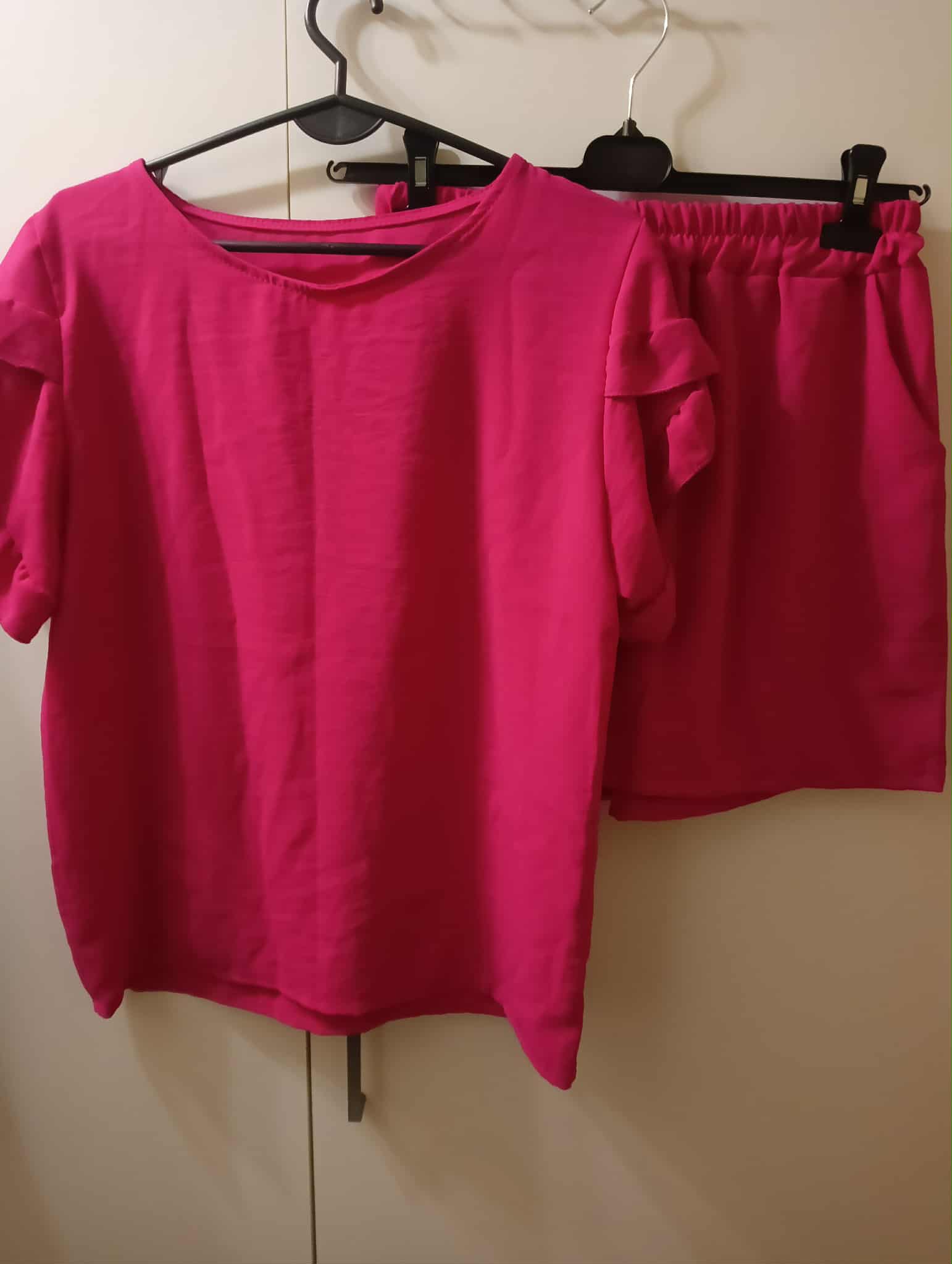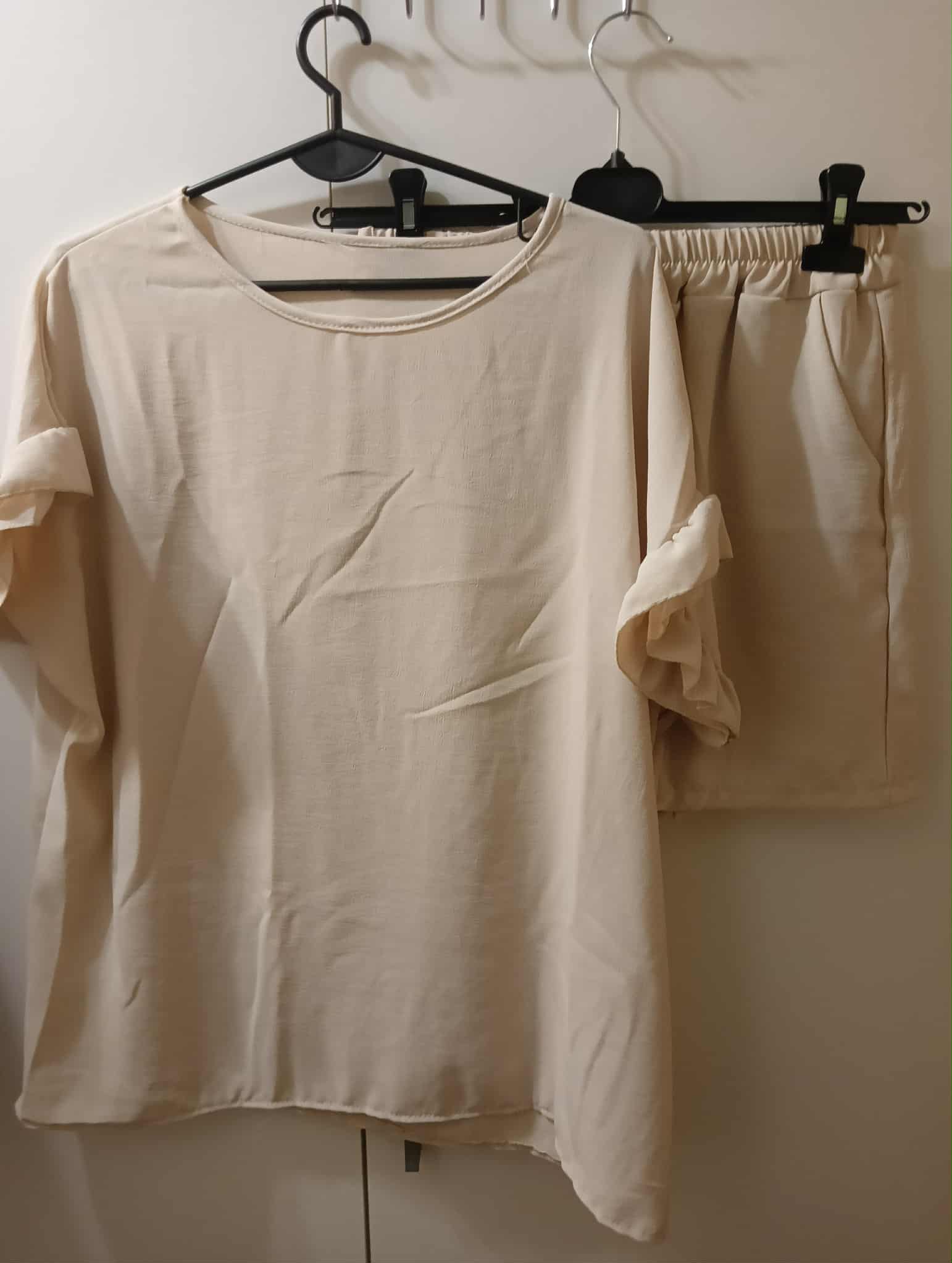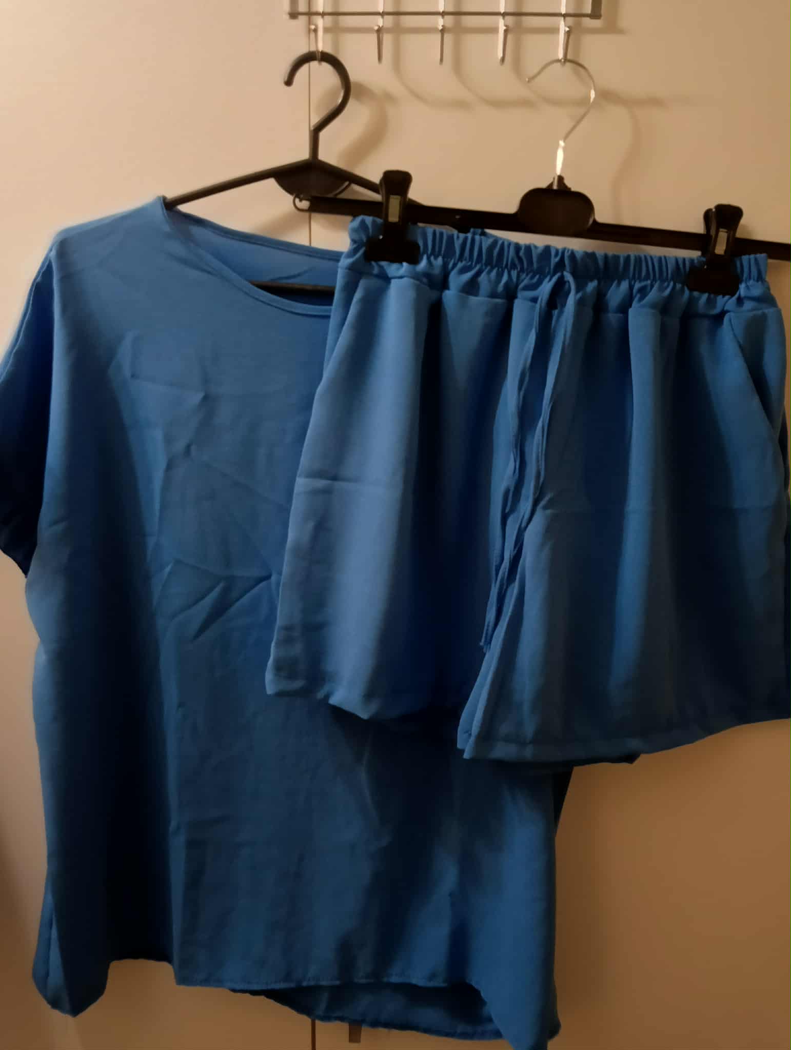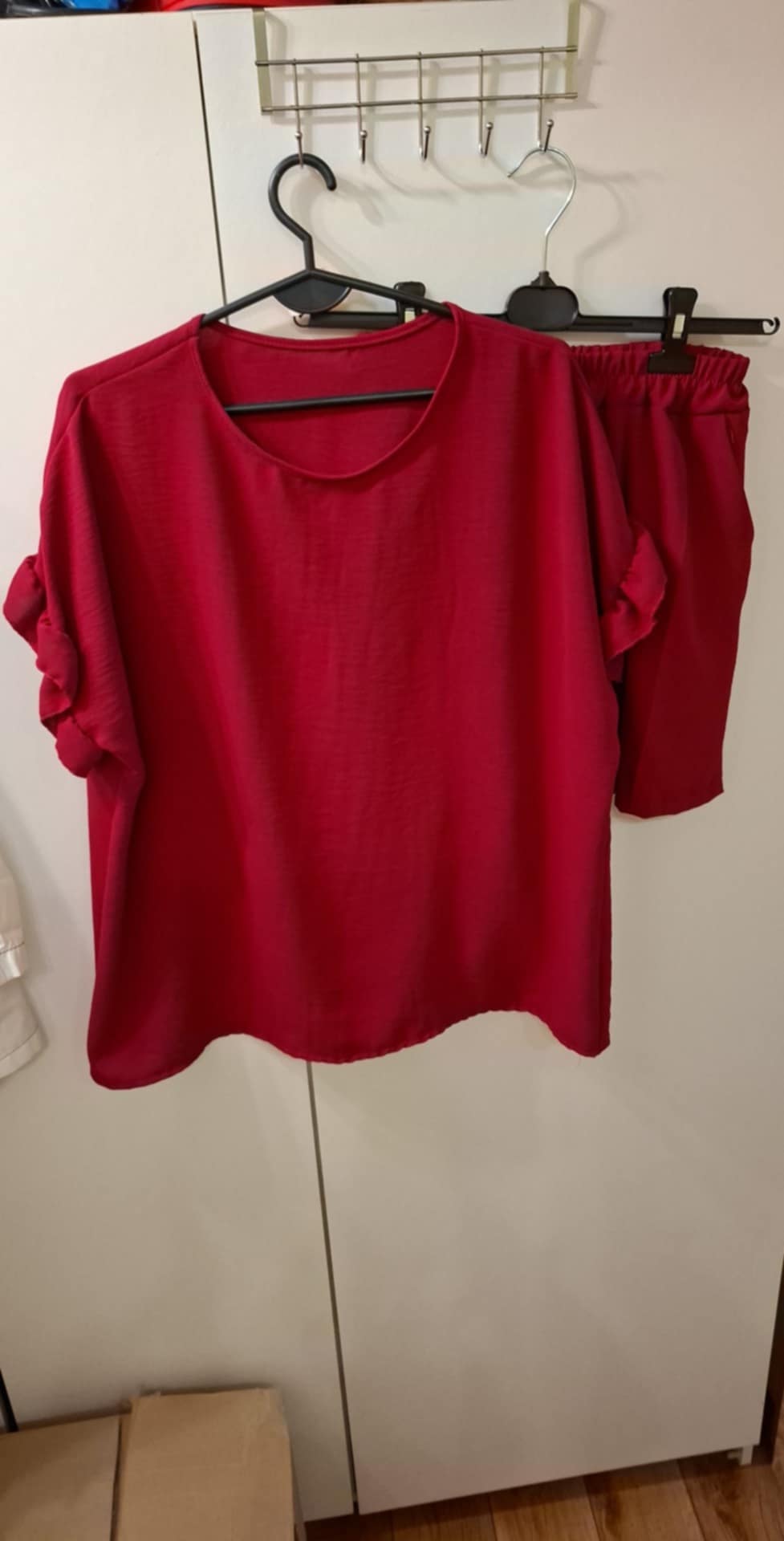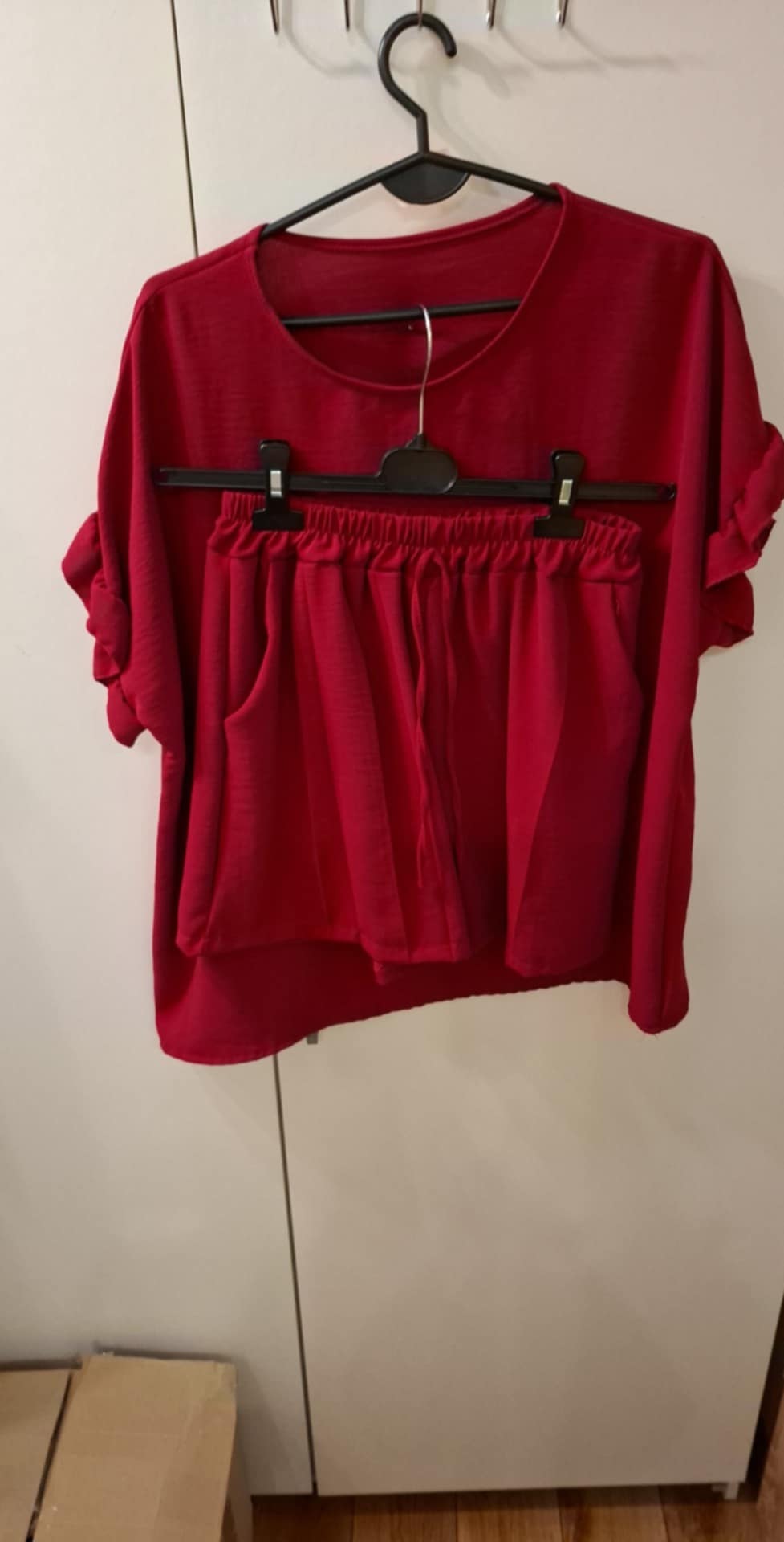 Komplet 100% wiskoza, lekki i zwiewny . W skład wchodzi bluzka z krótkim rękawem, zakończona falbankami ( biust 126 cm, długość 67 cm ) krótkie spodenki z troczkiem ( pas 68-104 cm , długość 39 cm )