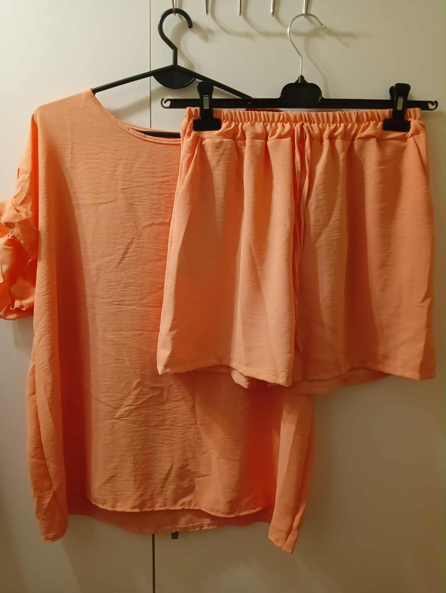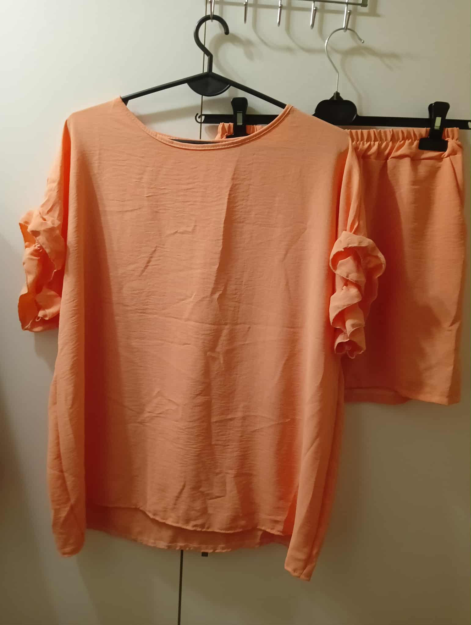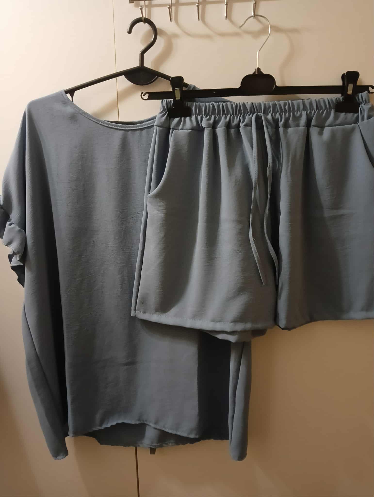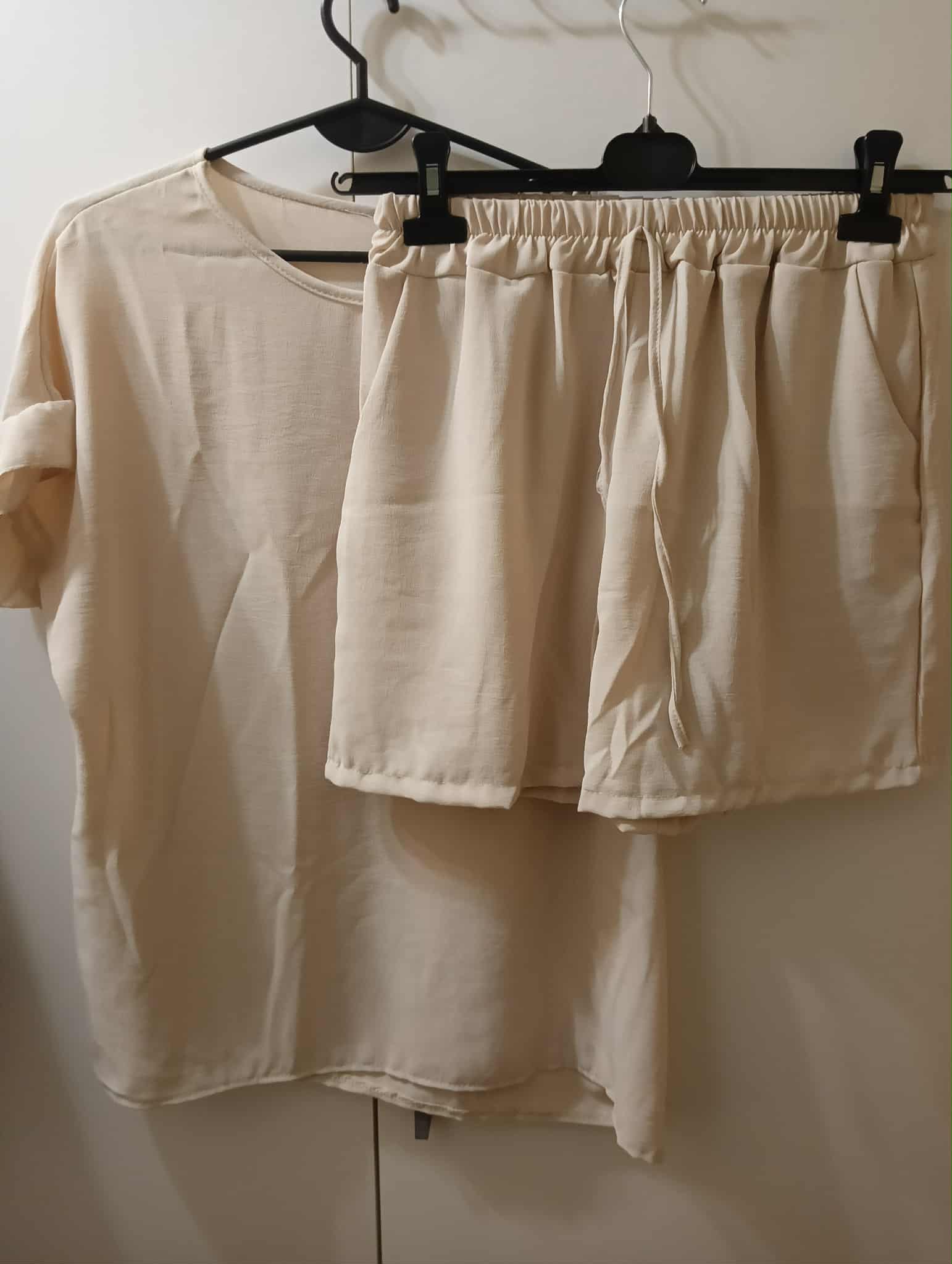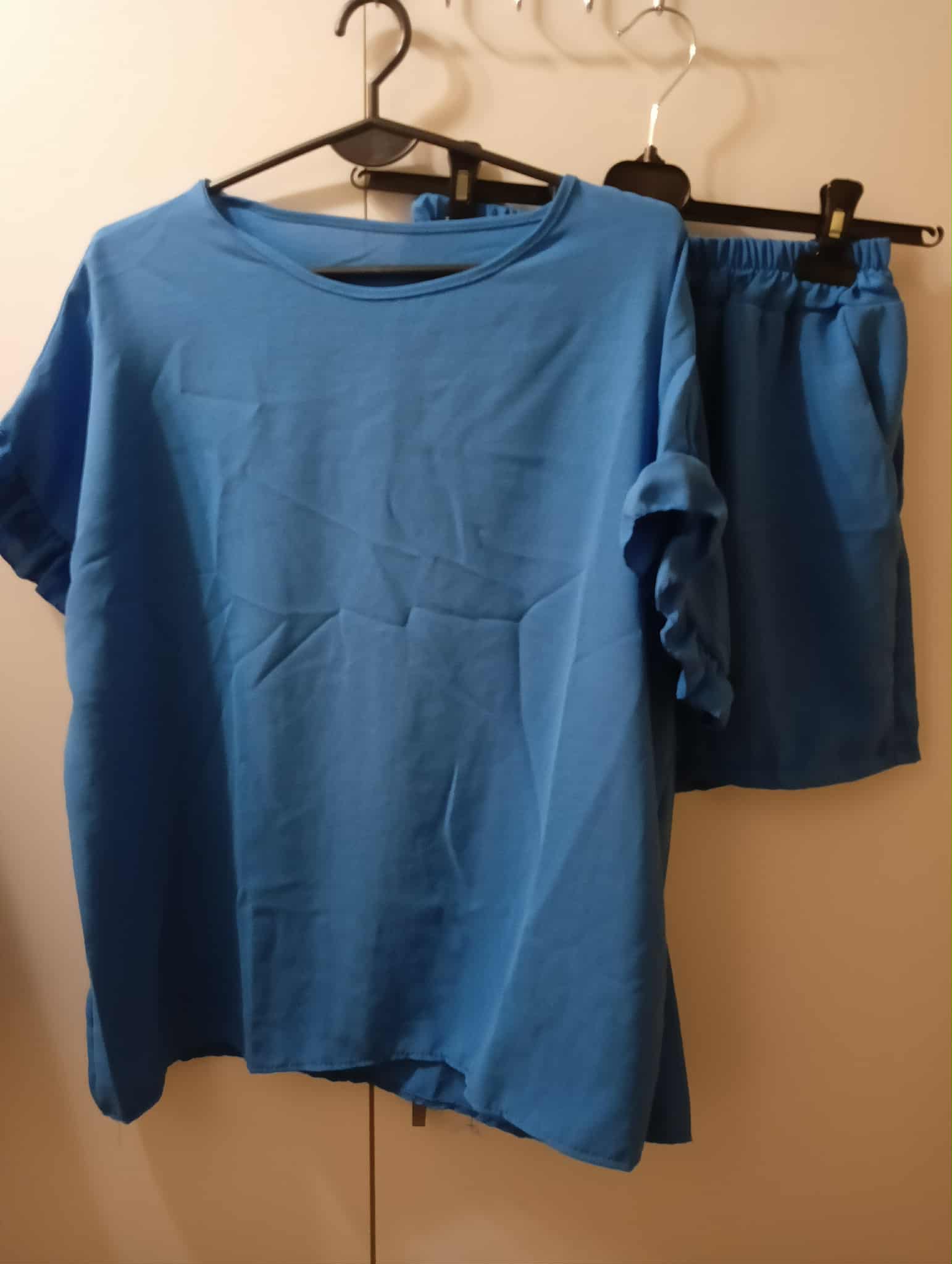 Komplet 100% wiskoza, lekki i zwiewny . W skład wchodzi bluzka z krótkim rękawem, zakończona falbankami ( biust 126 cm, długość 67 cm ) krótkie spodenki z troczkiem ( pas 68-104 cm , długość 39 cm )