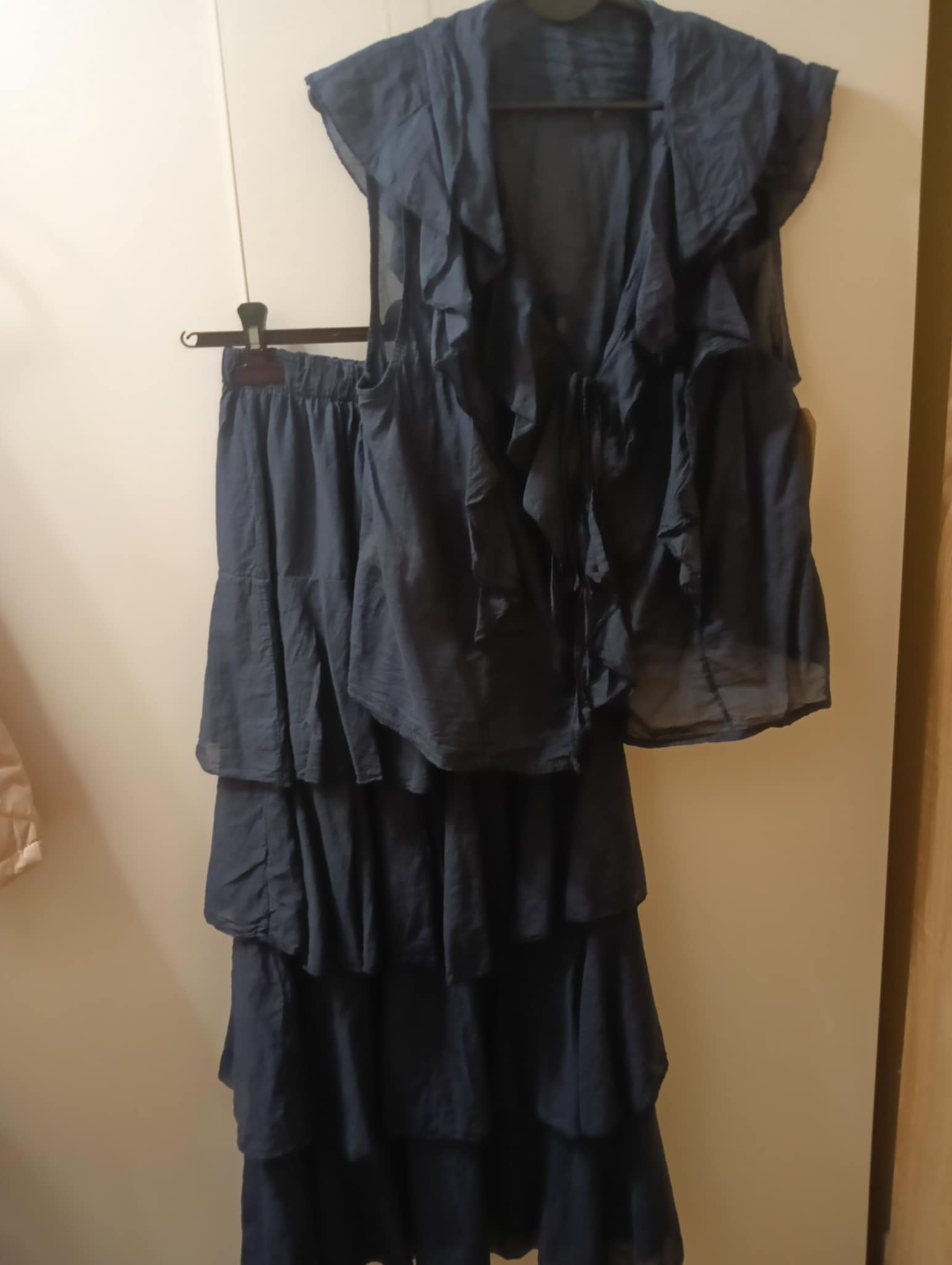 Spódnica – trzy nakładjące się falbany , lekka, zwiewna, na gumce . Wymiary : pas 66-110 cm, biodra 118 cm , długość 92 cm