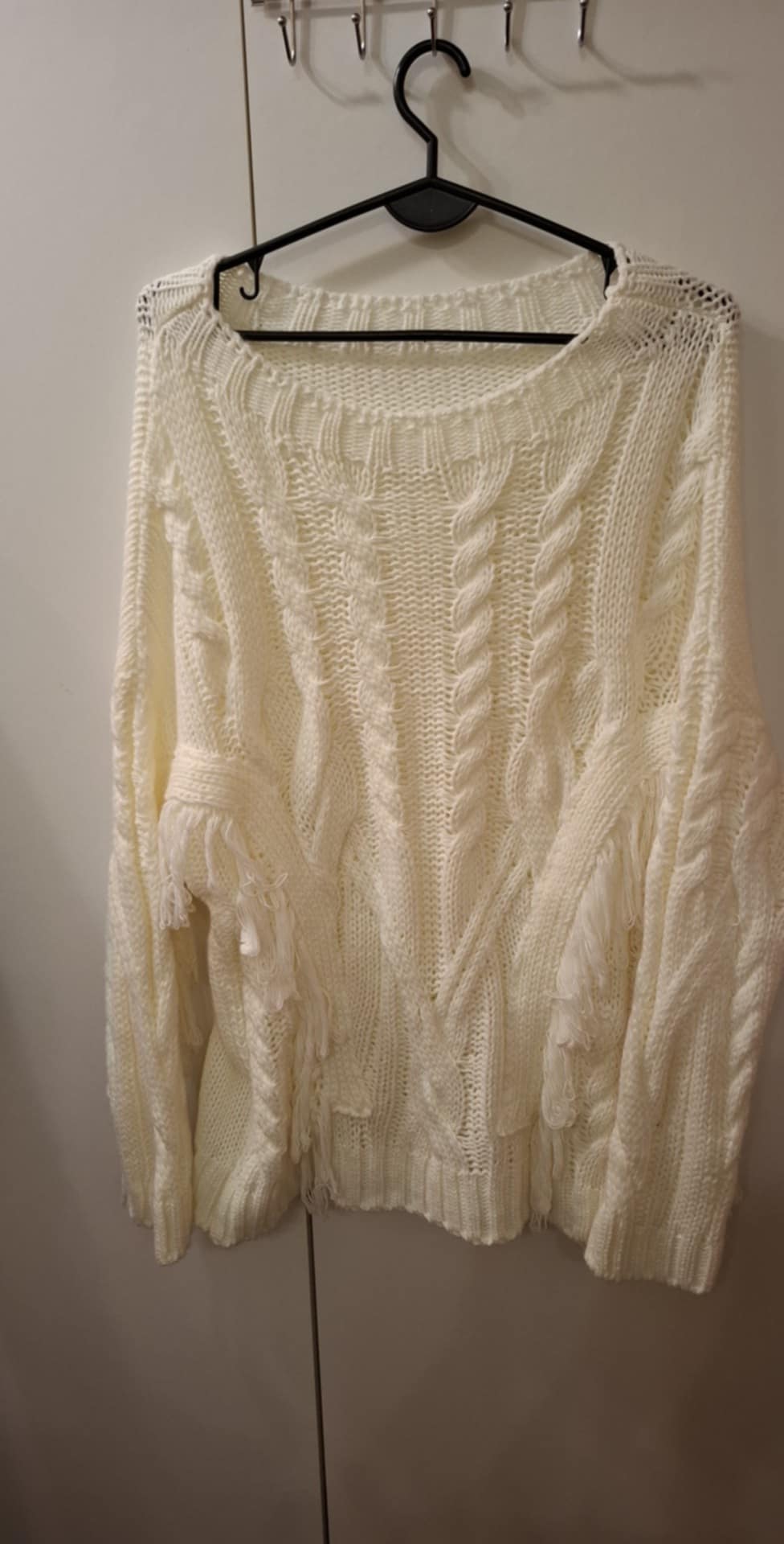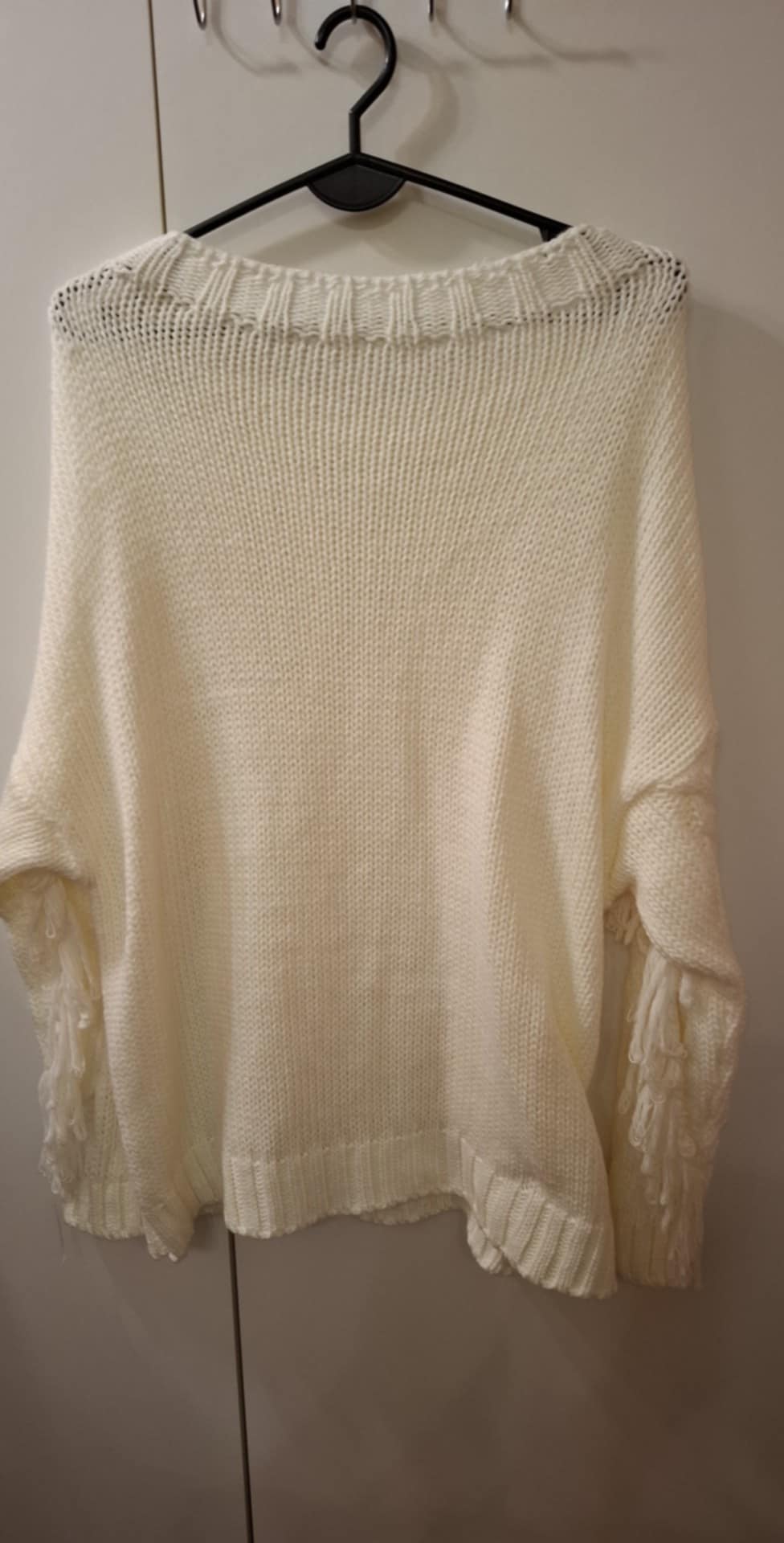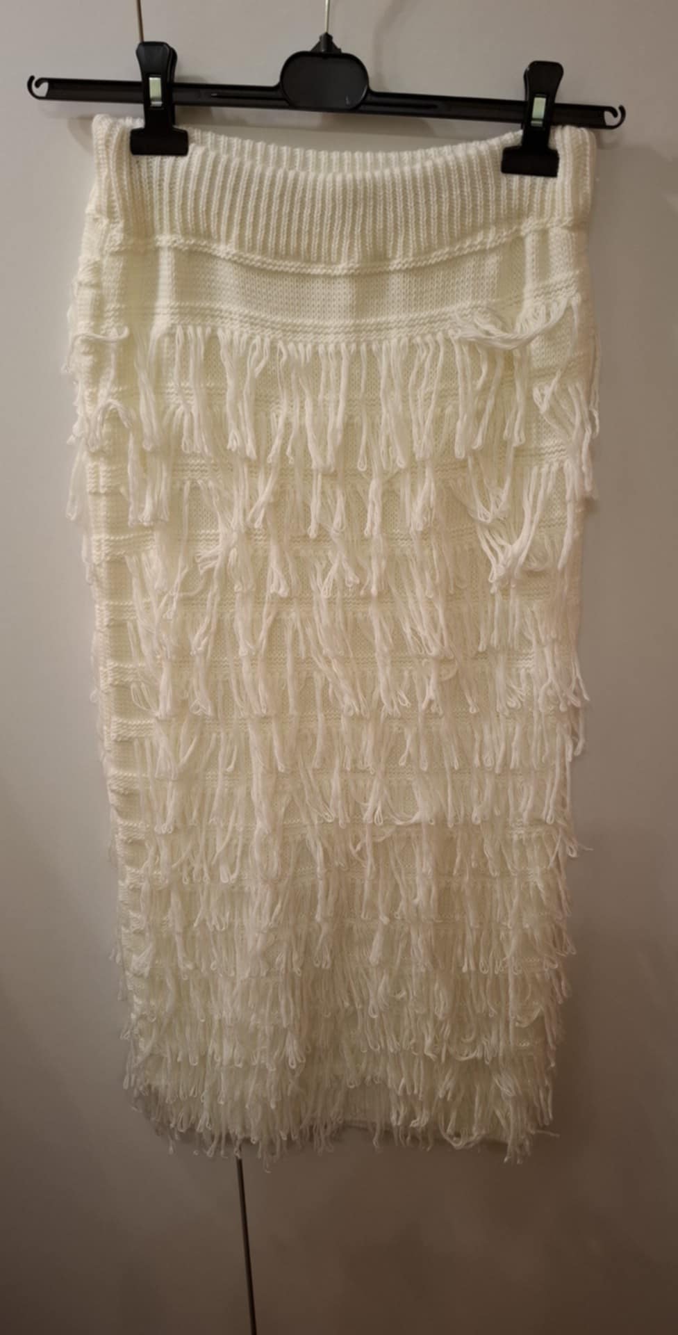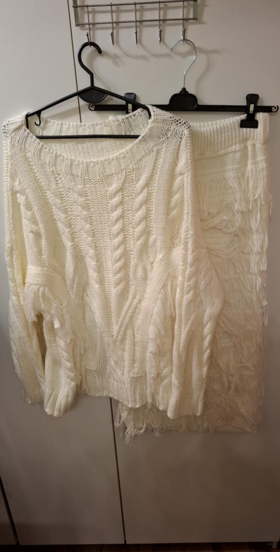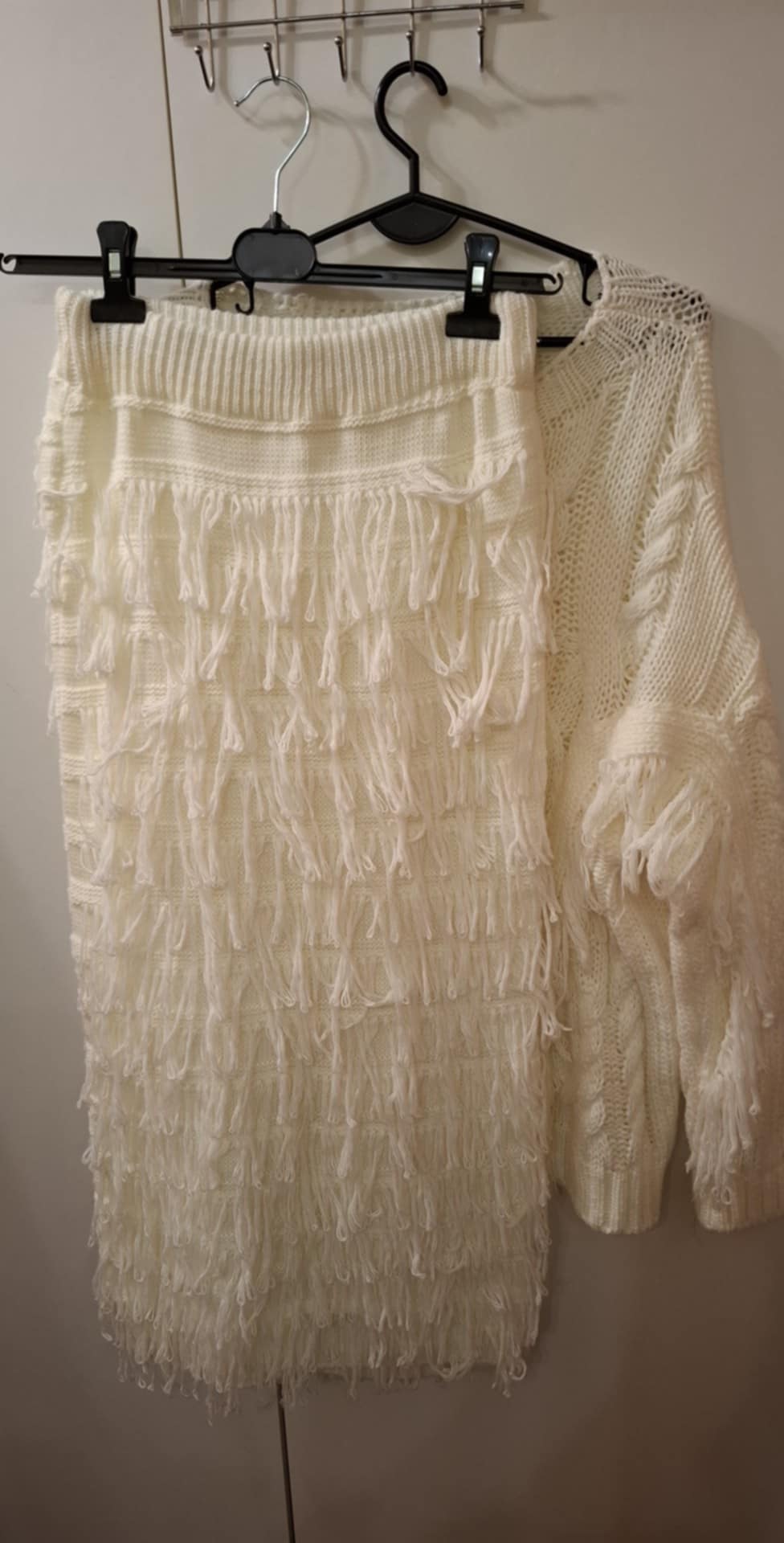 Komplet z frędzlami : spódnica ( pas 70-84cm, długość 85 cm ) , Sweterek na rękawie i z przodu frędzle ( biust 110 cm , długość 67 cm) , 100% akryl . Kolekcja Włochy