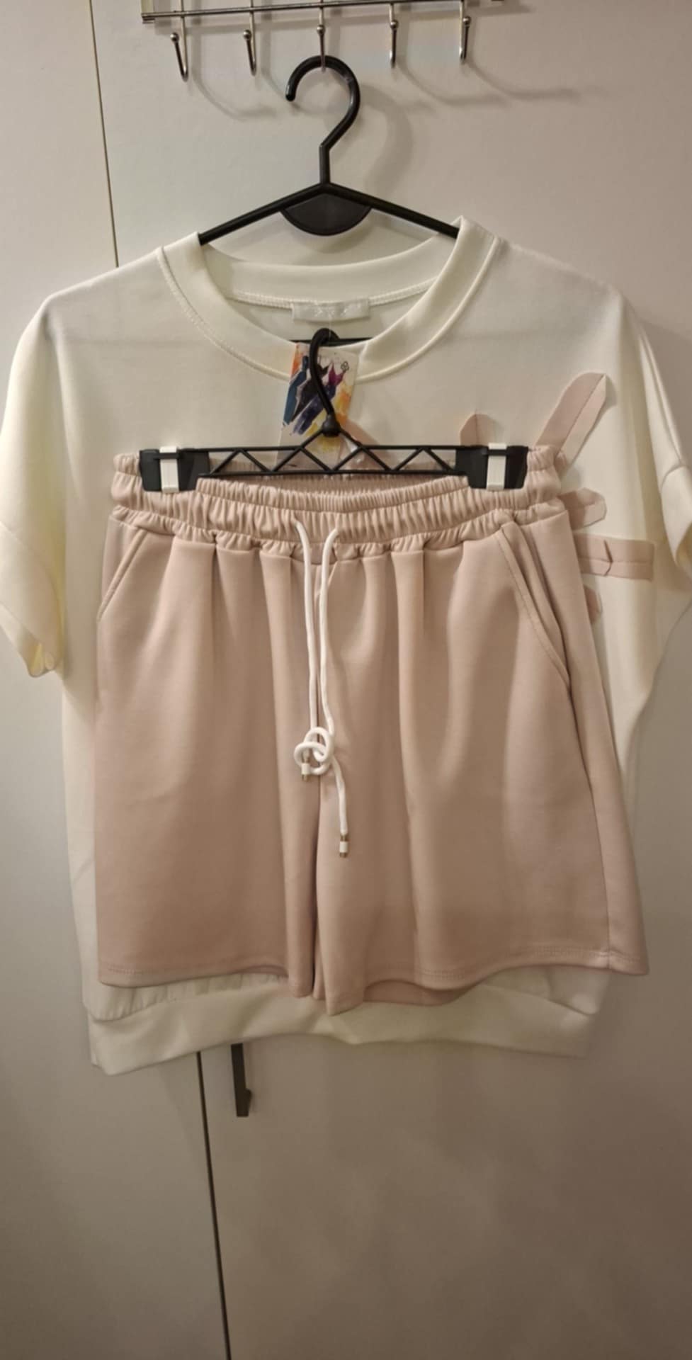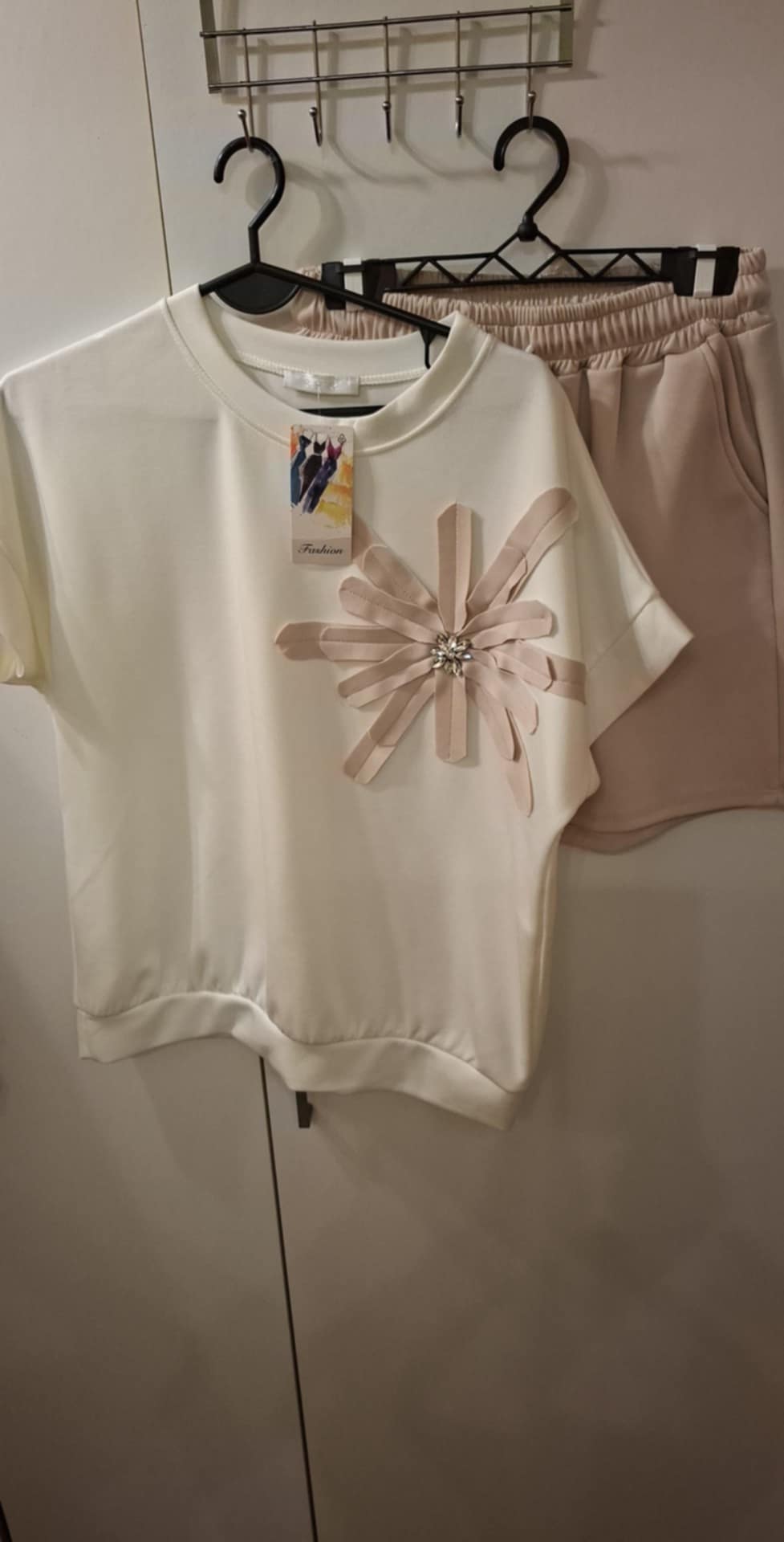 Komplet w kolorze beż z krótkimi spodenkami , na bluzce duży beżowy kwiat , 60% wiskoza, 40% elastan.