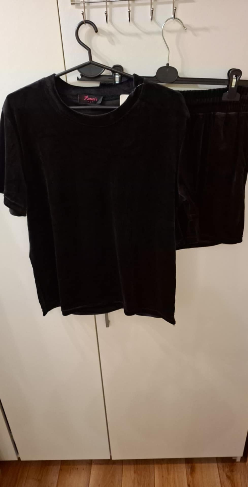 Komplet welurowy 92% poliester,8% elastan . Bluzka z krótkim rękawem oraz spodenki na gumce, wiązane troczkiem .
