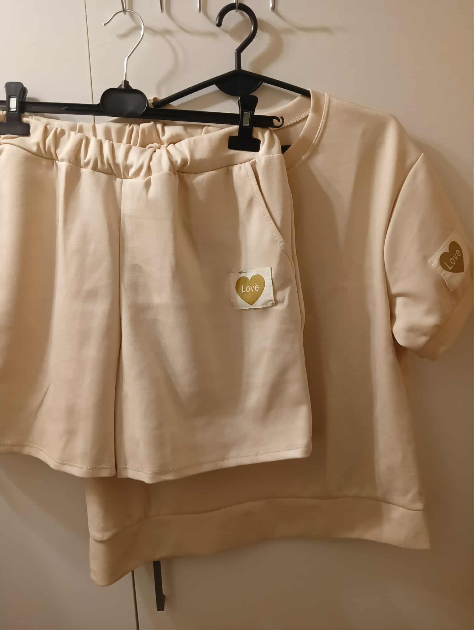 Komplet bluzka i krótkie spodenki z naszywką serduszko i napisem Love . Kolor beżowy.