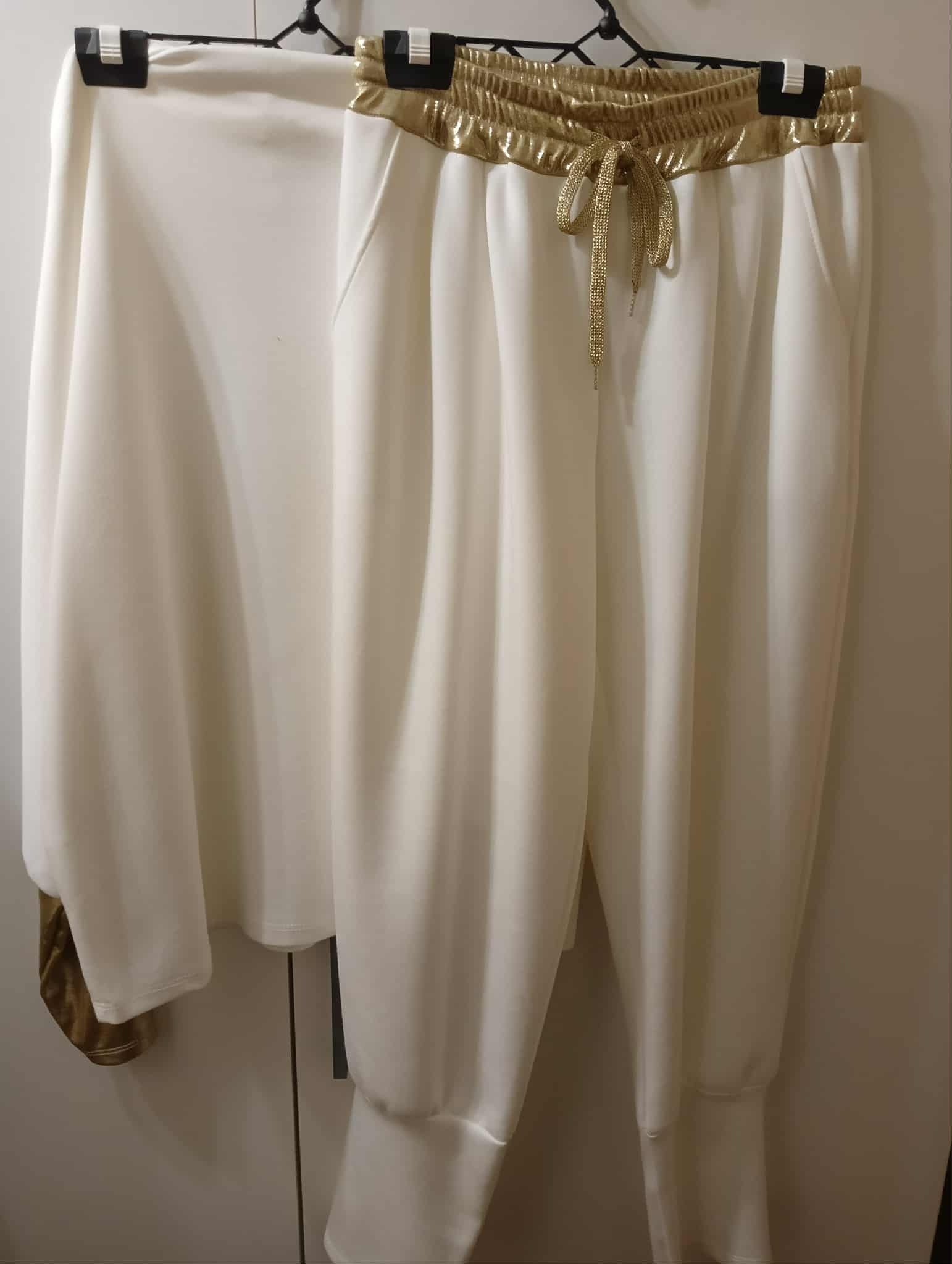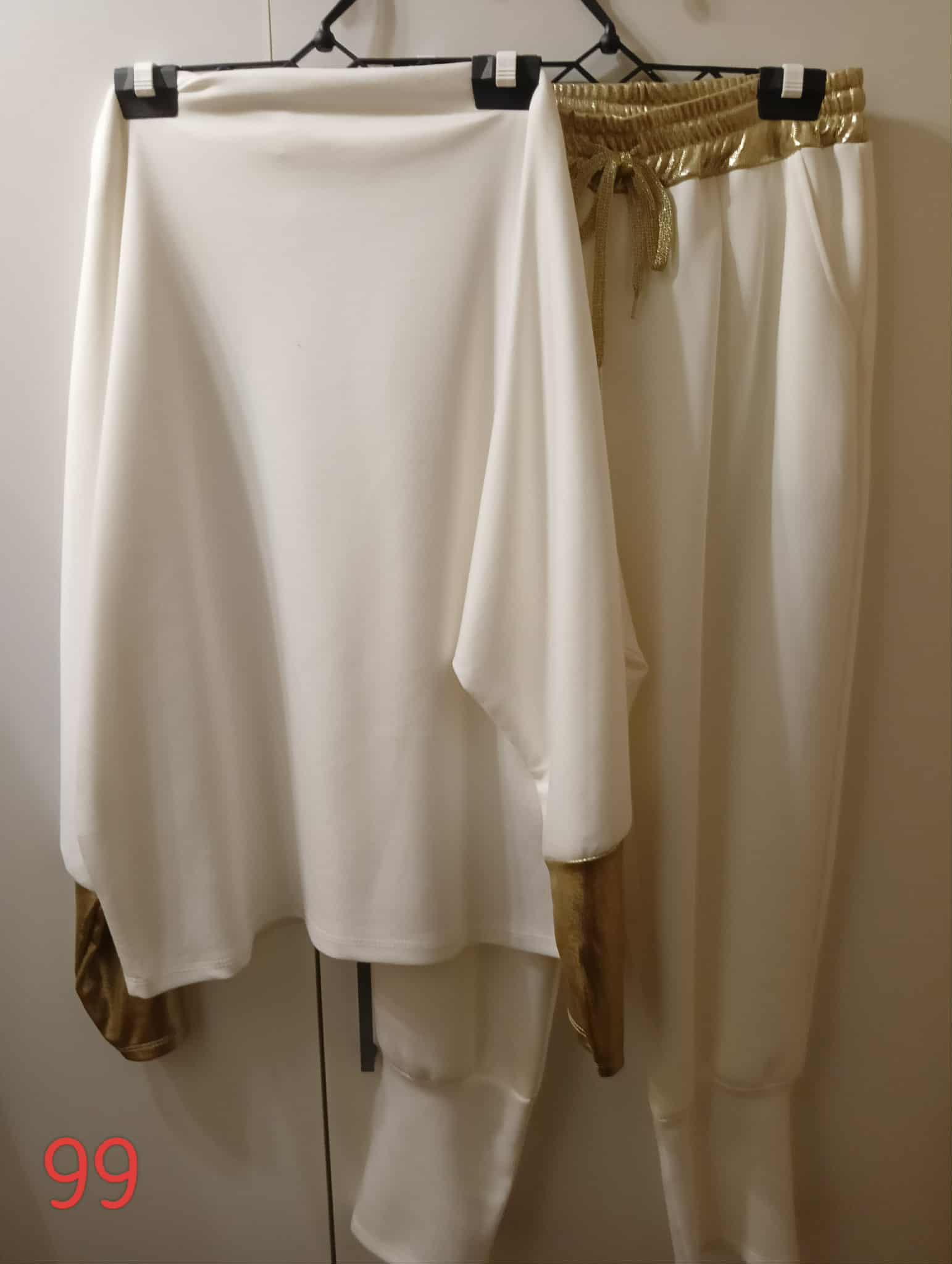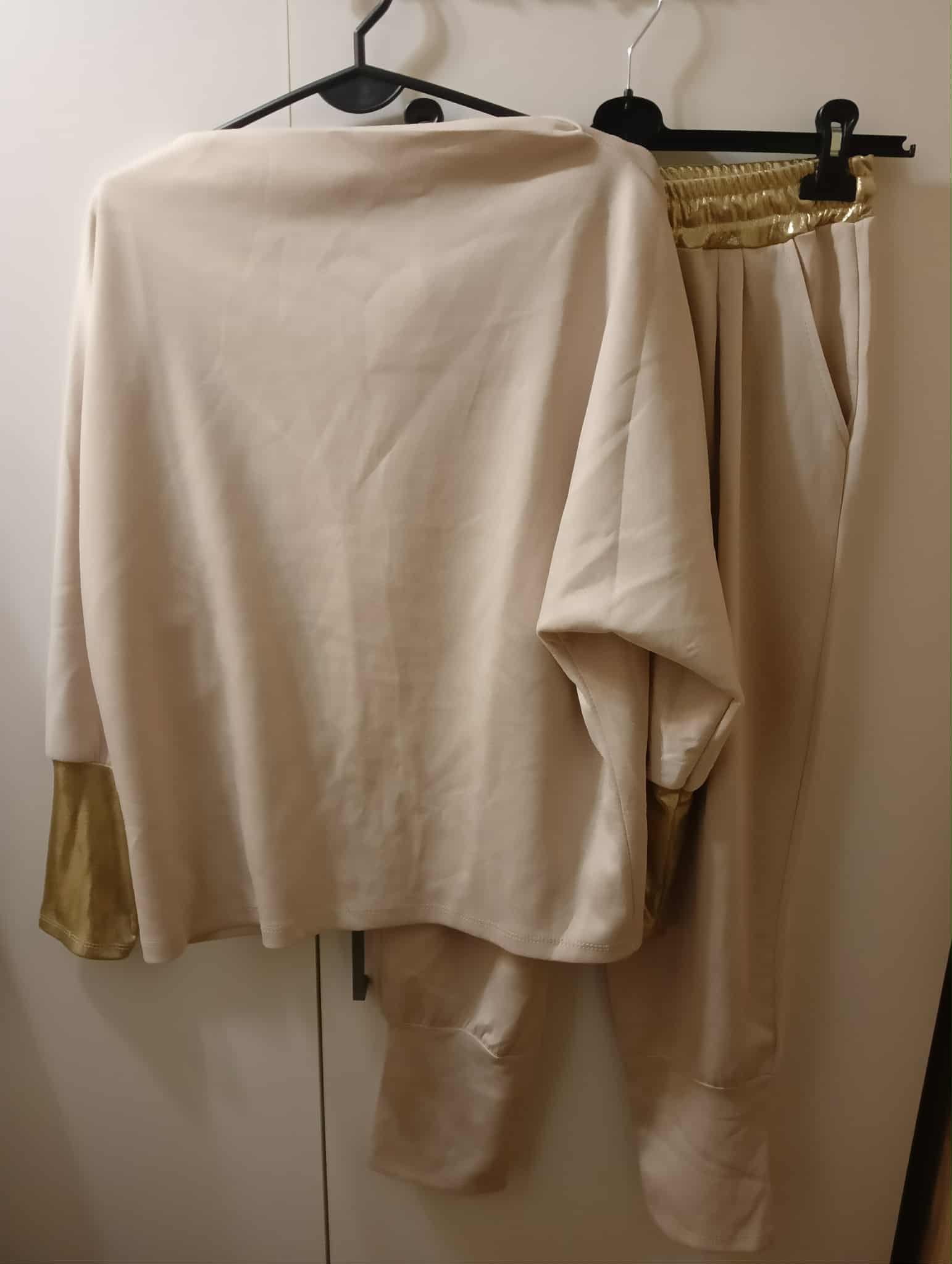 Komplet : bluzka długi rękaw,  zakończona złotym ściągaczem , długie spodnie ze ściągaczem na dole i złotym paskiem z troczkiem . Materiał masełko – 60% wiskoza,40% elastan.
