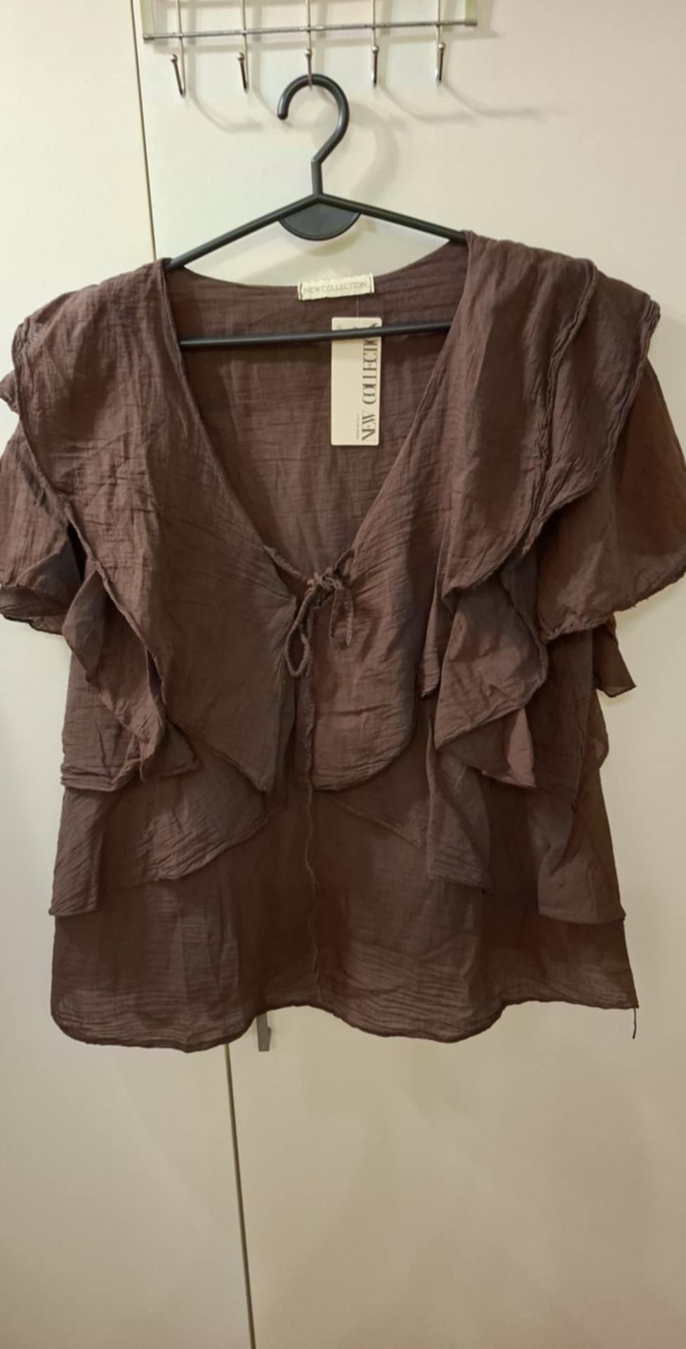 Koszula falbaniasta z krótkim rękawem . Zawiązywana na troczek , opadający rękaw z falbany . 100% bawełna , rozmiar uniwersalny od M do XL , biust max 115 , długość 63 cm