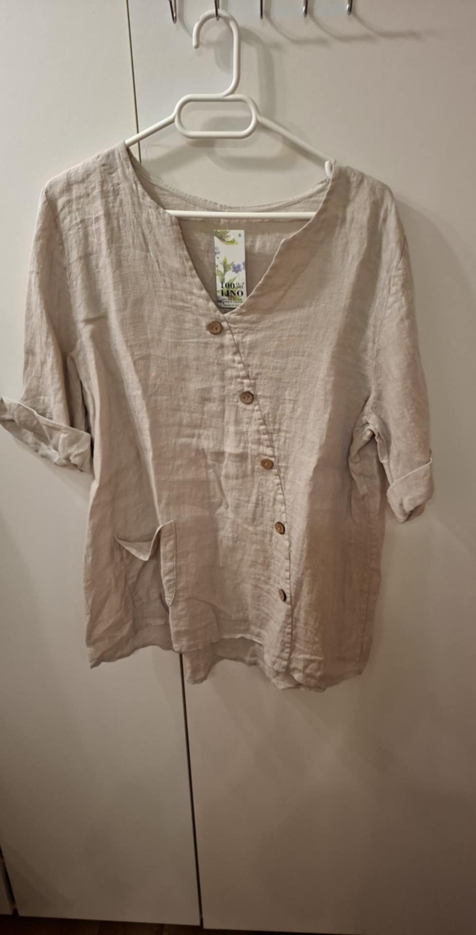 Koszula 100% len. Wersja dłuższa , rękaw za łokieć , plecy odcinane , kieszonka , zdobny pasek z guziczkami po skosie koszuli. Rozmiar: biust do 115 cm , długość przód 71 cm, długość tył 74 cm .