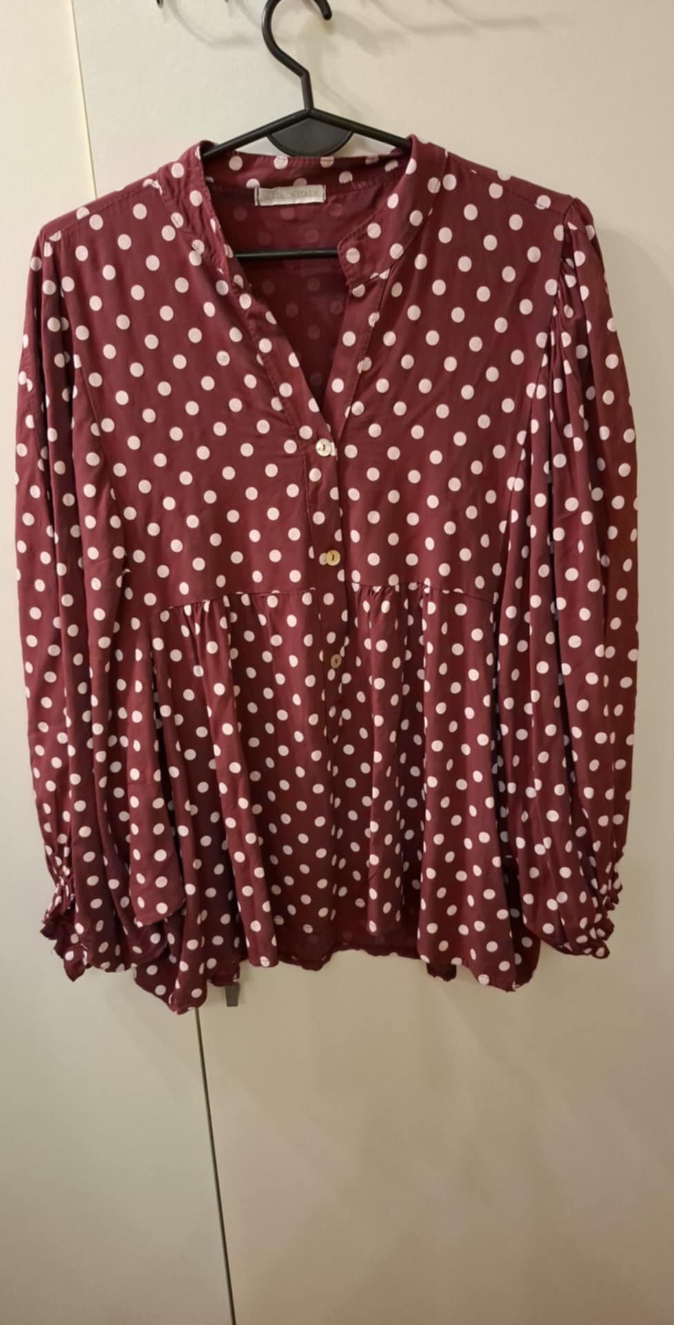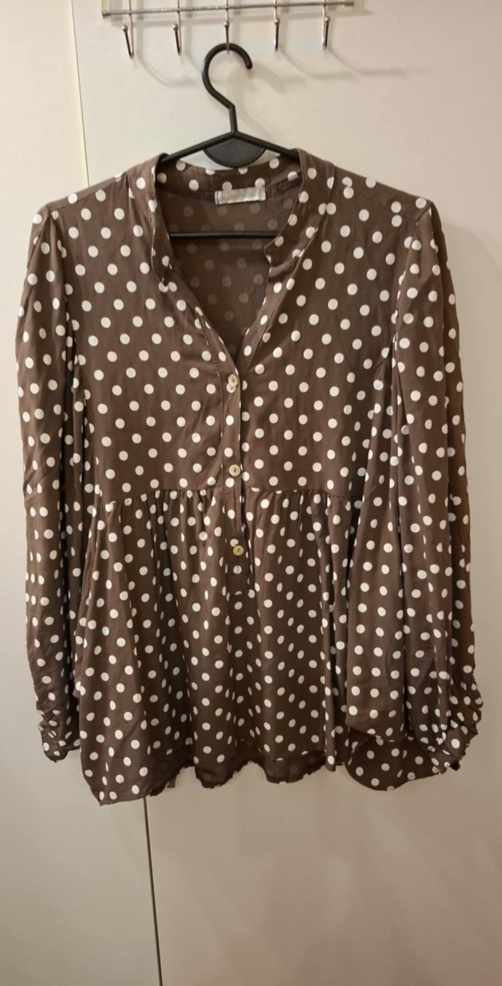 Koszula w grochy , luźna , rękaw dłuższy na gumie , przód zapinany na guziczki , tył dłuższy . Rozmiar od M do XL , Biust do 154 cm , długość 63/73 cm