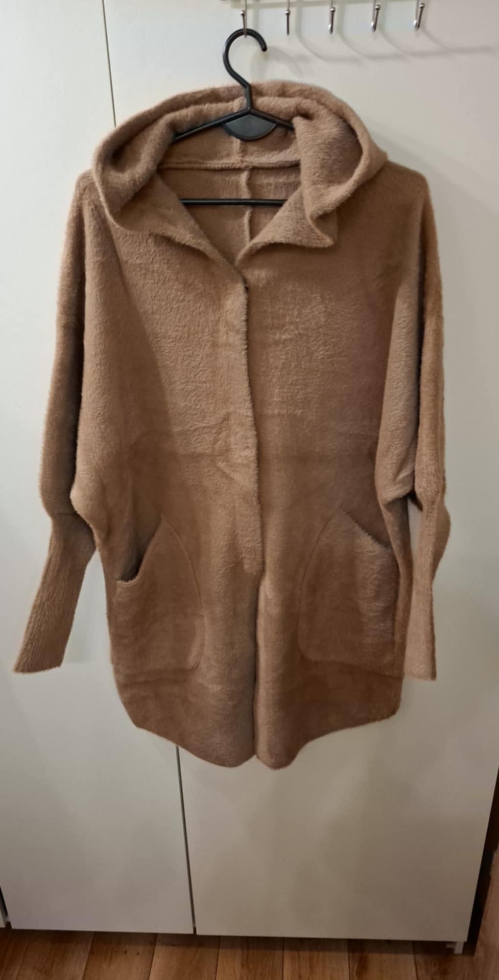 Kurtka/płaszczyk z 3 warstwowej alpaki . Zapinana na 3 napki , głębokie kieszenie , kaptur , rękaw do łokcia na ściągaczu , bardzo ciepły , kolor mleczna czekolada . Biust 122 cm , długość 83 cm