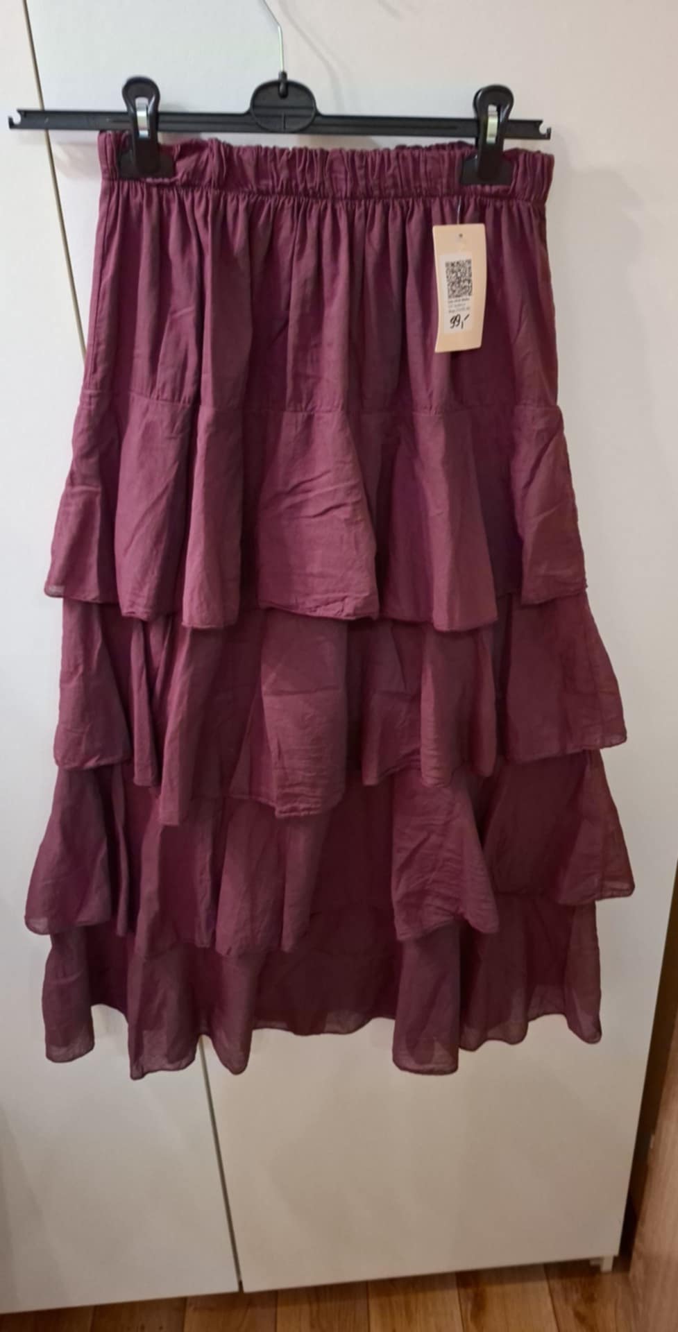 Spódnica z falbanami ( 3 falbany nakładające się na siebie) , w pasie na gumce , lekka, zwiewna. Kolekcja włoska . Pas 66-110 cm , biodra do 118 cm , długość 92 cm . Kolor śliwka.