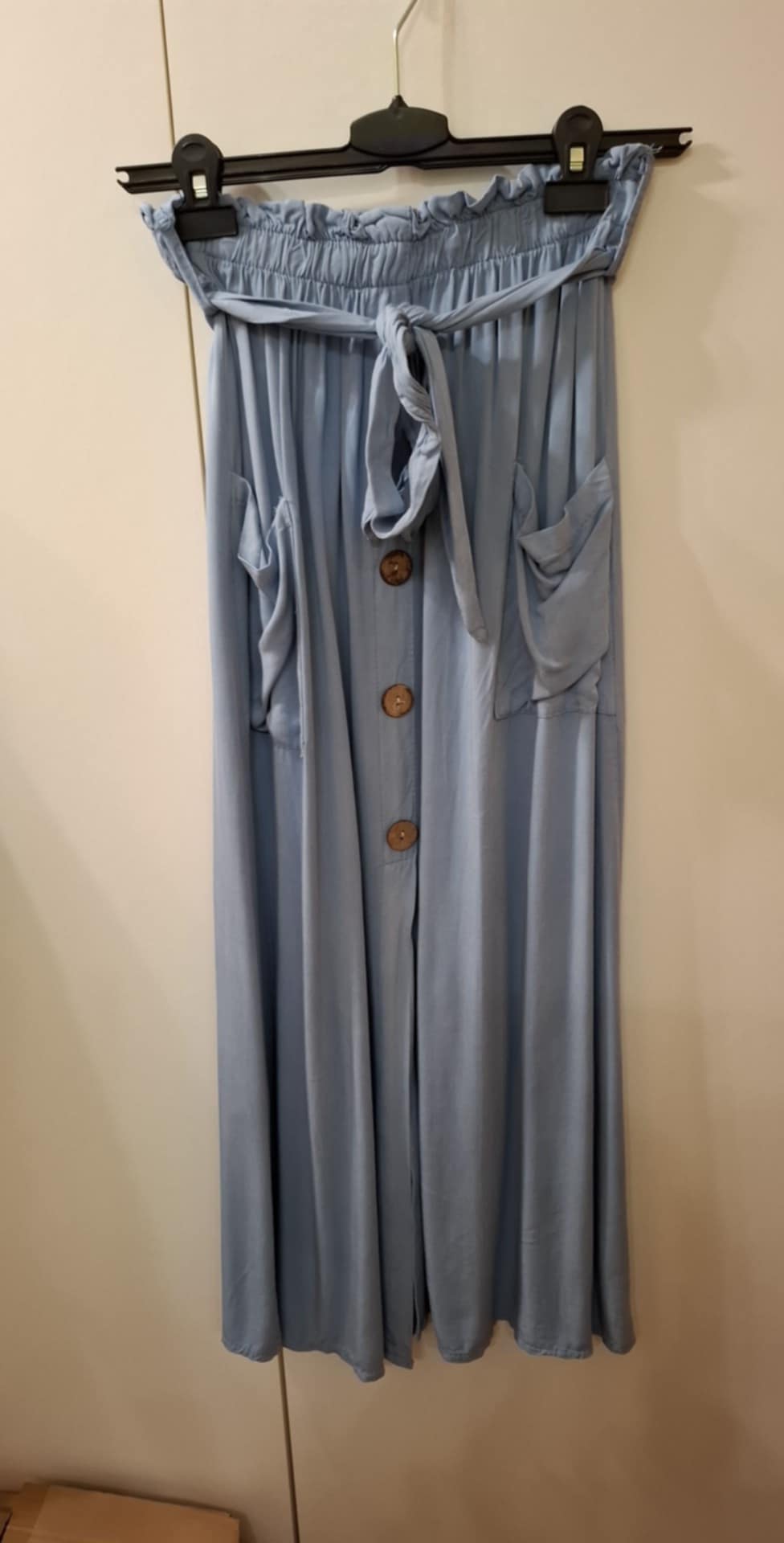 Spódnica w kolorze niebieskim , guziki ozdobne, kieszenie, rozporek z przodu , 95% wiskoza, 5 % elastan , Rozmiar : talia 64-92 cm , długość 93 cm , Włochy