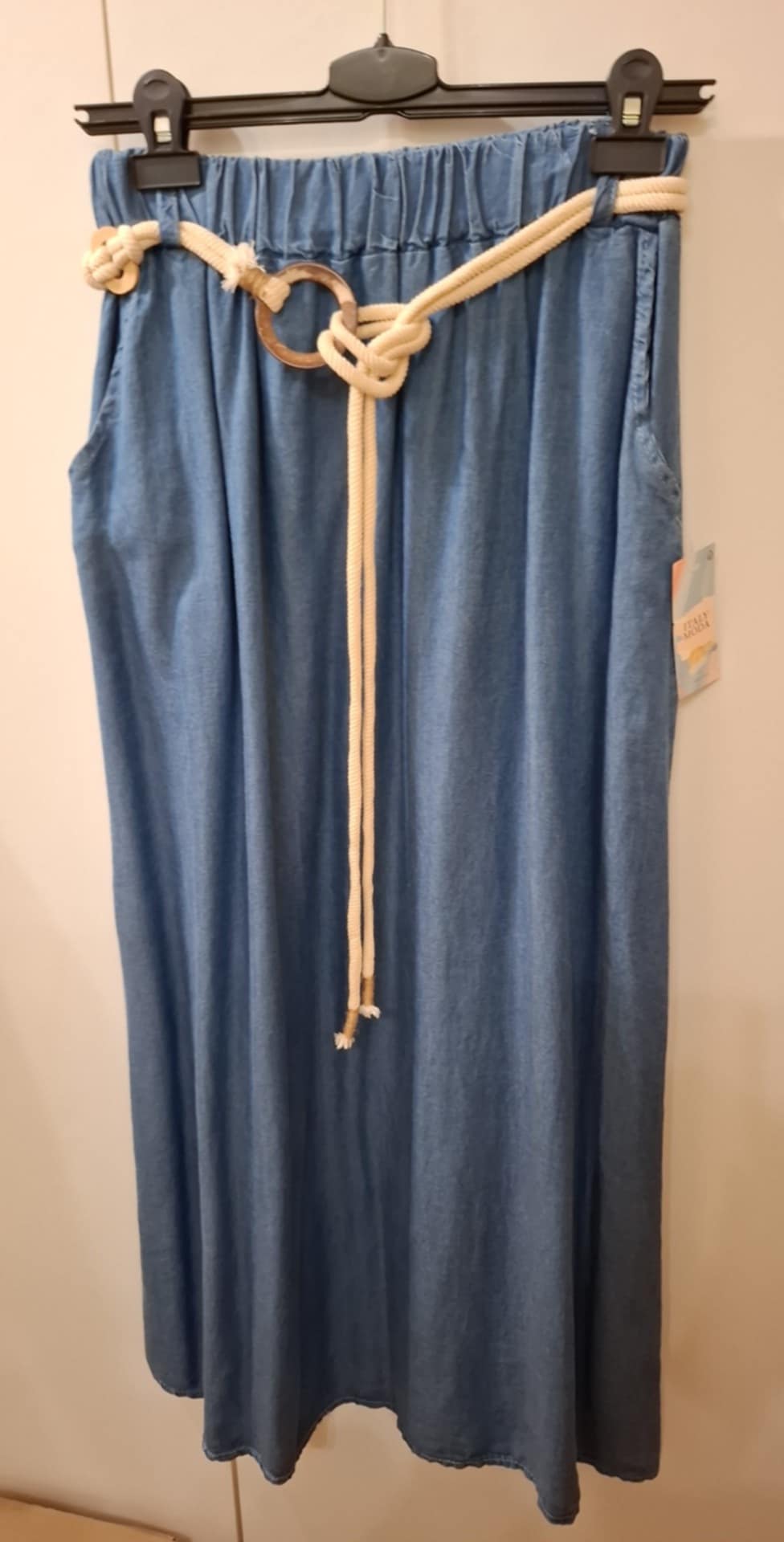 Spódnica niebieska z ozdobnym białym sznurkiem , kieszenie , 100% jedwab , Rozmiar : talia 66-94 cm , długość 100 cm, Kolekcja Włochy