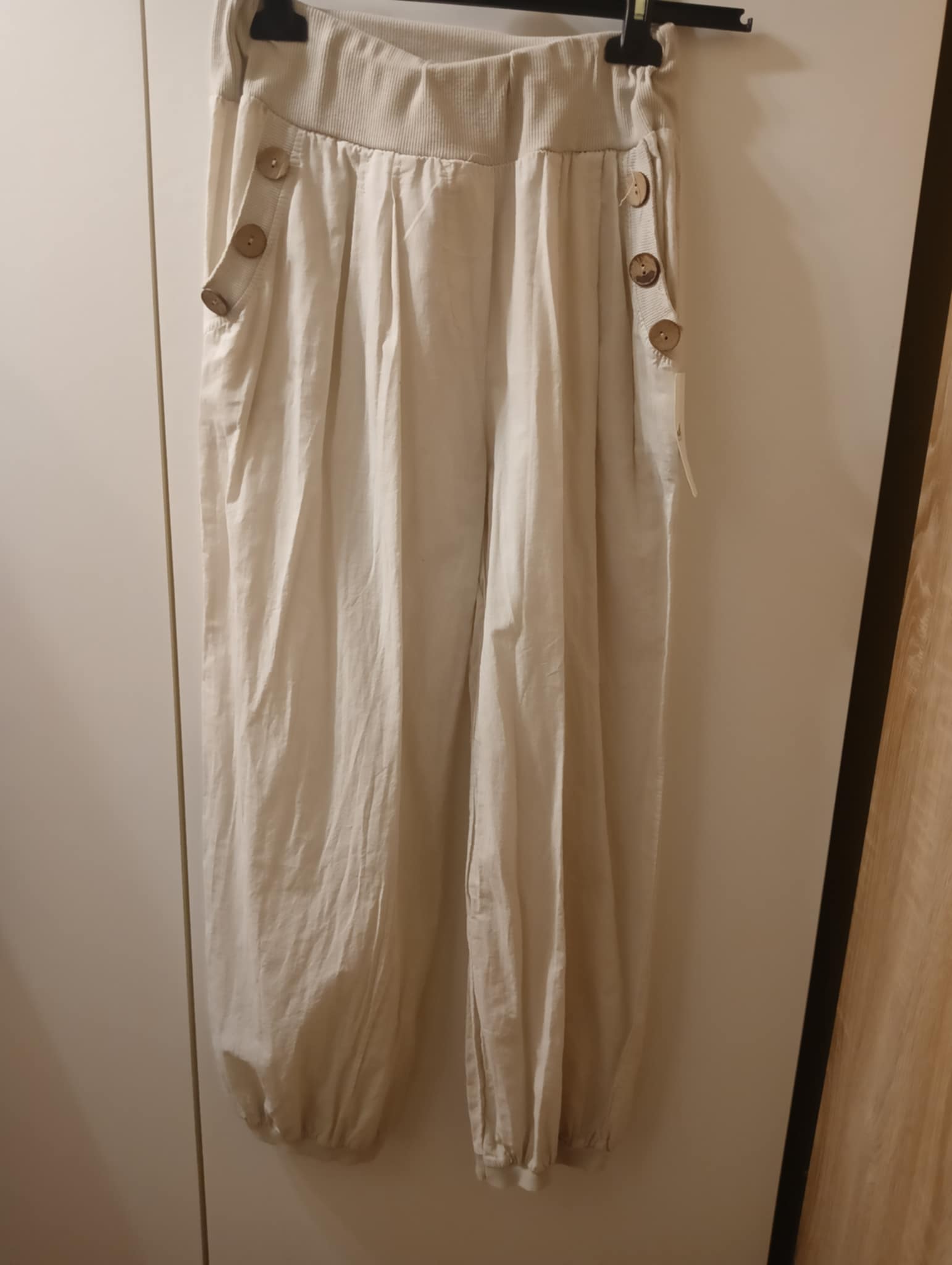 Spodnie bawełniane w kolorze beż , duł spodni na delikatnym ściągaczu , kieszenie ozdobione guziczkami . Rozmiar uniwersalny od S do XL