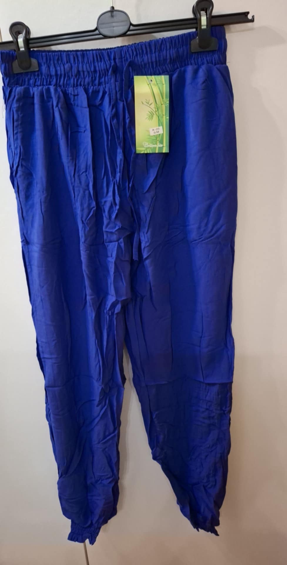 Spodnie 100% bawełna , lekkie i zwiewne , pas na gumie z troczkiem , ściągacz na dole nogawki .