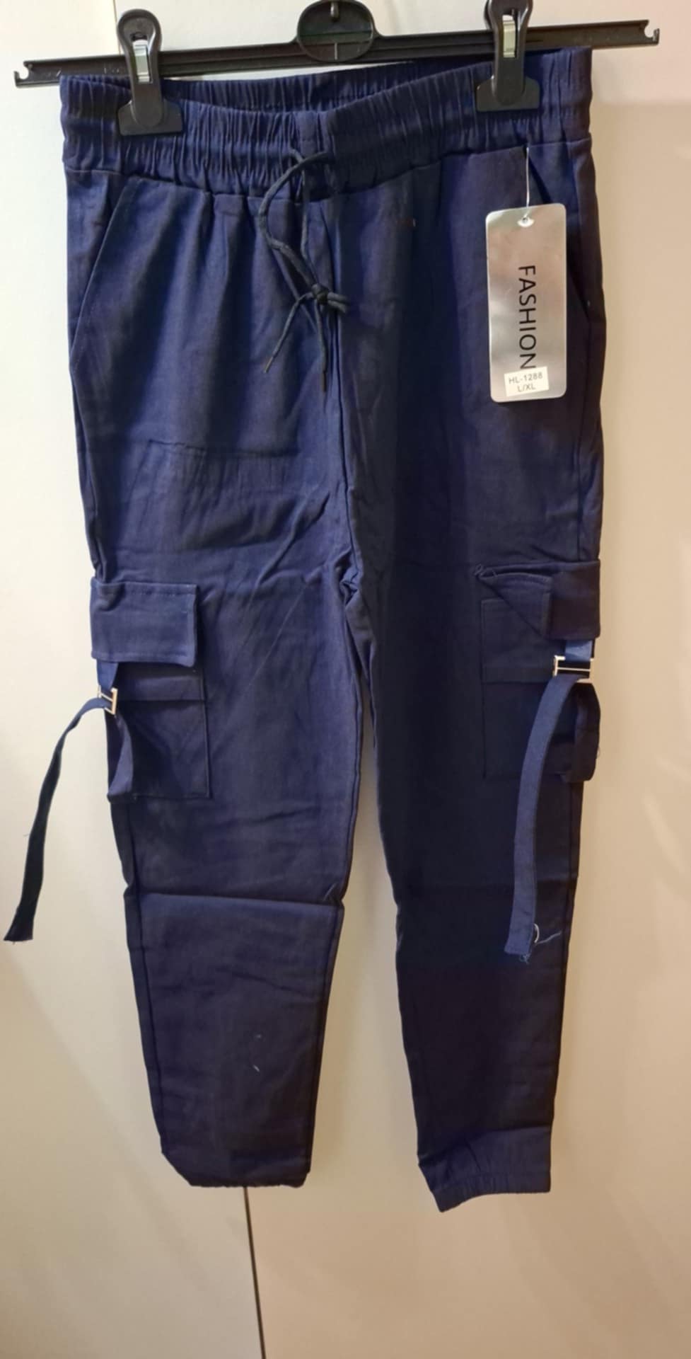 Klasyczne spodnie bojówki , zakończone na dole ściągaczem , na gumie zawiązywane troczkiem. Na nogawkach kieszenie , zdobione klamrą z paseczkiem do ściągnięcia . 85% poliamid i 15% elastan