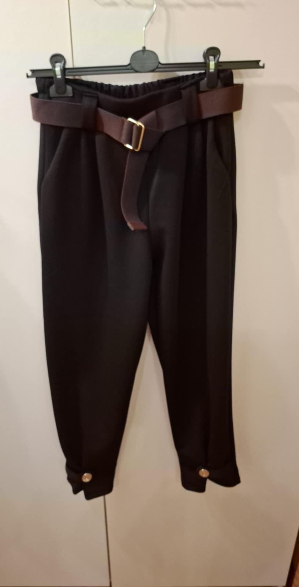 Spodnie włoskie z paskiem czekoladowym  w komplecie . Materiał bardzo miękki 50% poliester, 45% wiskoza 5% elastan. Spodnie na gumce z kieszeniami i zaszewkami przy pasie , a na dole nogawki ozdobny guziczek . Rozmiar: talia 68-90 cm , biodra do 196 cm , długość wewnętrzna 65 cm ,długość całkowita 95 cm .