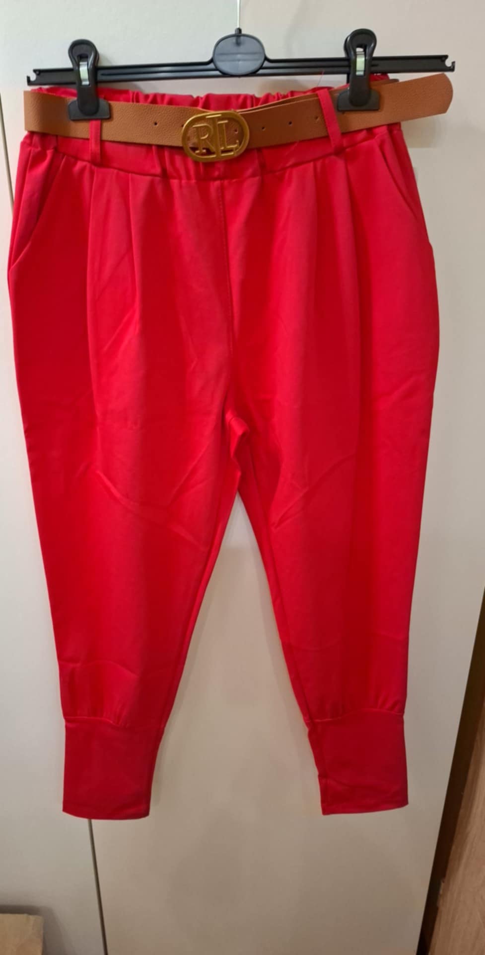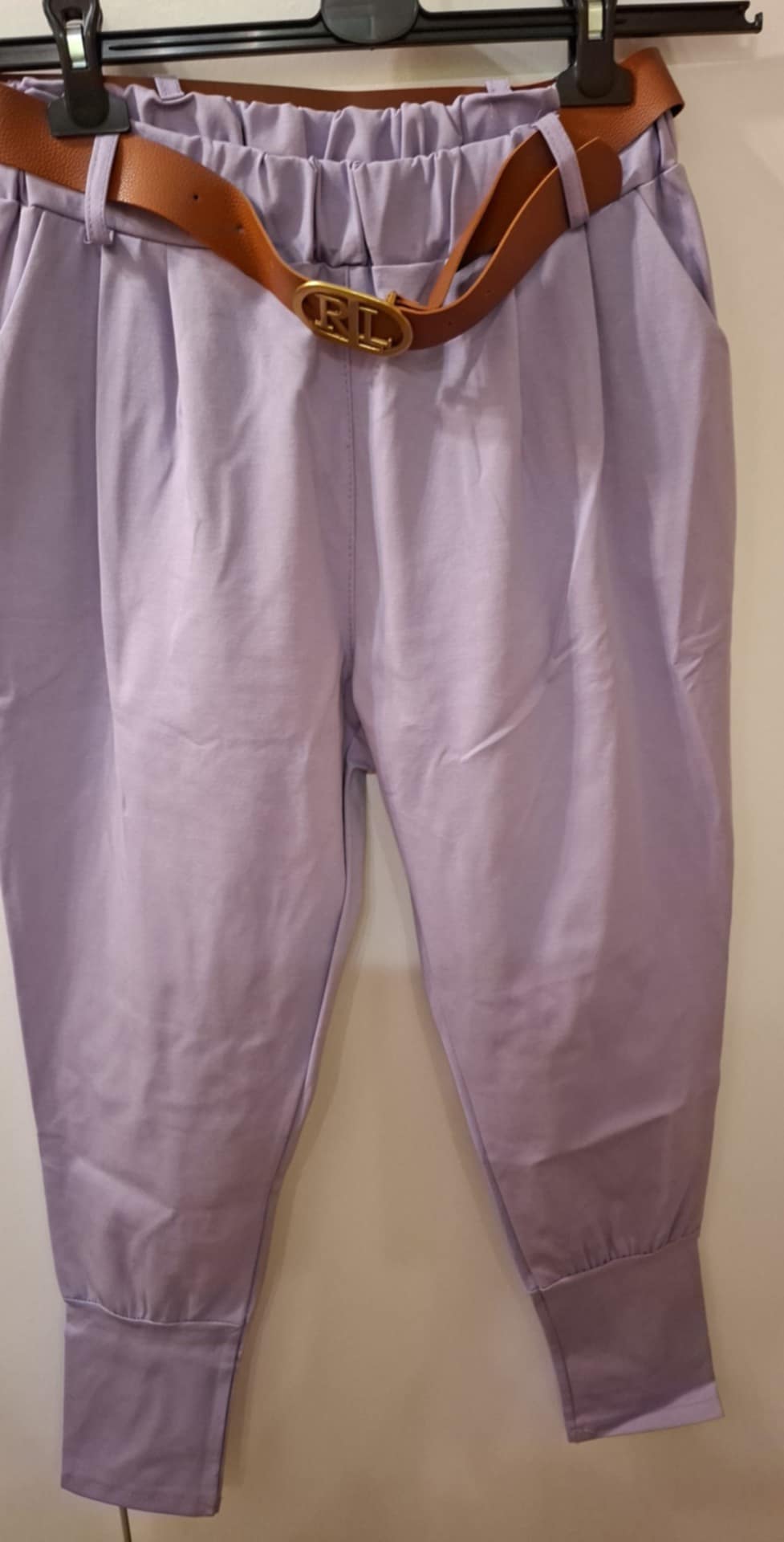 Spodnie włoskie , ze ściagaczem na dole  (18cm) co powoduje zwężenie nogawki , pasek brązowy w komplecie , 5 cm pas na gumie ( wysoki stan)  65% bawełna , 30% poliamid, 5% elastan . Wymiary : pas 64-90 cm , długość 92 cm .