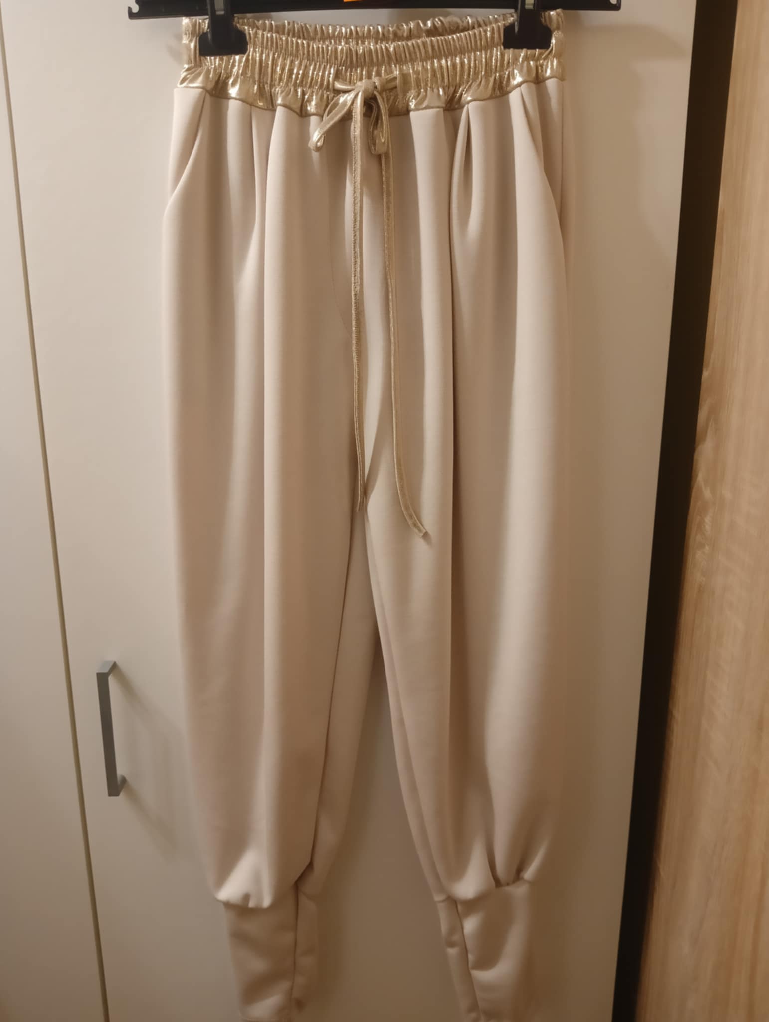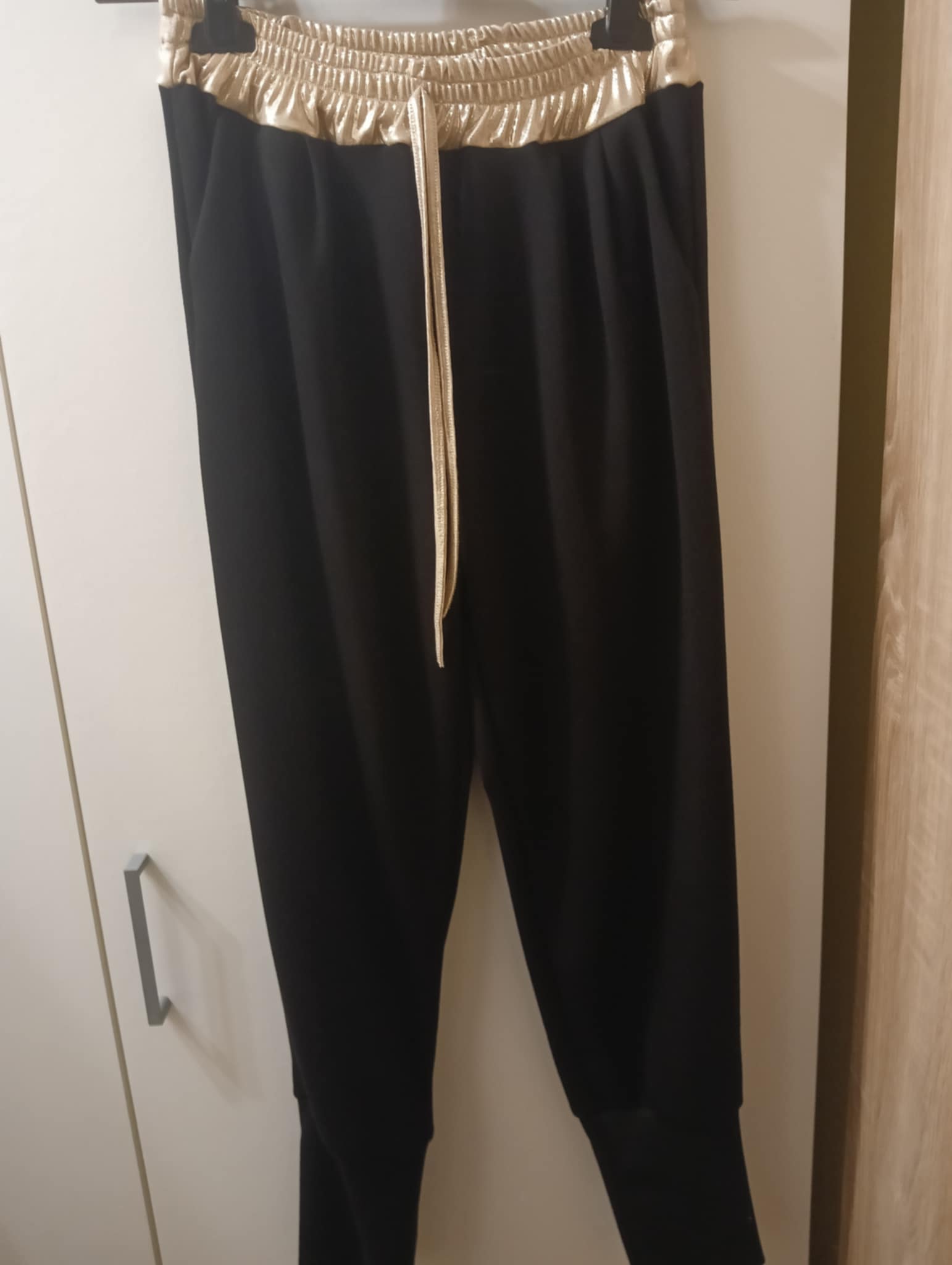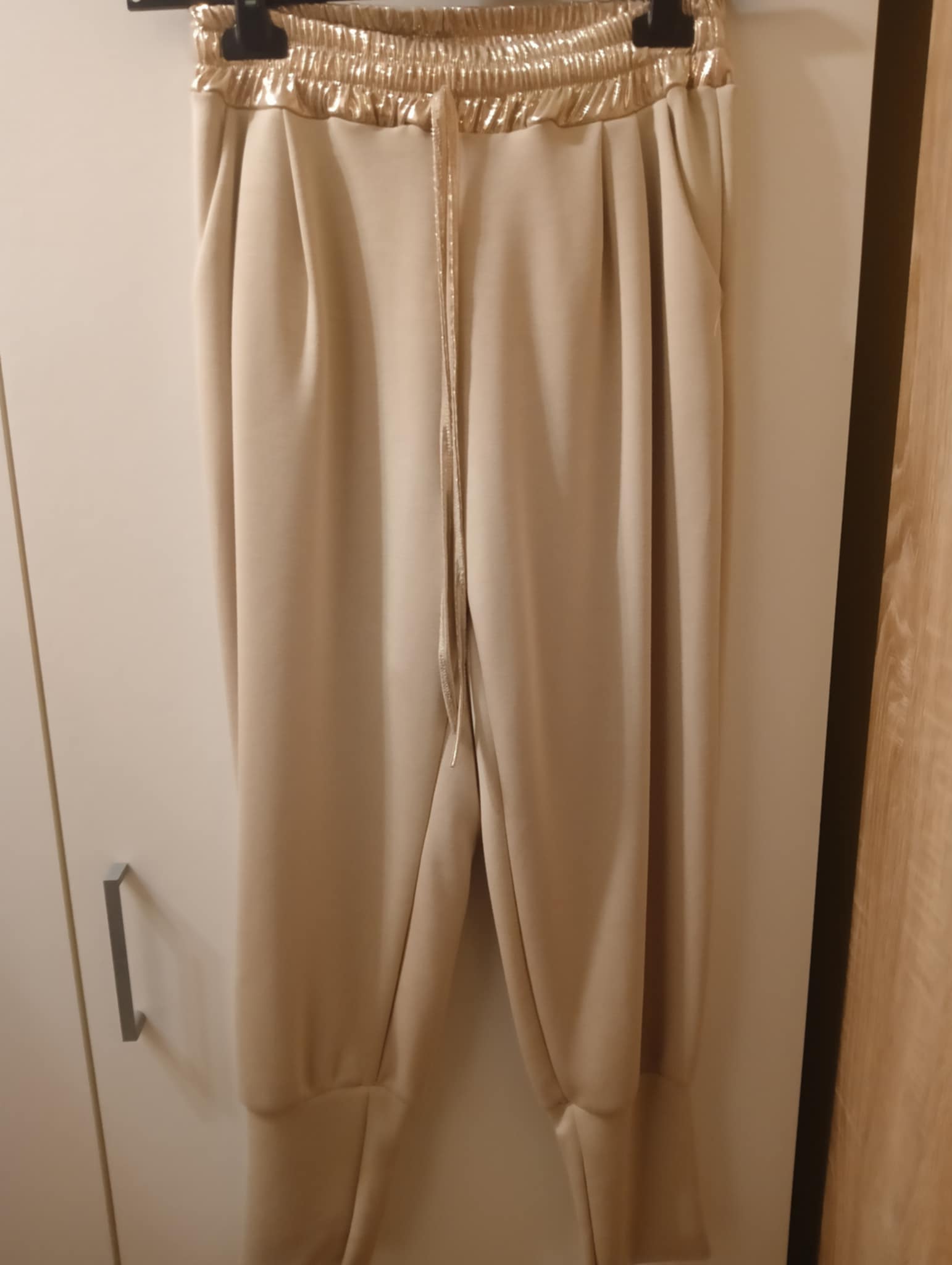 Spodnie ze złotym ściągaczem w pasie , na dole zwężane (dopasowują się do nogi) . 55%poliester i 45% wiskoza.  Rozmiar uniwersalny : Pas 64-100 cm , biodra do 120 cm i długość 92 cm.