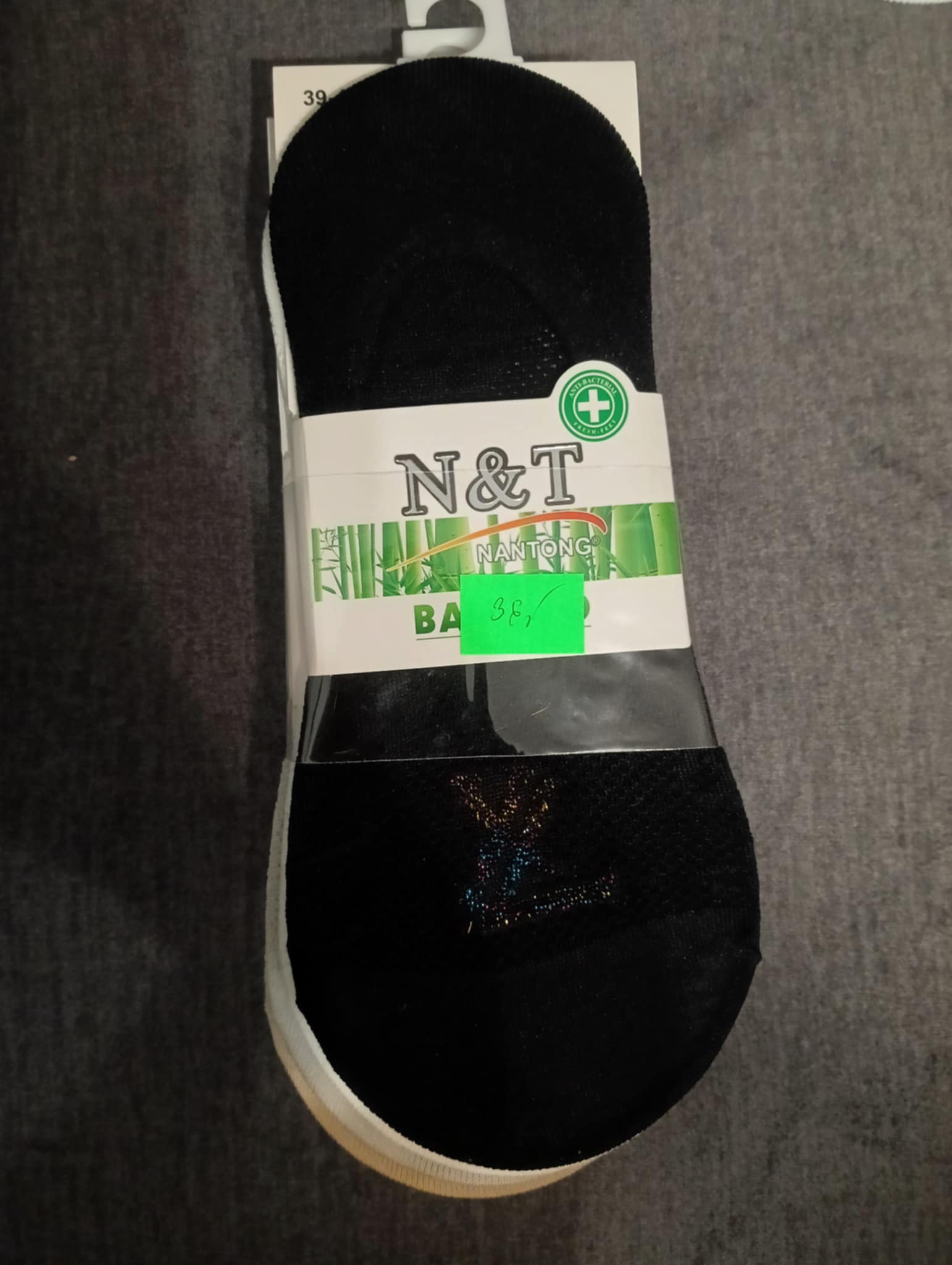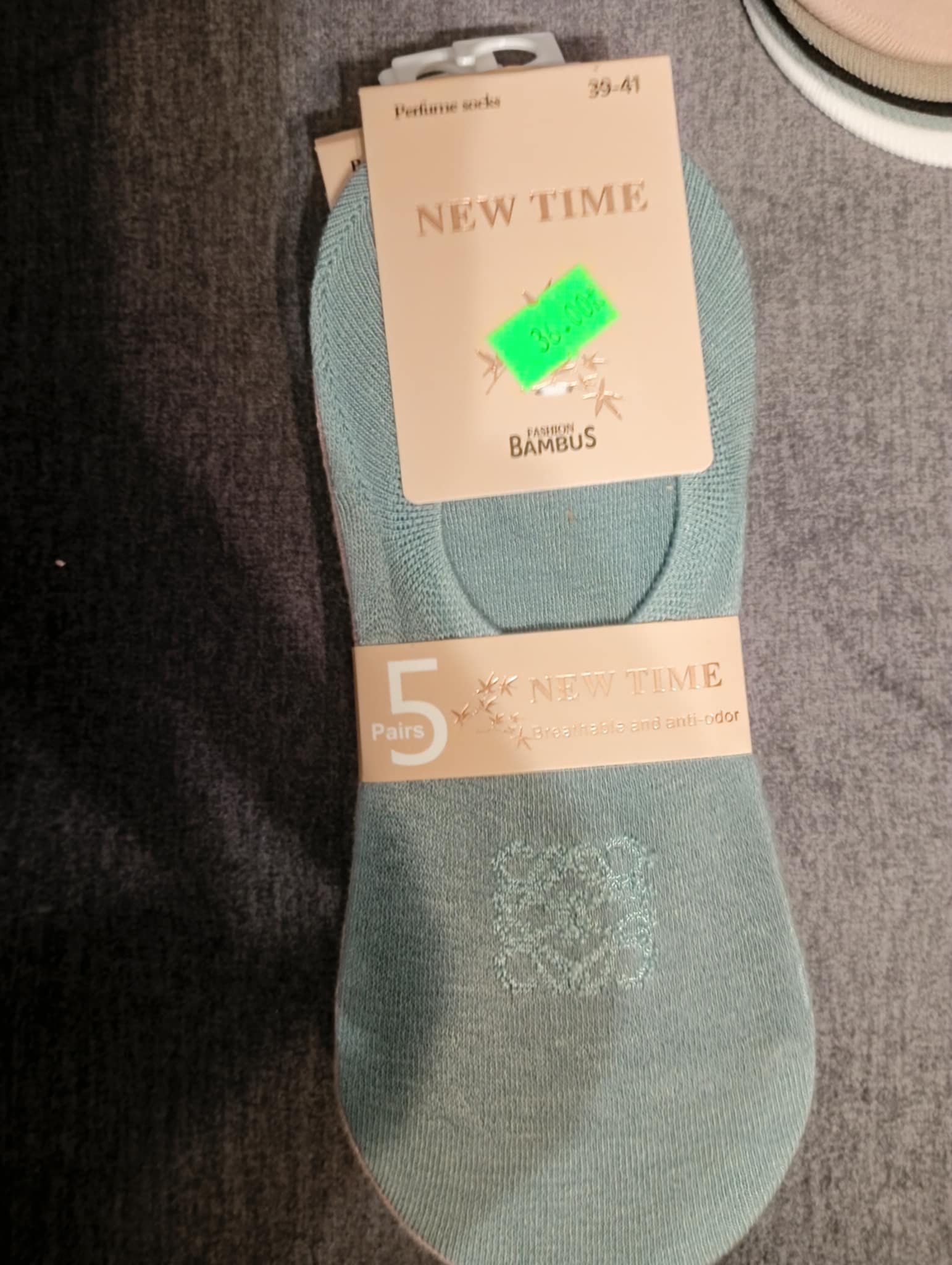 Stopki bambusowe, antypoślizgowe  z delikatnym zdobieniem z przodu . W opakowaniu 5 par. Rozmiar 39-41