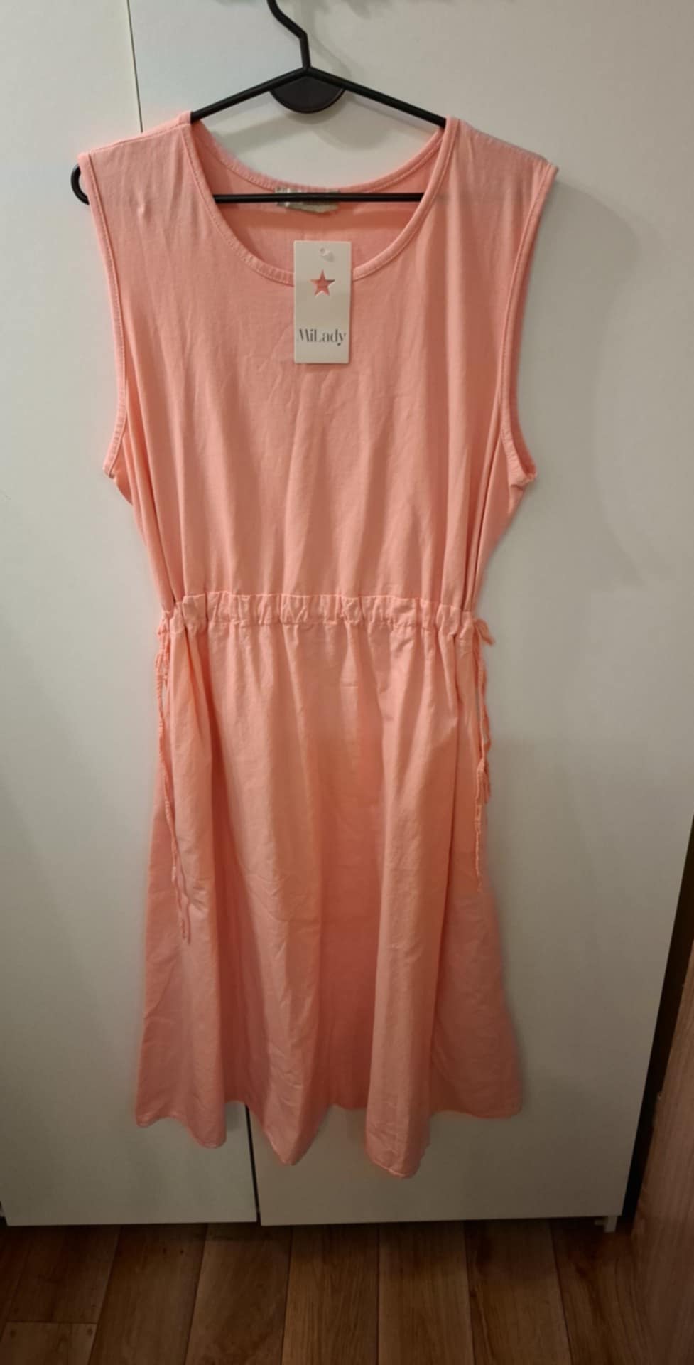Sukienka w kolorze morela , wiązana troczkiem w pasie , kieszenie , Biust 110 cm, pas 110 , długość 120 cm