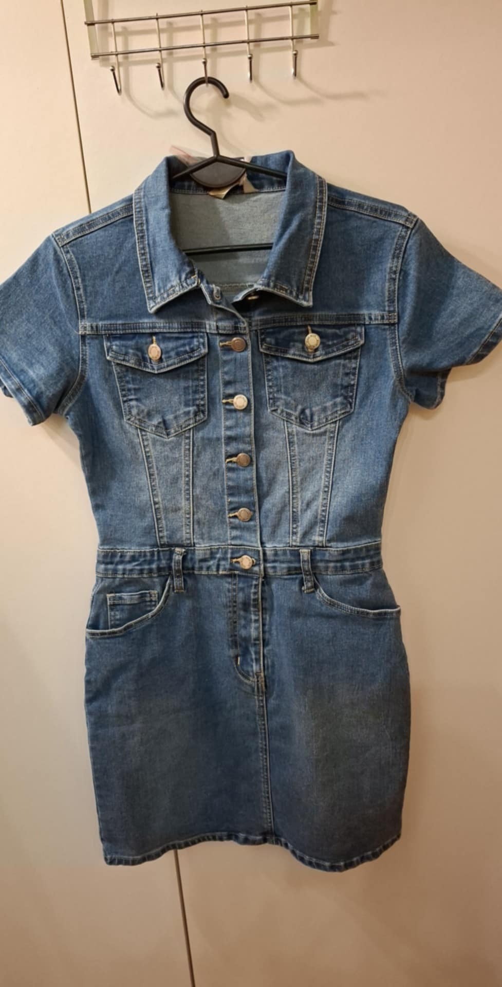 Sukienka jeansowa rozmiar S , góra zapinana na guziki , od pasa zamek , kieszenie z przodu i z tyłu , 70% bawełna, 25% poliester, 5% wiskoza .