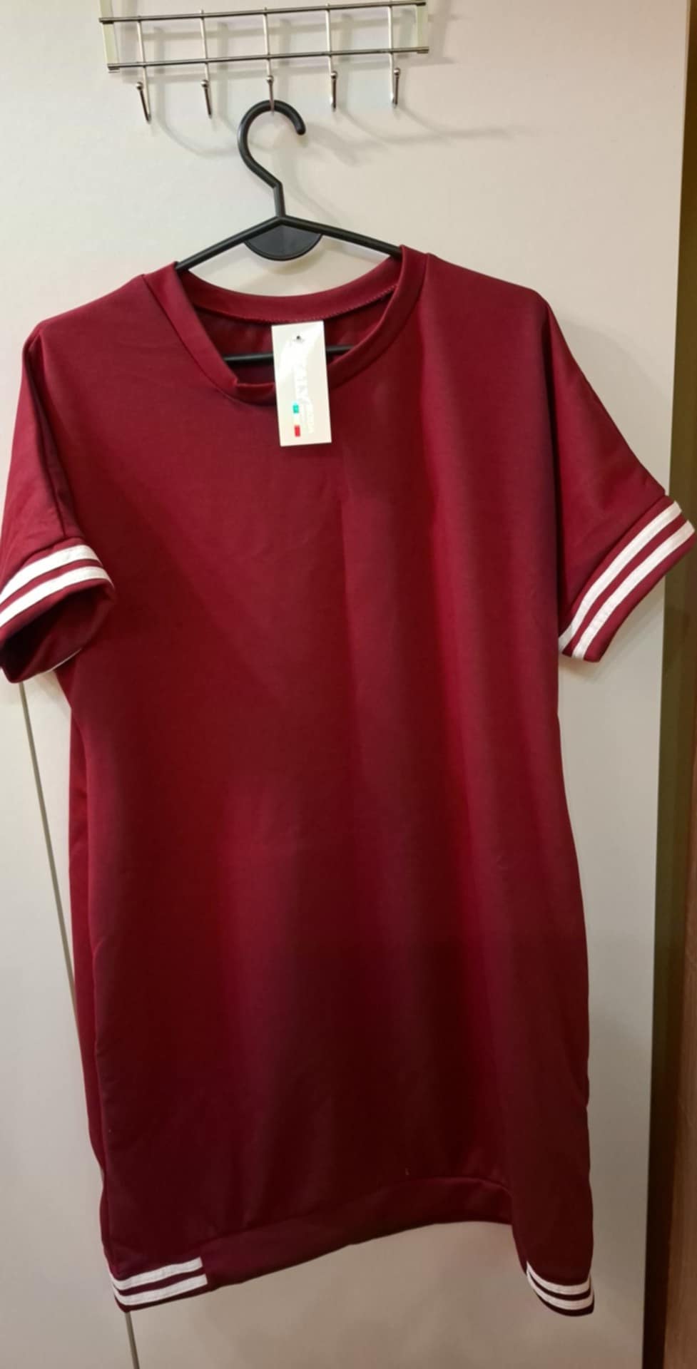 Sukienka w kolorze bordowym z białymi lampasami na rękawkach i na dole . Rozmiar uniwersalny od M do XL , 95% wiskoza, 5 % elastan . Kolekcja włoska .