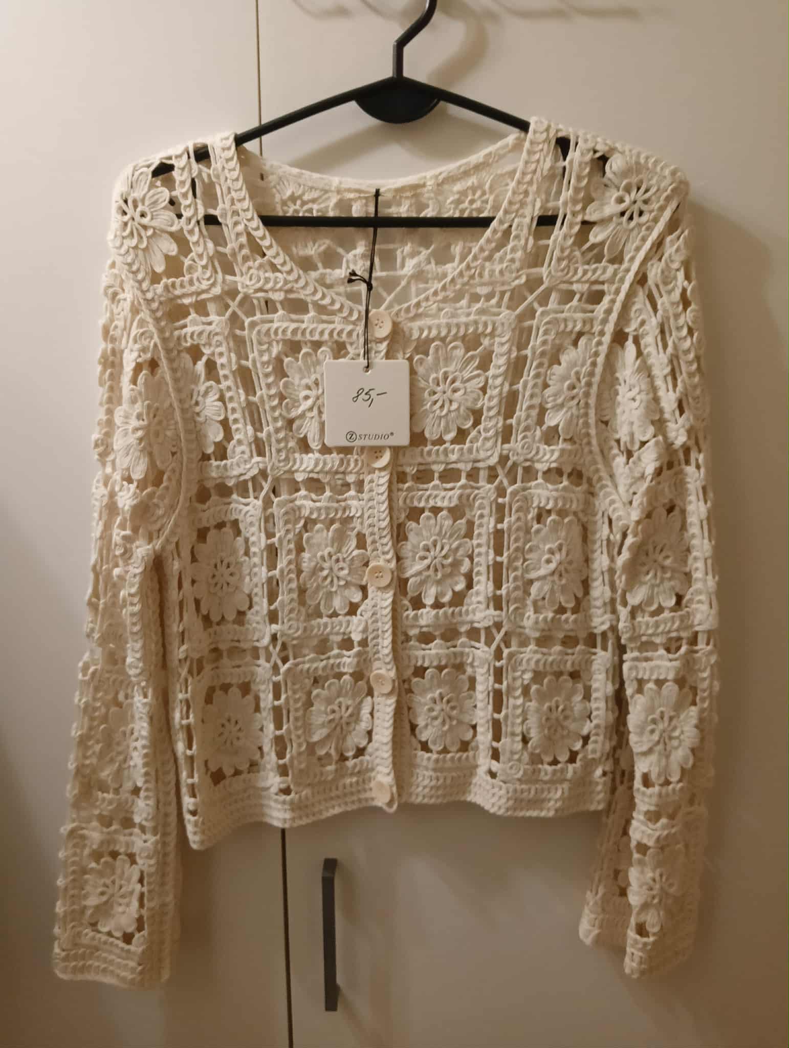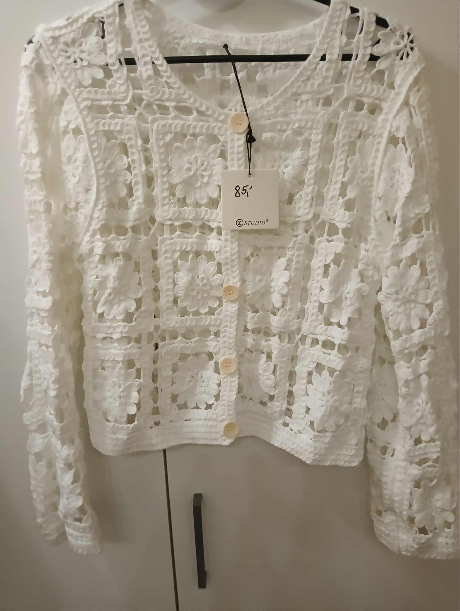 Sweterek ażurowy z długim rękawem, po całości zapinany na guziczki . Rozmiar : biust 100 cm, długość 59 cm