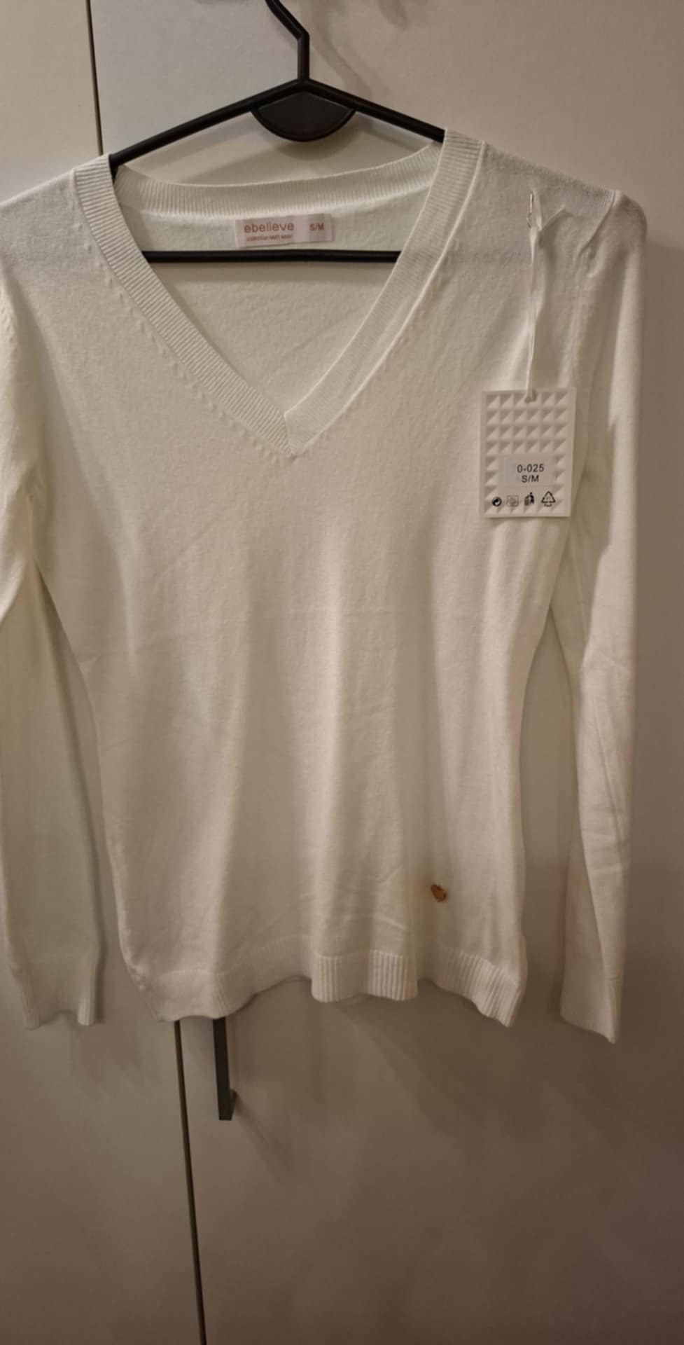 Bluzka w kolorze białym , dekolt w V , na dole małe serduszko , 60% bawełna , 25% kaszmir, 5% wełna , 10% elastan , Rozmiar S/M