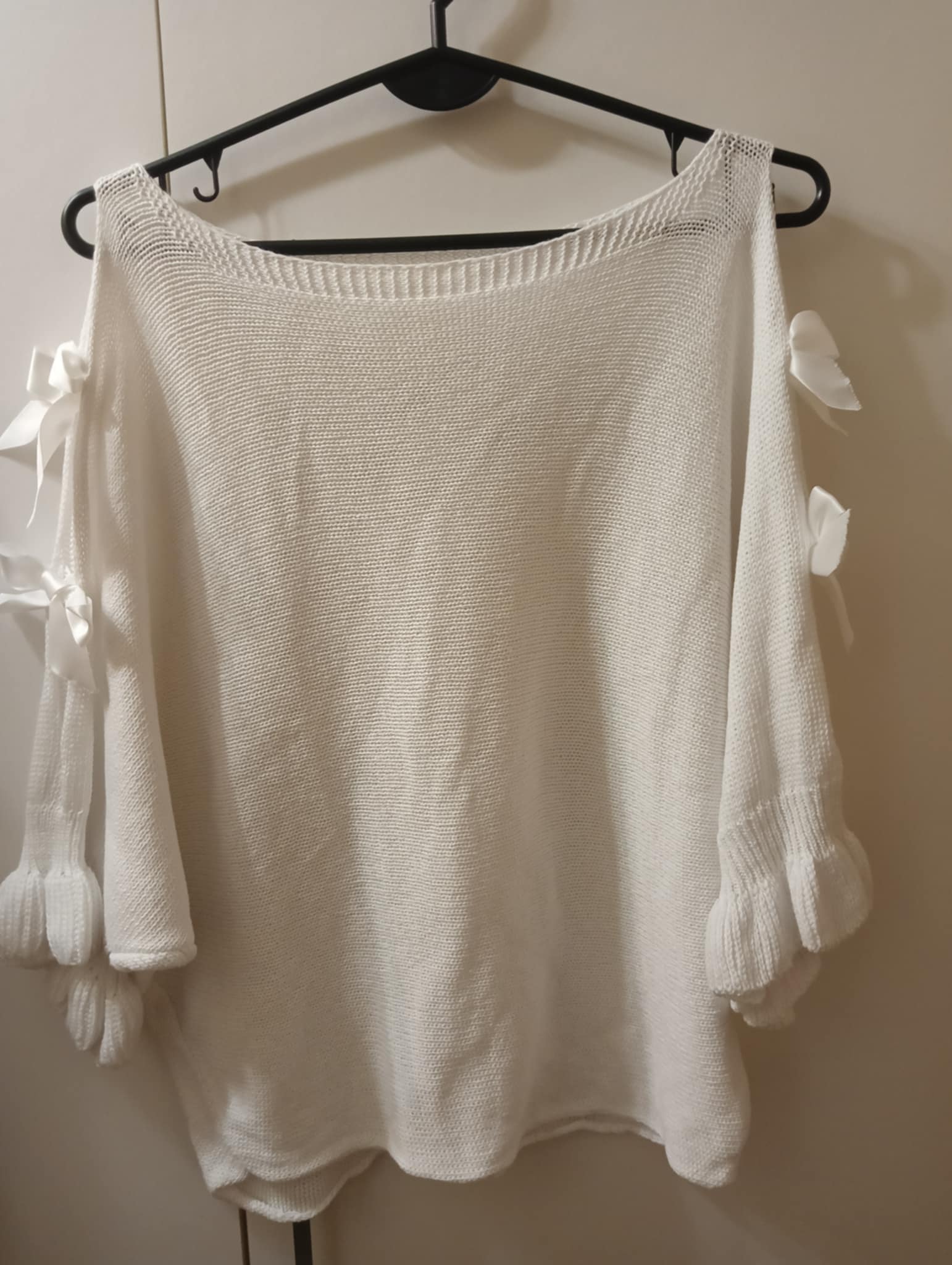 Sweterek 50% akryl i 50% bawełna . Otwarte dziurki na rękawach z kokardką , wykończone falbanką . Góra sweterka w kształcie nietoperka . Rozmiar uniwersalny od S do XL – biust do 110 cm , długość 58