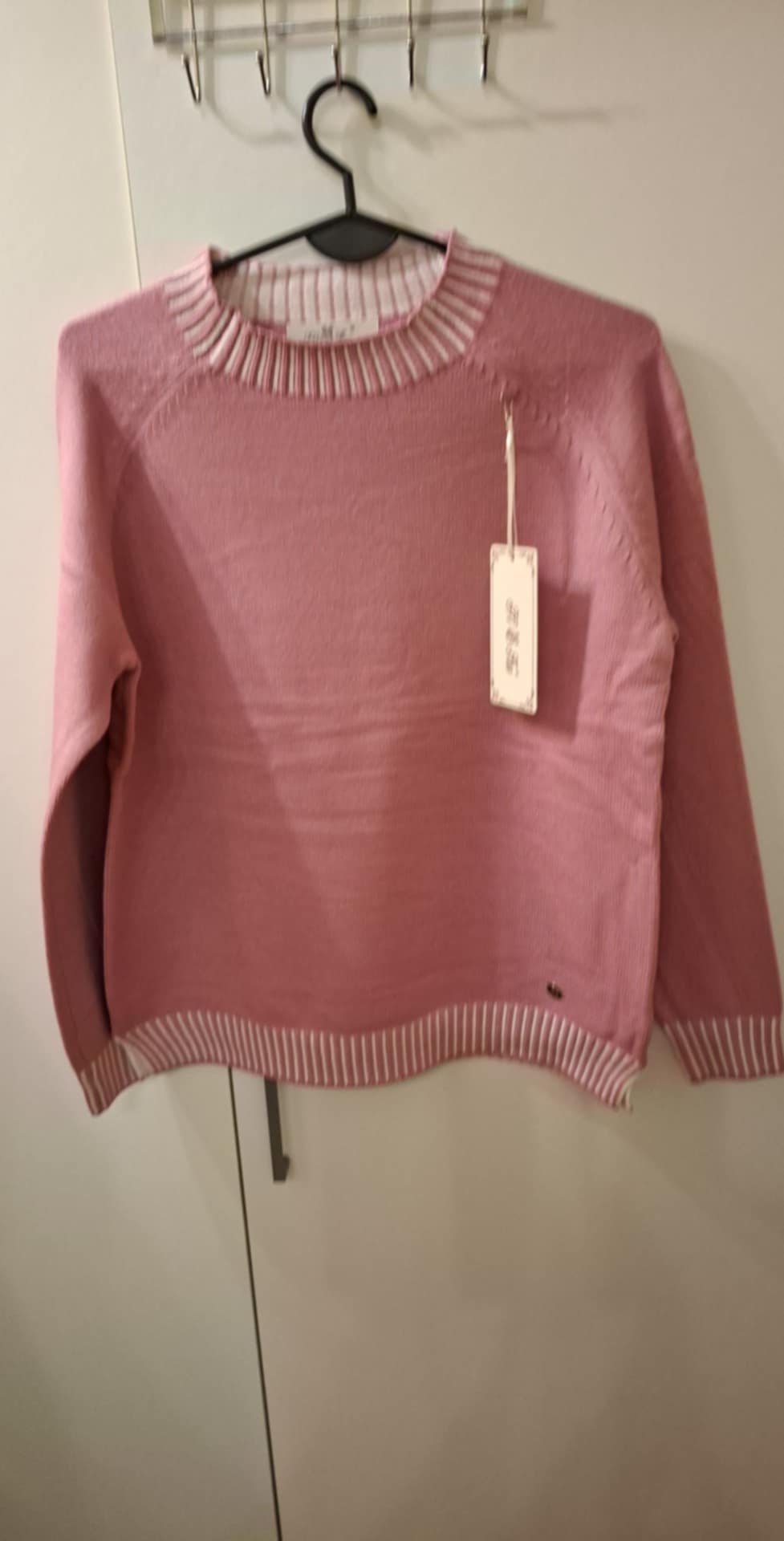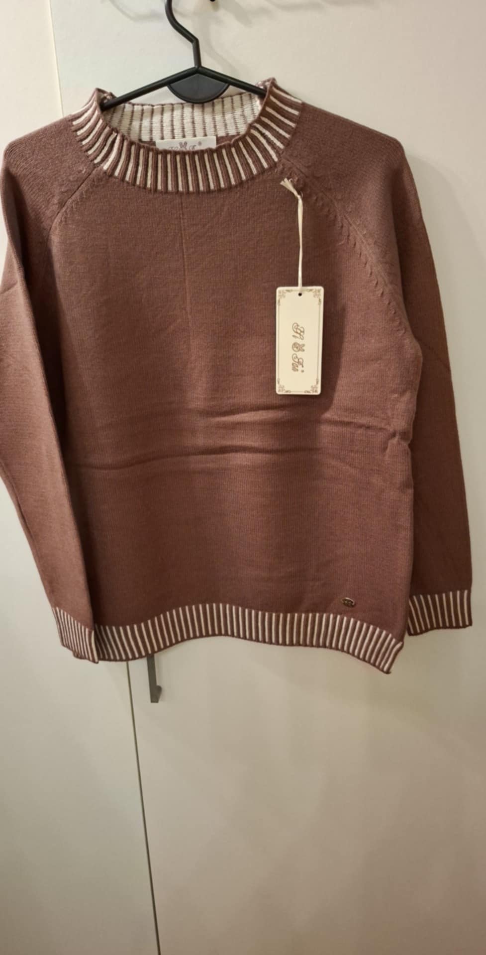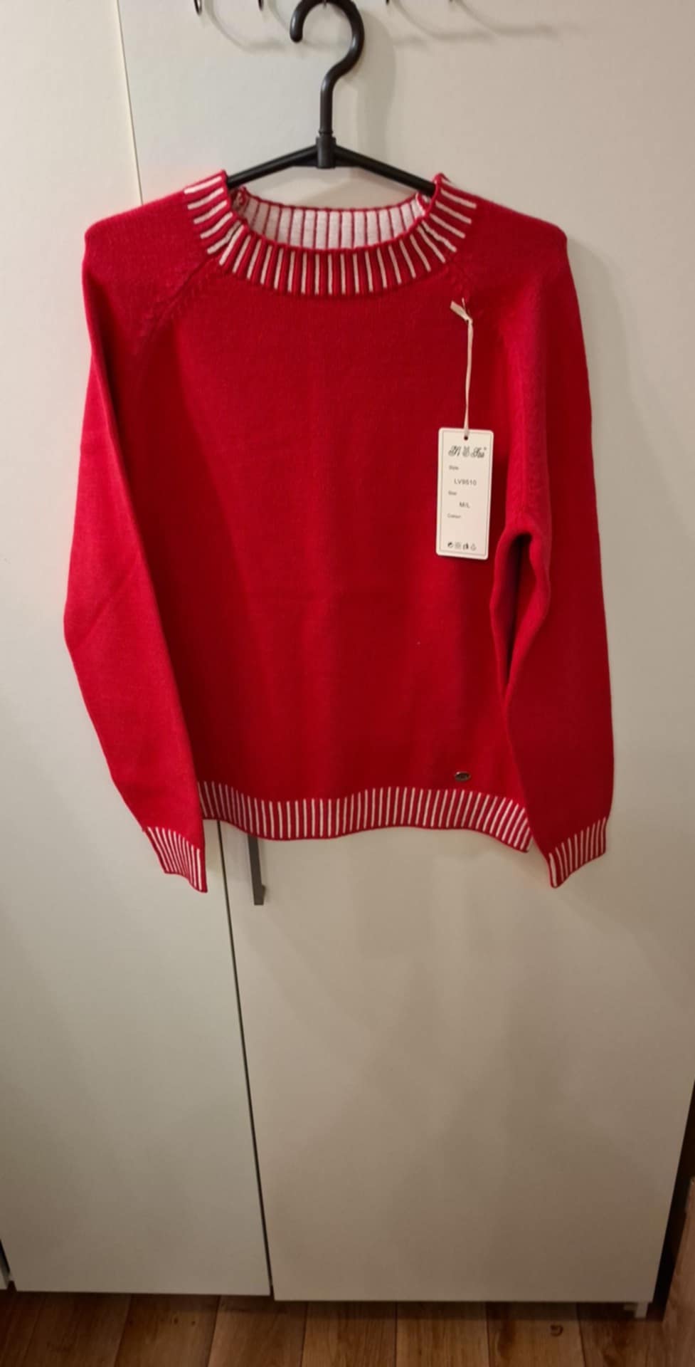 Sweterek grubszy, mięsisty, miękki . Góra na stójce w paseczki , wstawka na ściągaczu rękaw , dół zakończony ściągaczem również w paseczki , rozcinany po bokach. Bawełna 60% , Kaszmir 25% , Wełna 5%, Elastan 10%