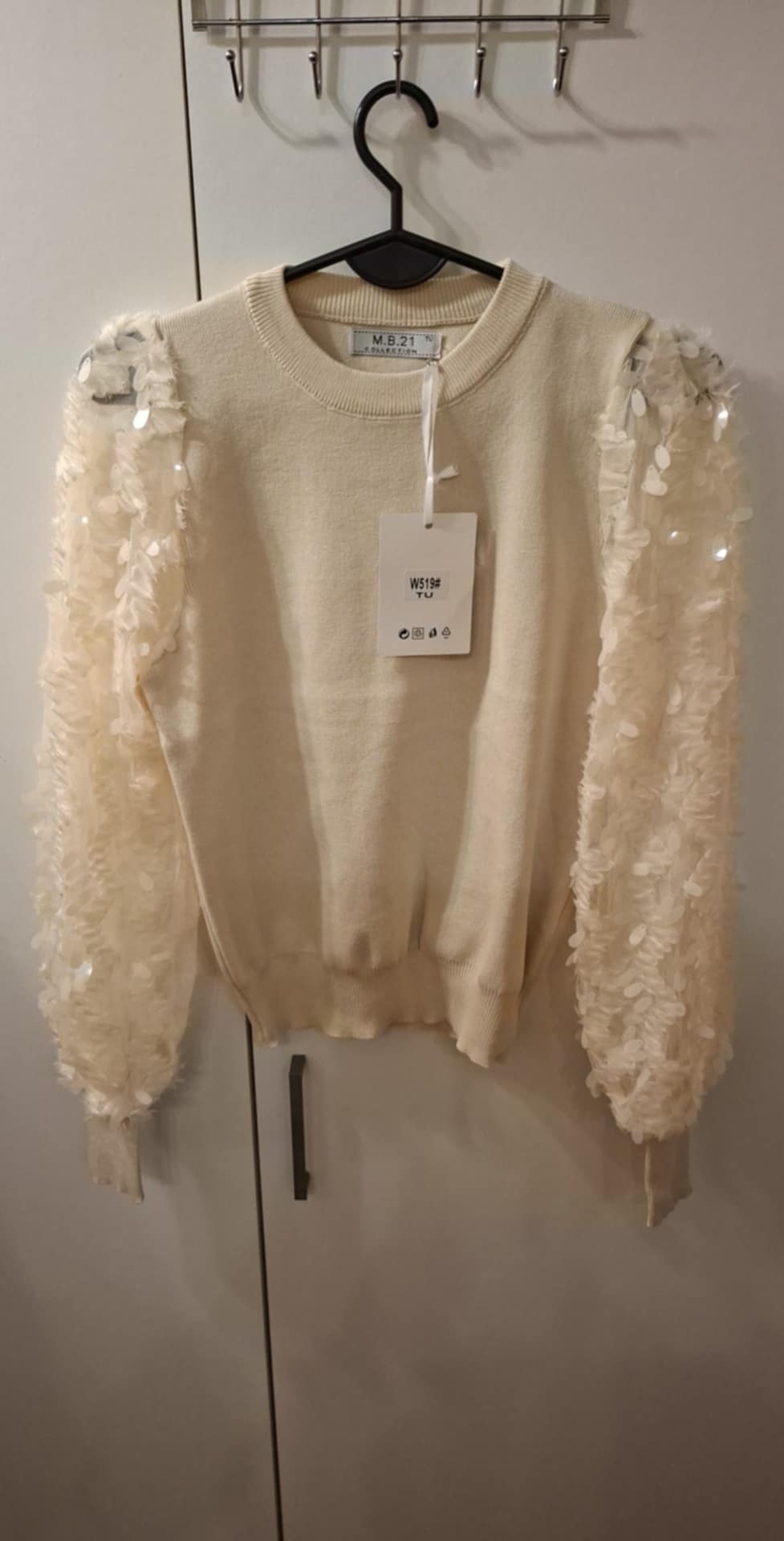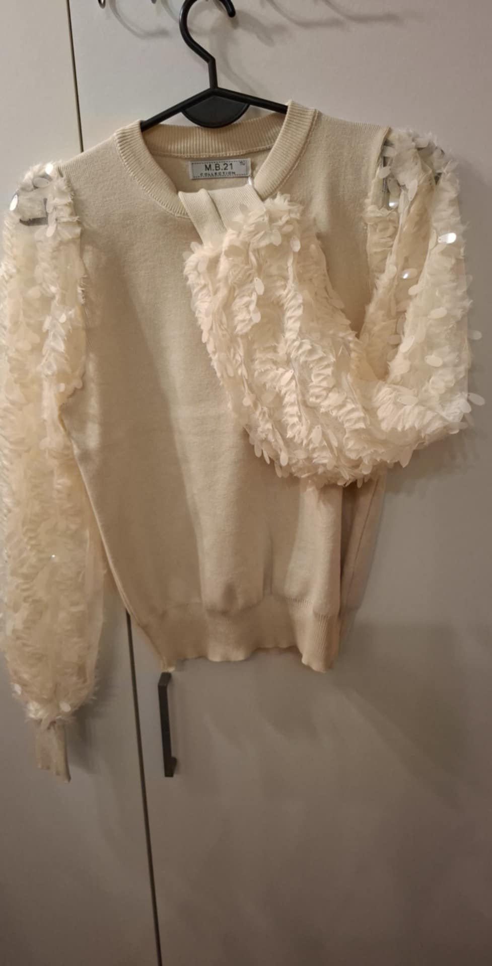 Sweterek w kolorze beż , prosty, klasyczny ,ściągacz na dole 7 cm ,  ozdobny rękaw zakończony ściągaczem 12 cm , 68% wiskoza, 32% poliester, Rozmiar S/M ( biust 86-96 cm , długość 56 cm) Kolekcja Włochy.