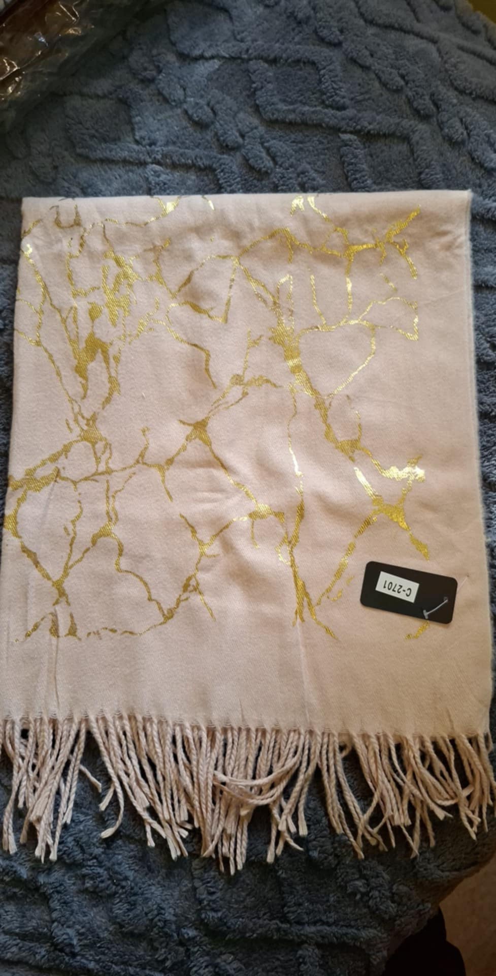 Szal w kolorze beżowym z dodatkami złota , zakończony frędzlami , 50% bawełna, 50% wiskoza.