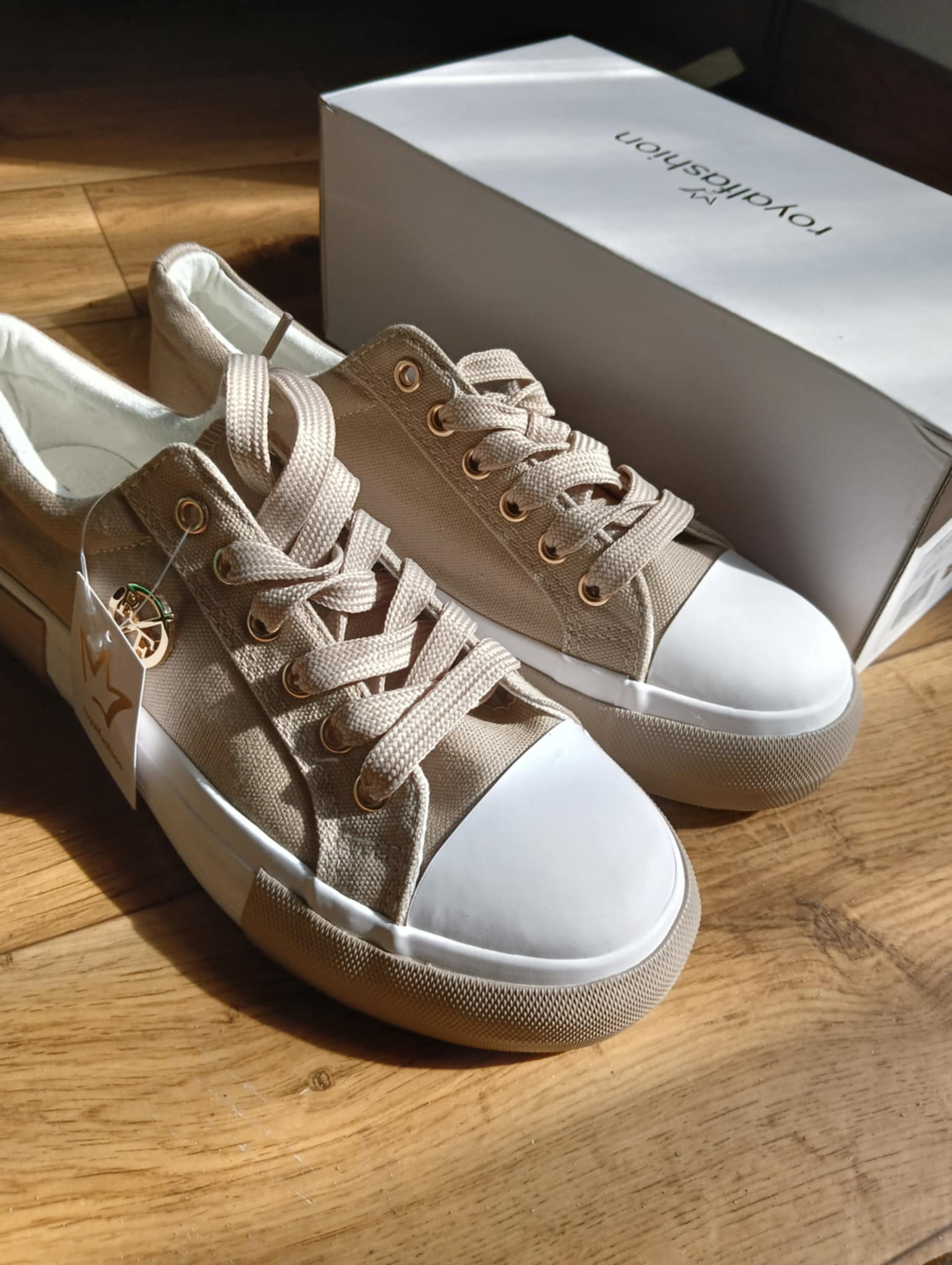 Trampki w kolorze beżowy z odcieniem szarości , złoty znaczek, gruba podeszwa .