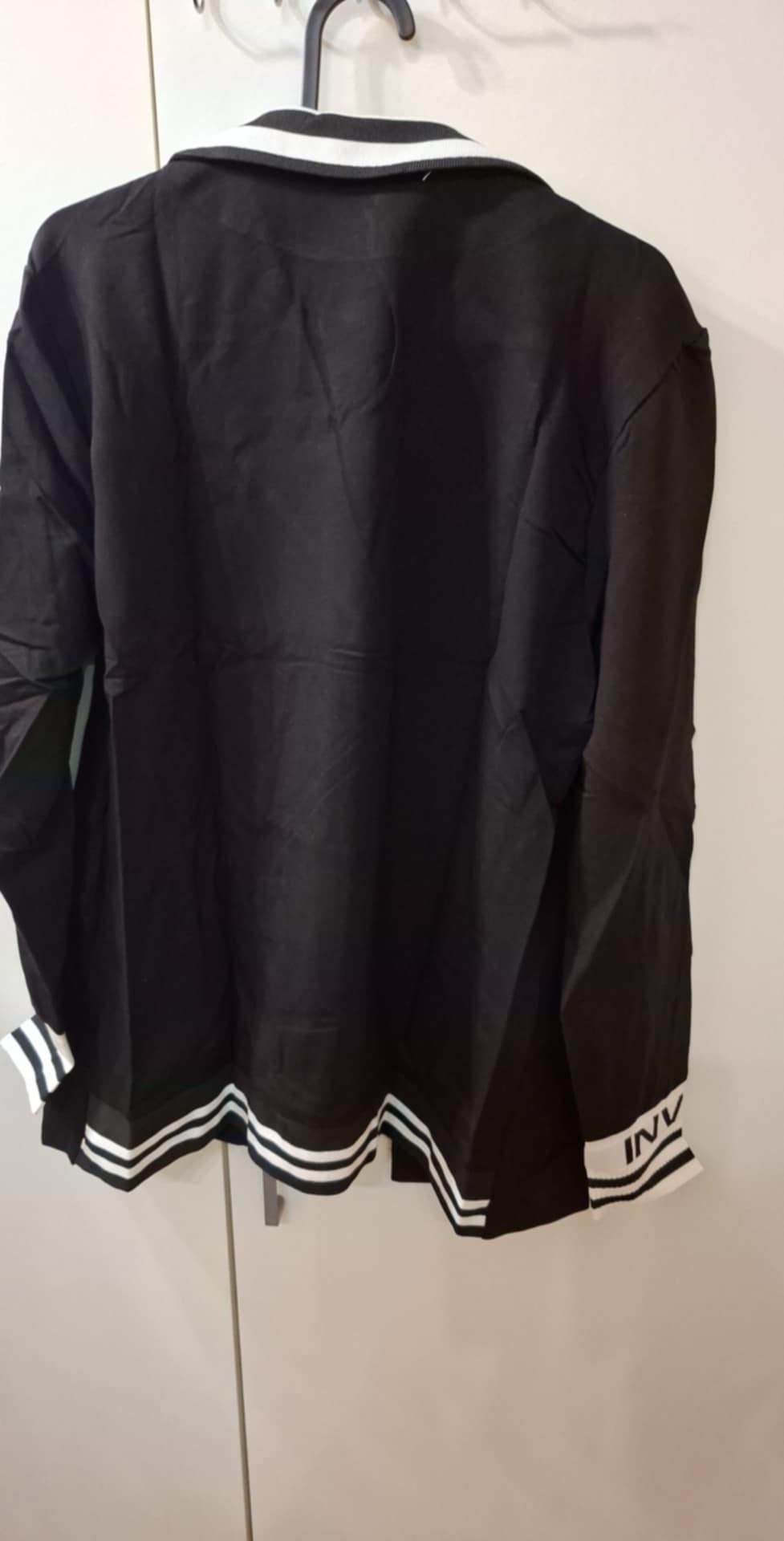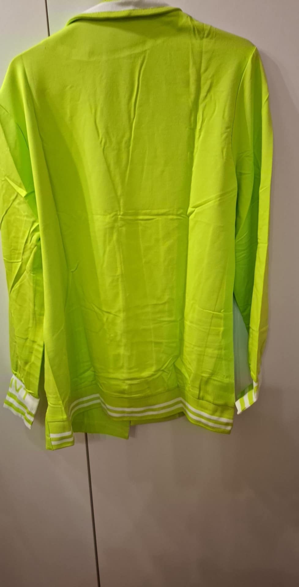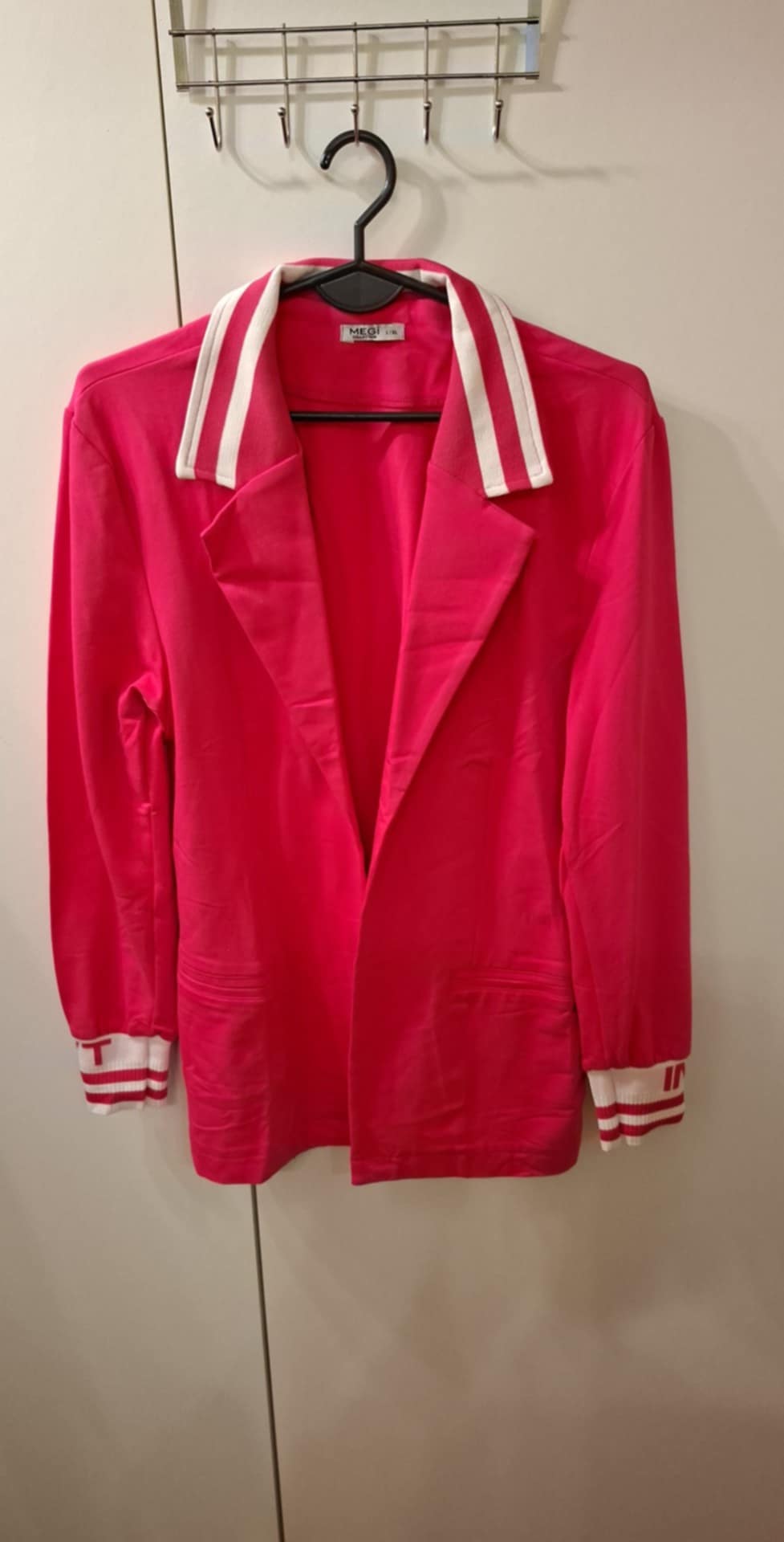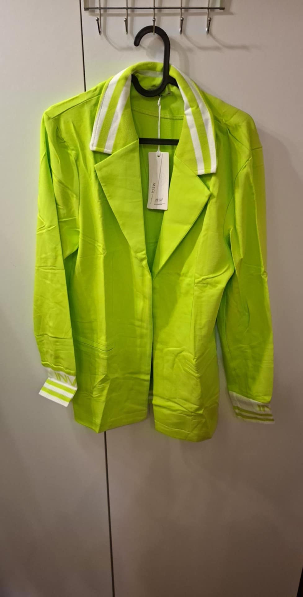 Żakiet z lampasami , nie zapinany , luźny , ściągacz na rękawie oraz z tyłu , 96% bawełna , 4% elastan .