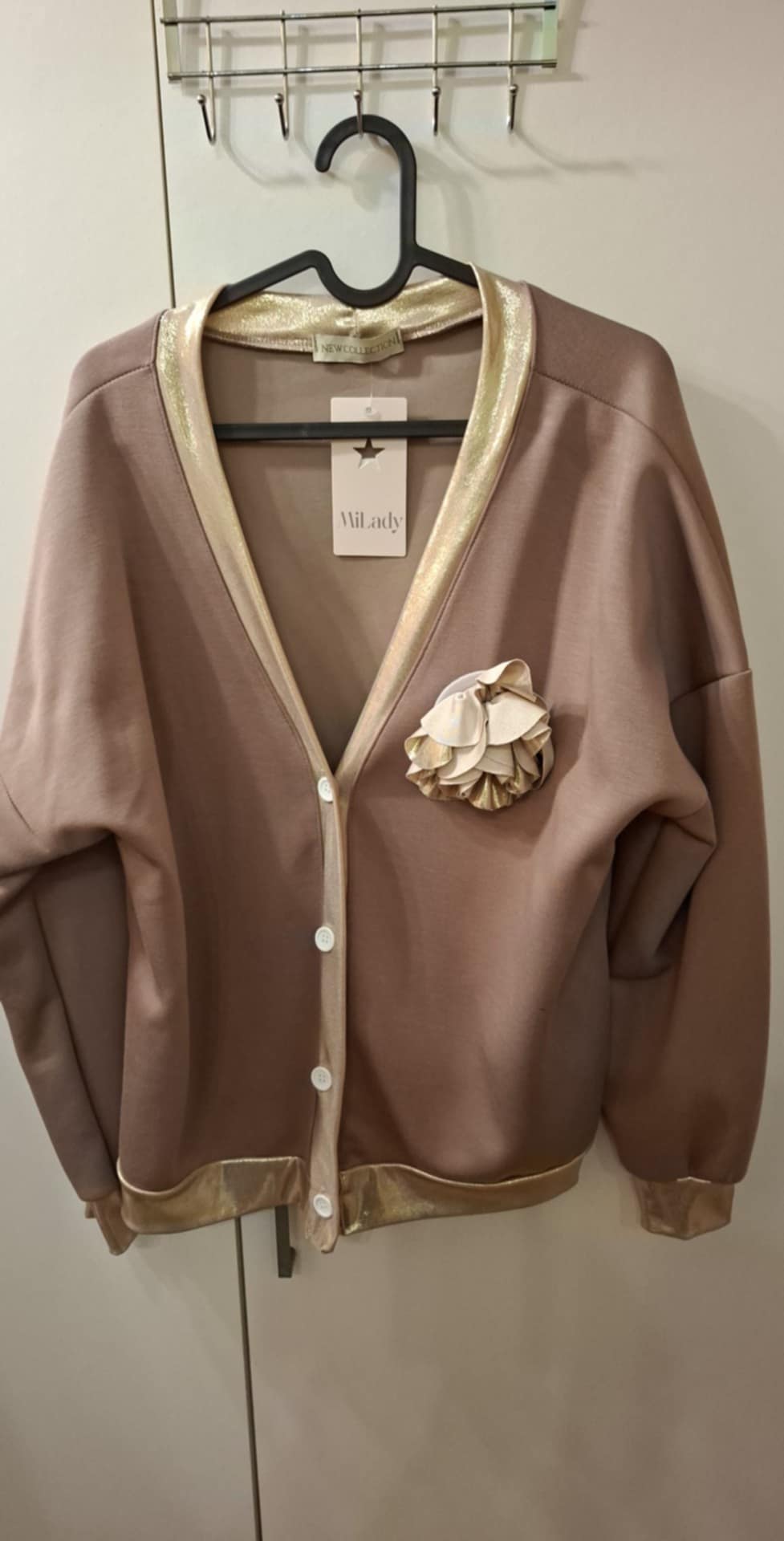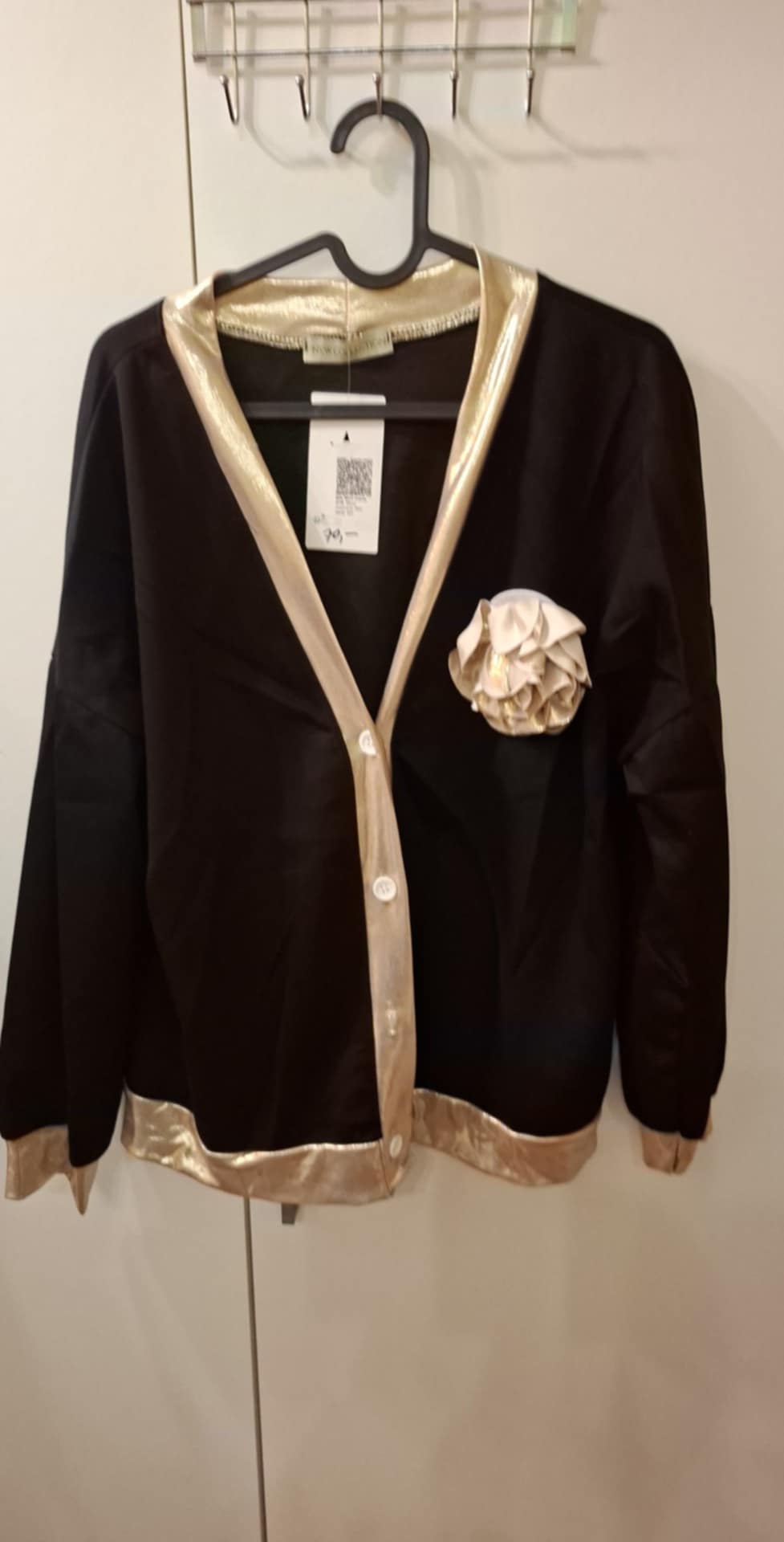 Żakiet/bluza rozpinana po całości na guziki , lampas złoty po całości zapięcia i na rękawach, dopinany kwiat róża złota ( można odpinać) . Materiał tzw.masełko ( 50% poliester, 45% wiskoza, 5% elastan) .